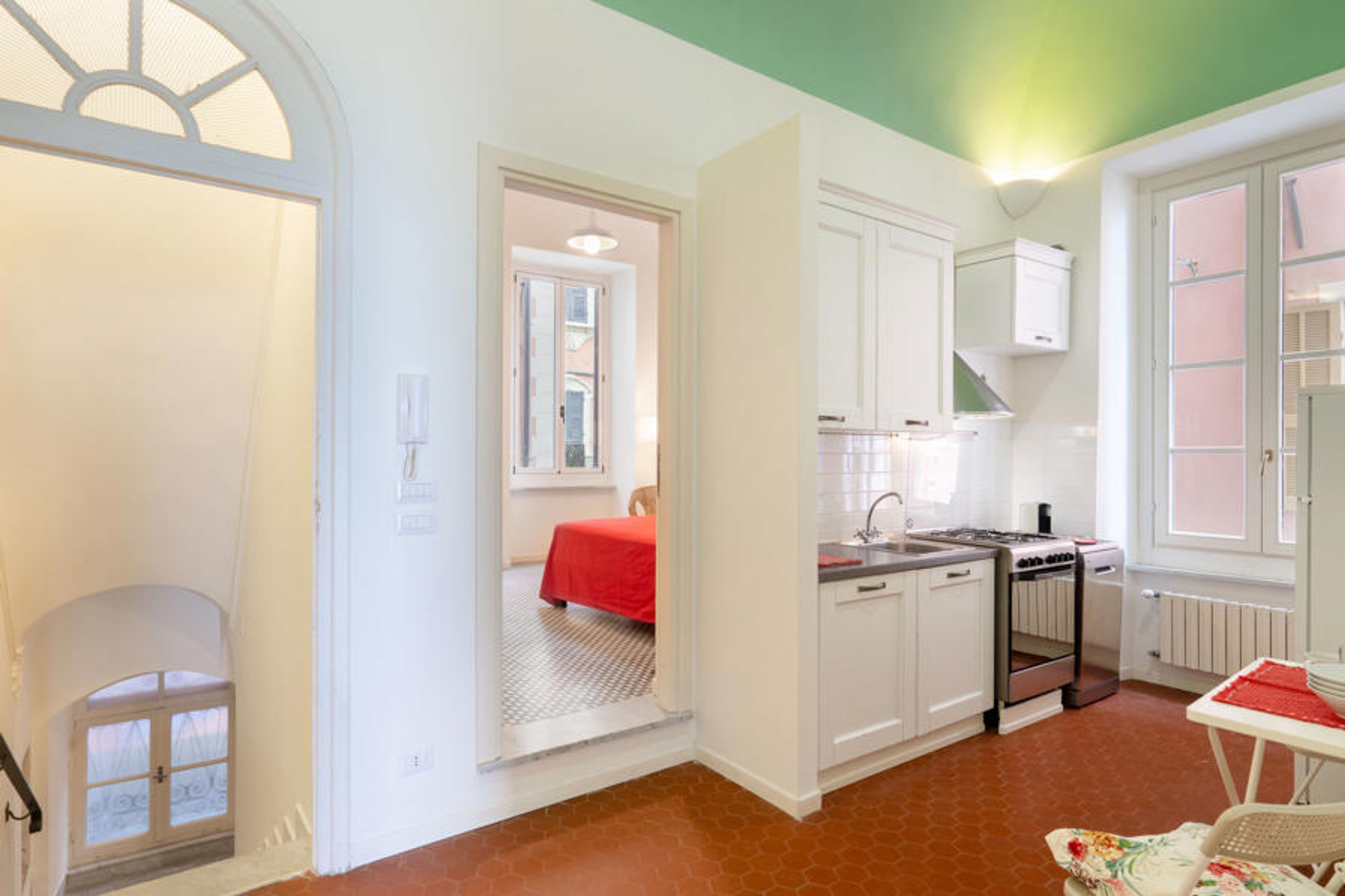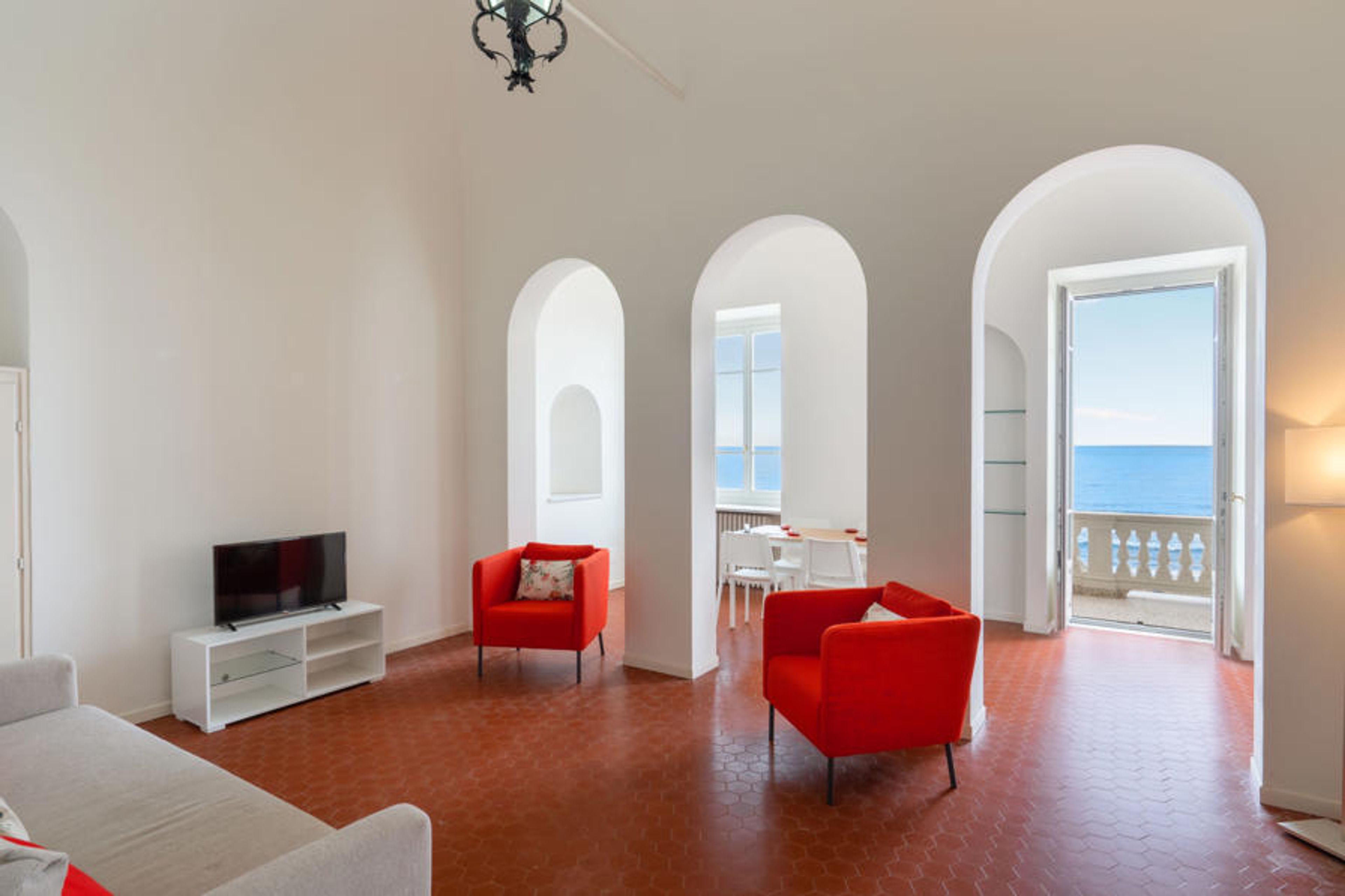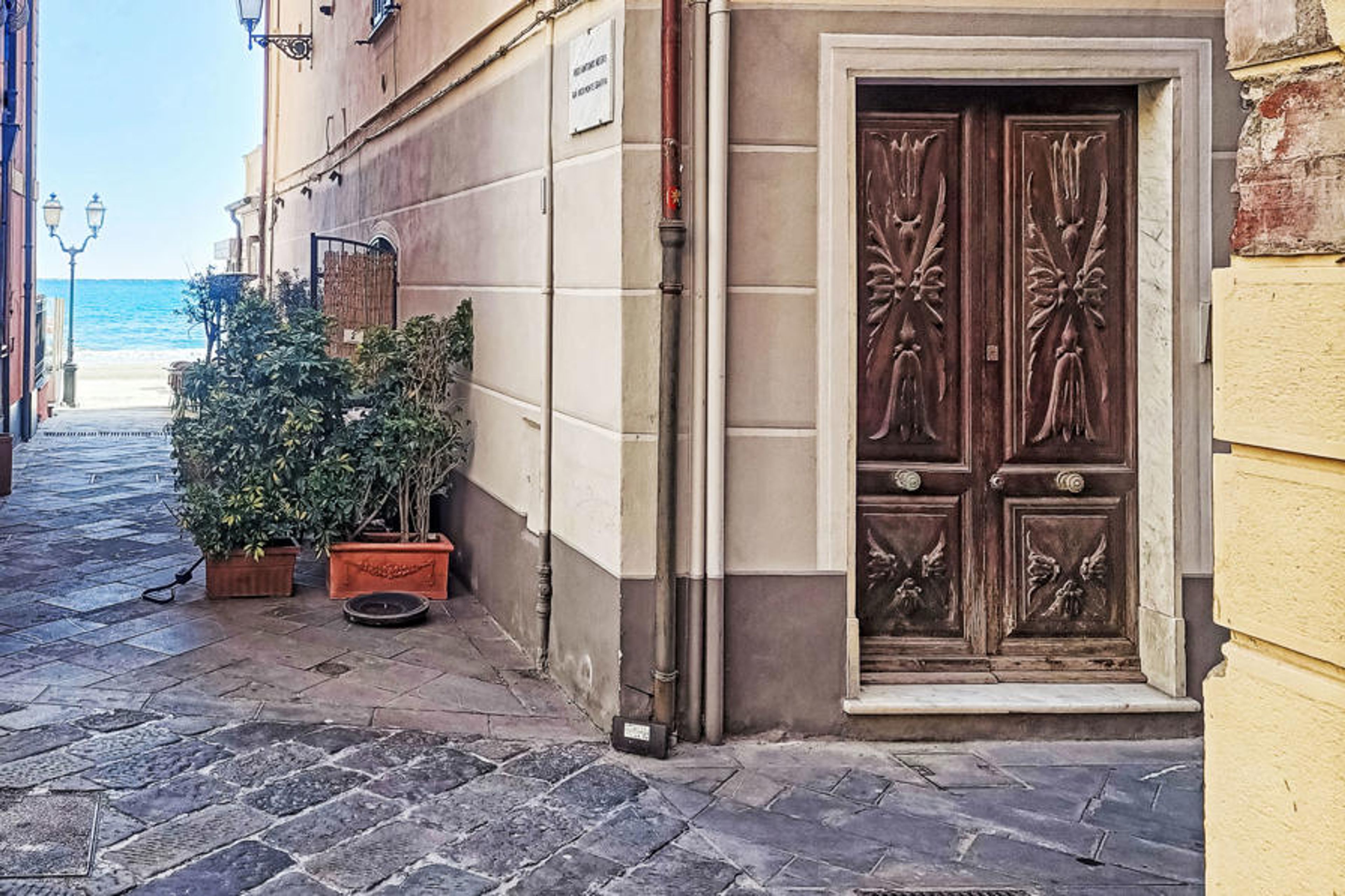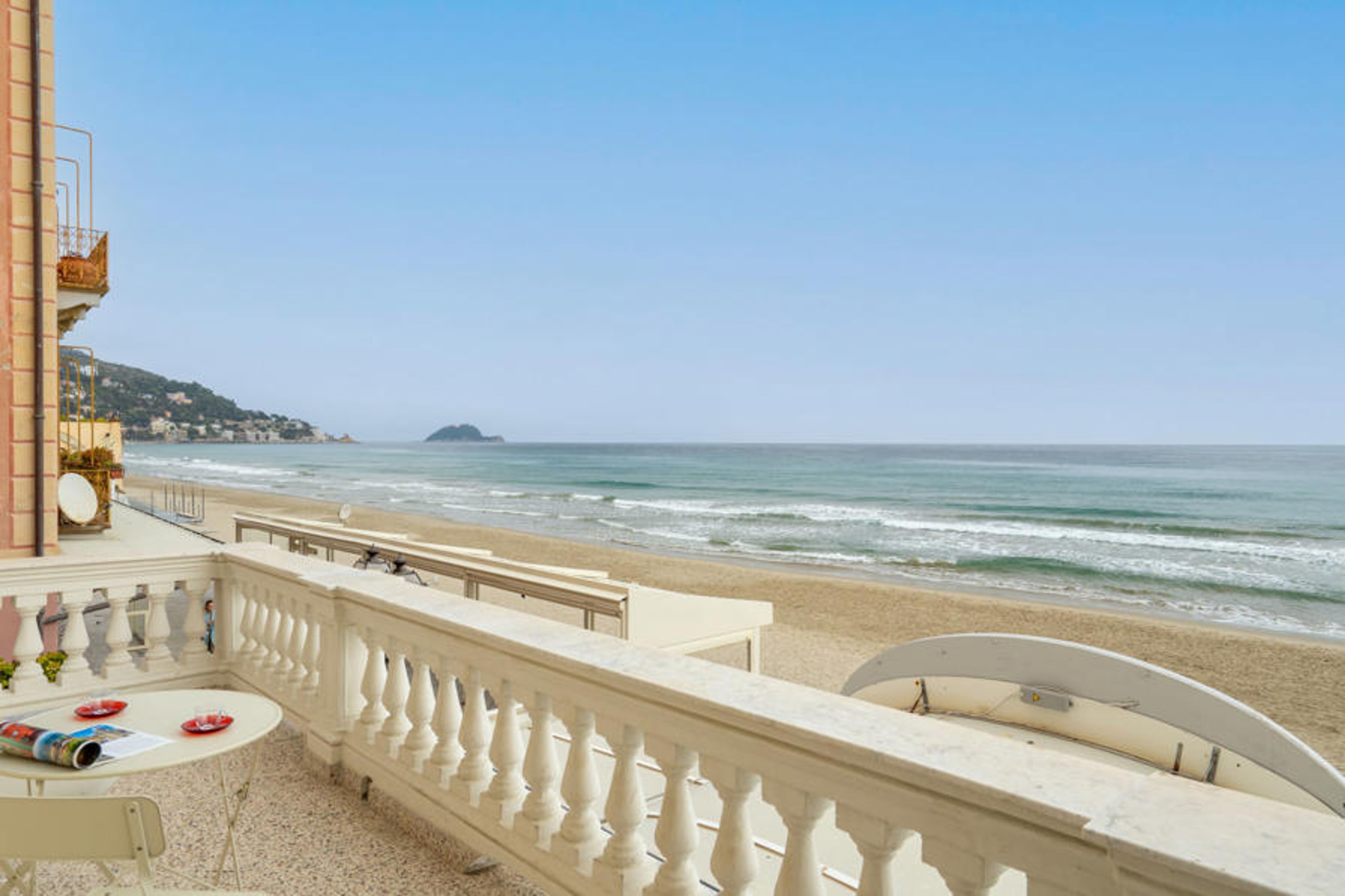 Alassio: Very comfortable, historical residence "Beach House", 3 storeys. 3 houses in the residence. In the centre of Alassio 5 km from the centre of Albenga, 15 km from the centre of Diano Marina, 8 km from the centre of Albenga, 50 m from the sea, direct access to the beach. 150 m footpath to the house. Public parking on the road. Grocery 200 m, supermarket 500 m, restaurant, bar 100 m, bakery 100 m, bus stop 200 m, railway station "Alassio" 400 m, sandy beach 50 m. Nearby attractions: muretto Alassio 400 m, isola Gallinara, Giardini villa Pergola 1 km. Please note: no lift. The owner does not accept any youth groups.
