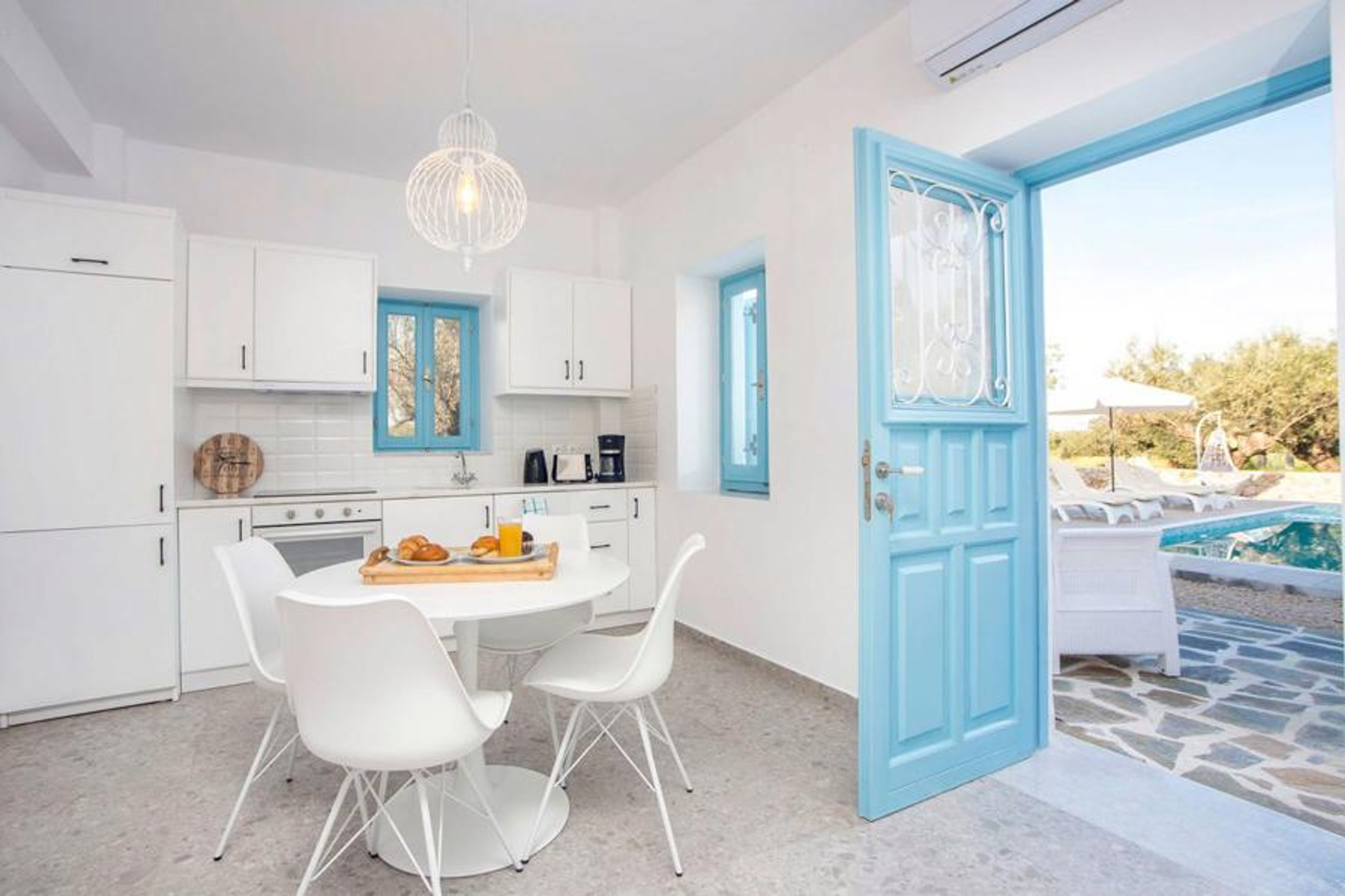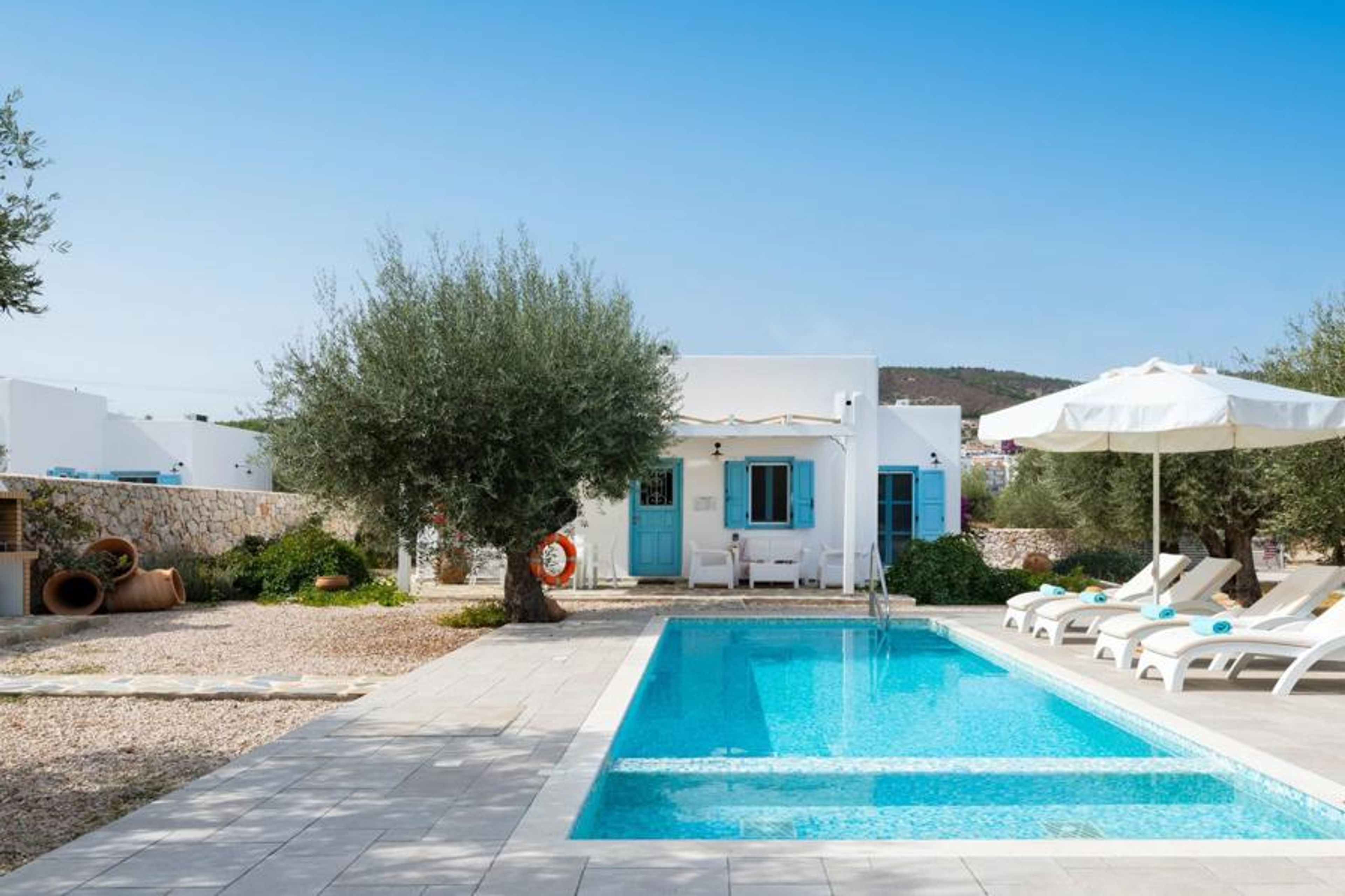 Kalathos Aspro has a swimming pool on the outdoor terrace, with four sun loungers lined up poolside. There are intimate dining and seating areas on the paved space just outside the house, along with a large barbecue.