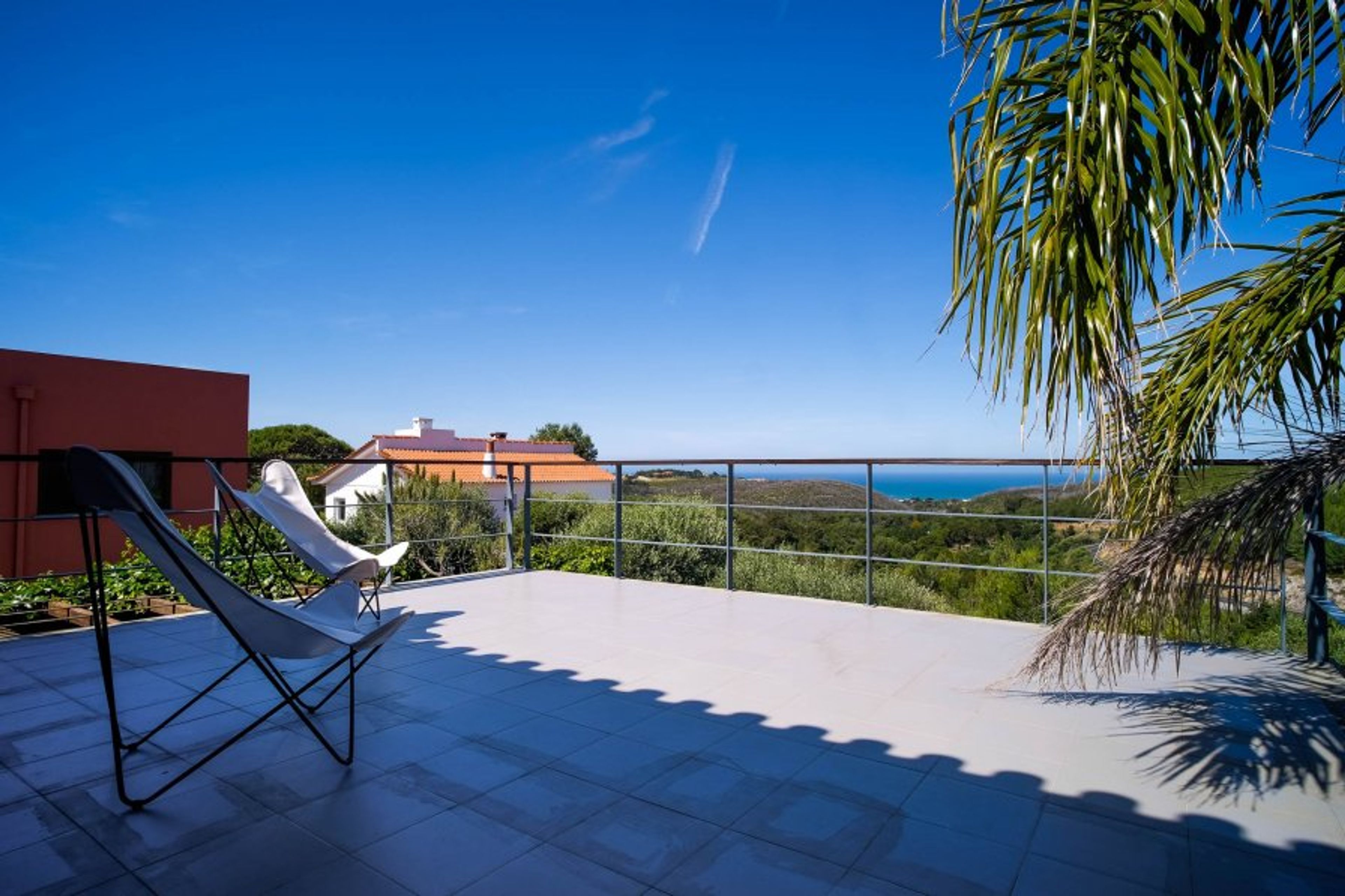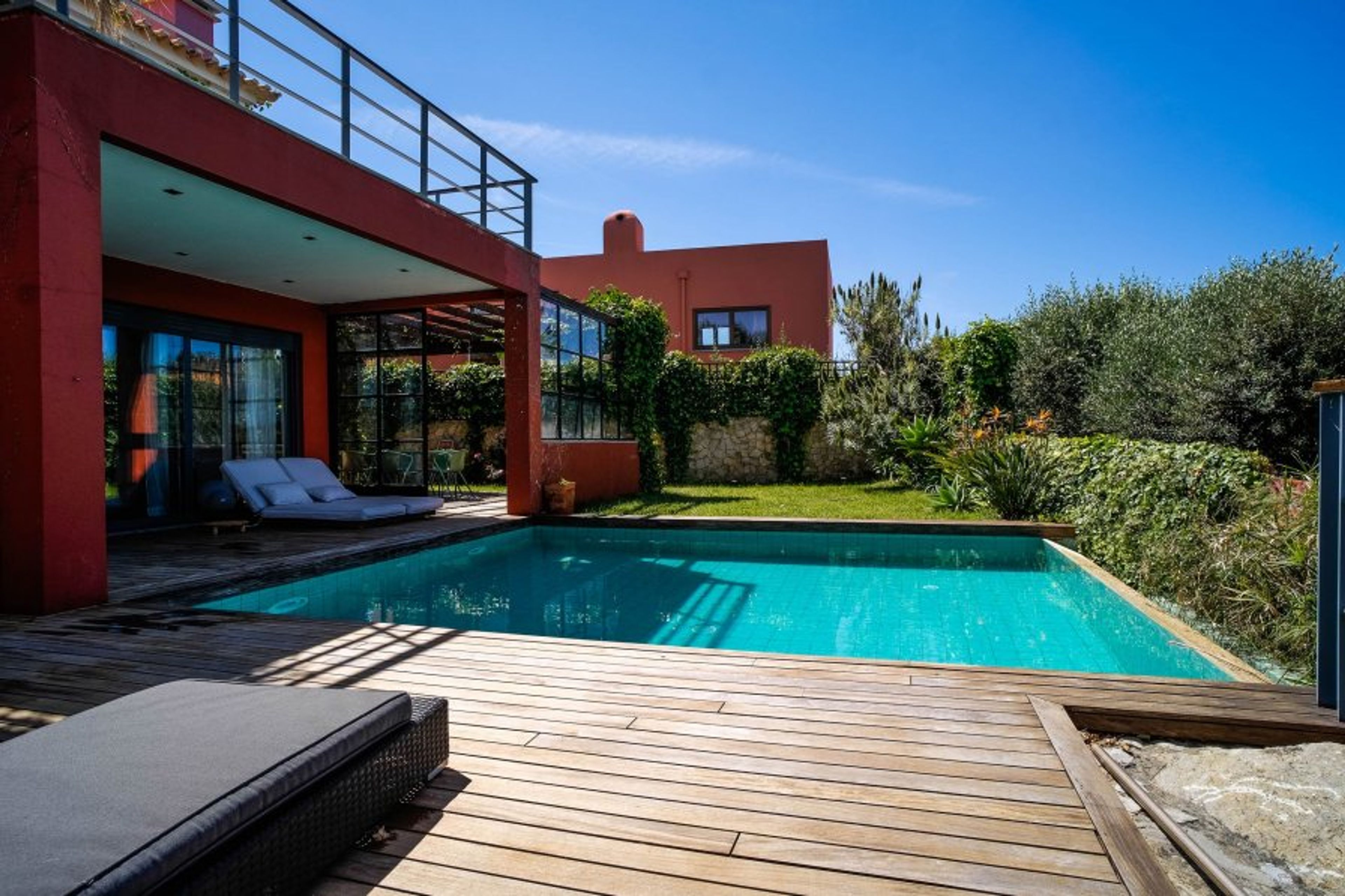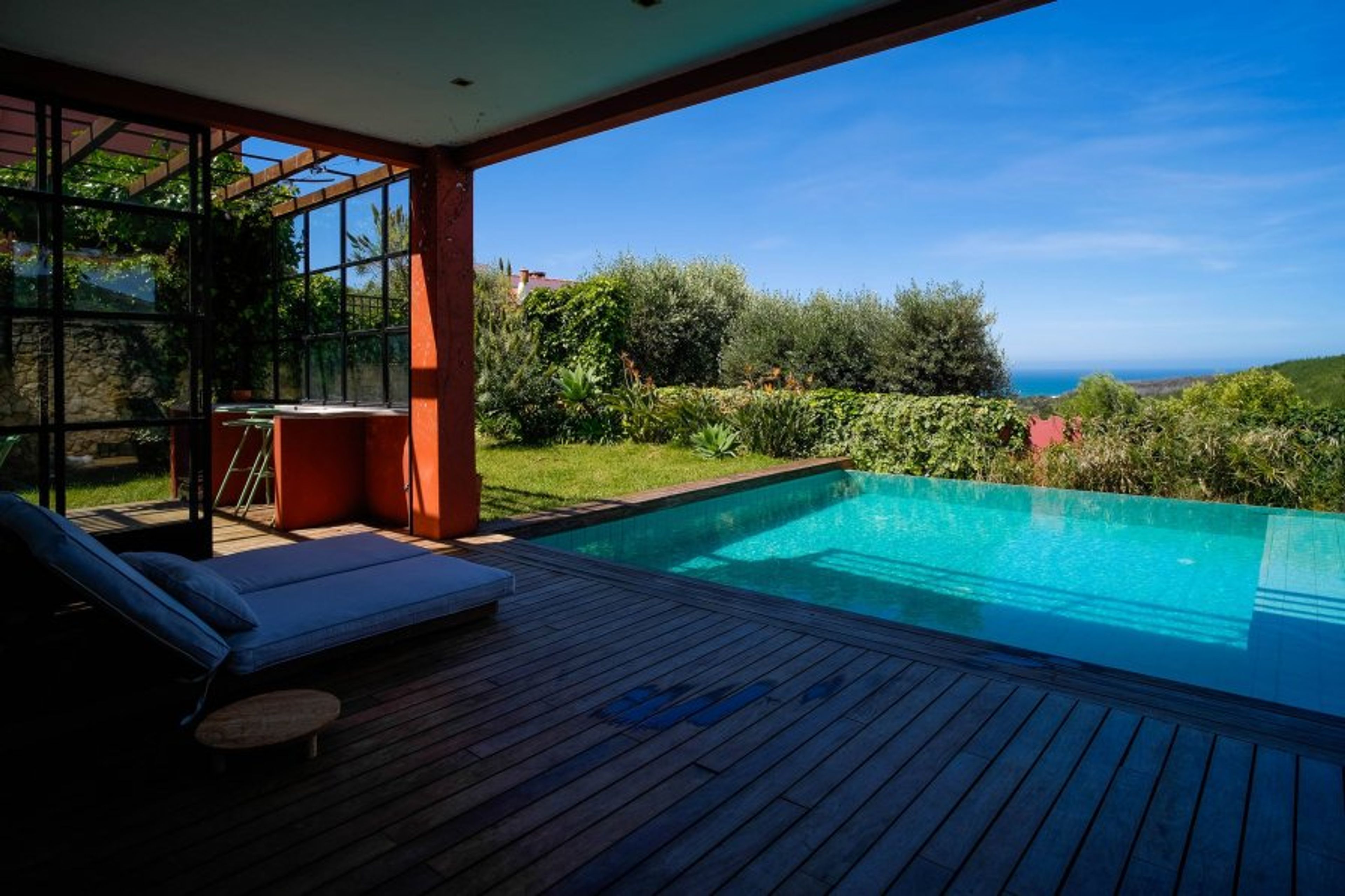 Modern living room opening onto a decked terrace and a 5mx5m pool with stunning views of the Ocean and Sintra Cascais Nature Park.