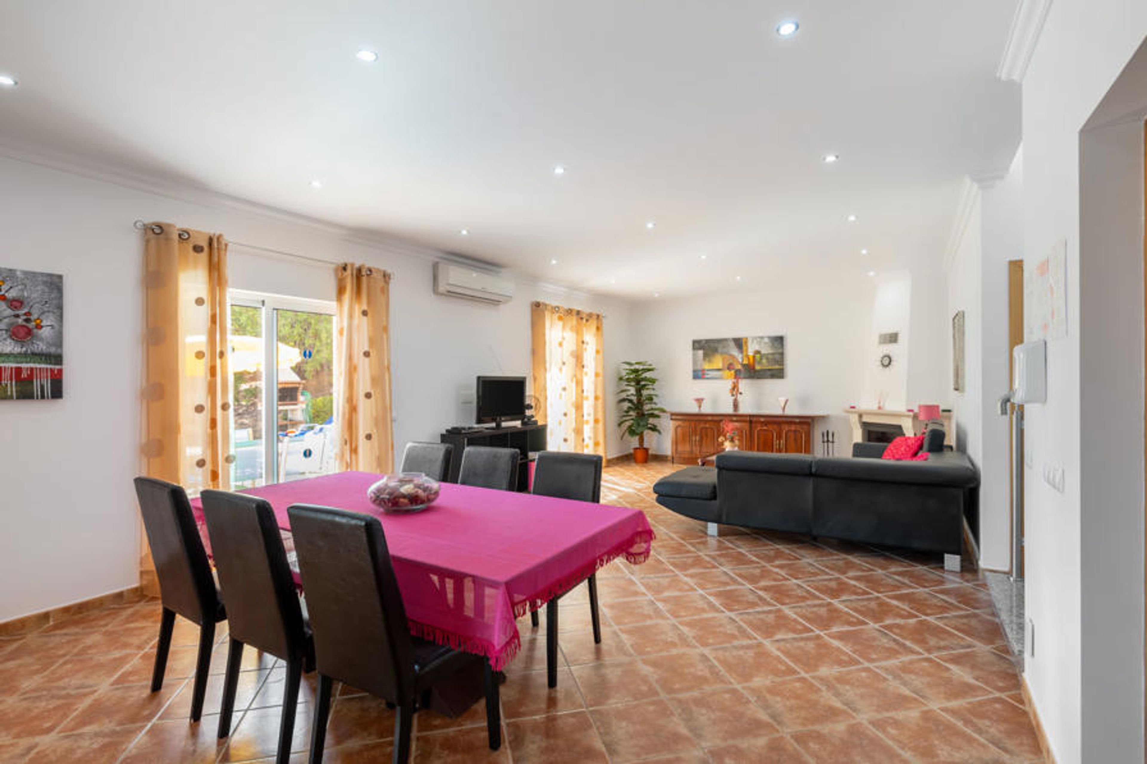 "Casa Joaquim", 4-room house 115 m2 on 2 levels. Bright, modern furnishings: living/dining room with open-hearth fireplace, dining table, satellite TV and DVD. Exit to the terrace. 1 room with 2 beds (90 cm, length 195 cm). Exit to the terrace. Kitchen (oven, dishwasher, 4 ceramic glass hob hotplates, toaster, kettle, microwave, freezer, electric coffee machine) with dining table. Shower/WC. Electric heating, air-conditioning. Heating not available in all rooms. Upper floor: 1 room with 1 double bed (160 cm, length 200 cm). Exit to the balcony. 1 room with 2 beds (90 cm, length 195 cm). Exit to the balcony. Bath/WC, shower/WC. 2 balconies 13 m2, balcony 9 m2, terrace 135 m2, terrace 70 m2. Terrace furniture, barbecue, deck chairs (6). Facilities: washing machine, safe, iron, children's high chair, baby cot, hair dryer. Internet (WiFi, free). Please note: non-smoking house. Smoke alarm, fire extinguisher. 25818/AL