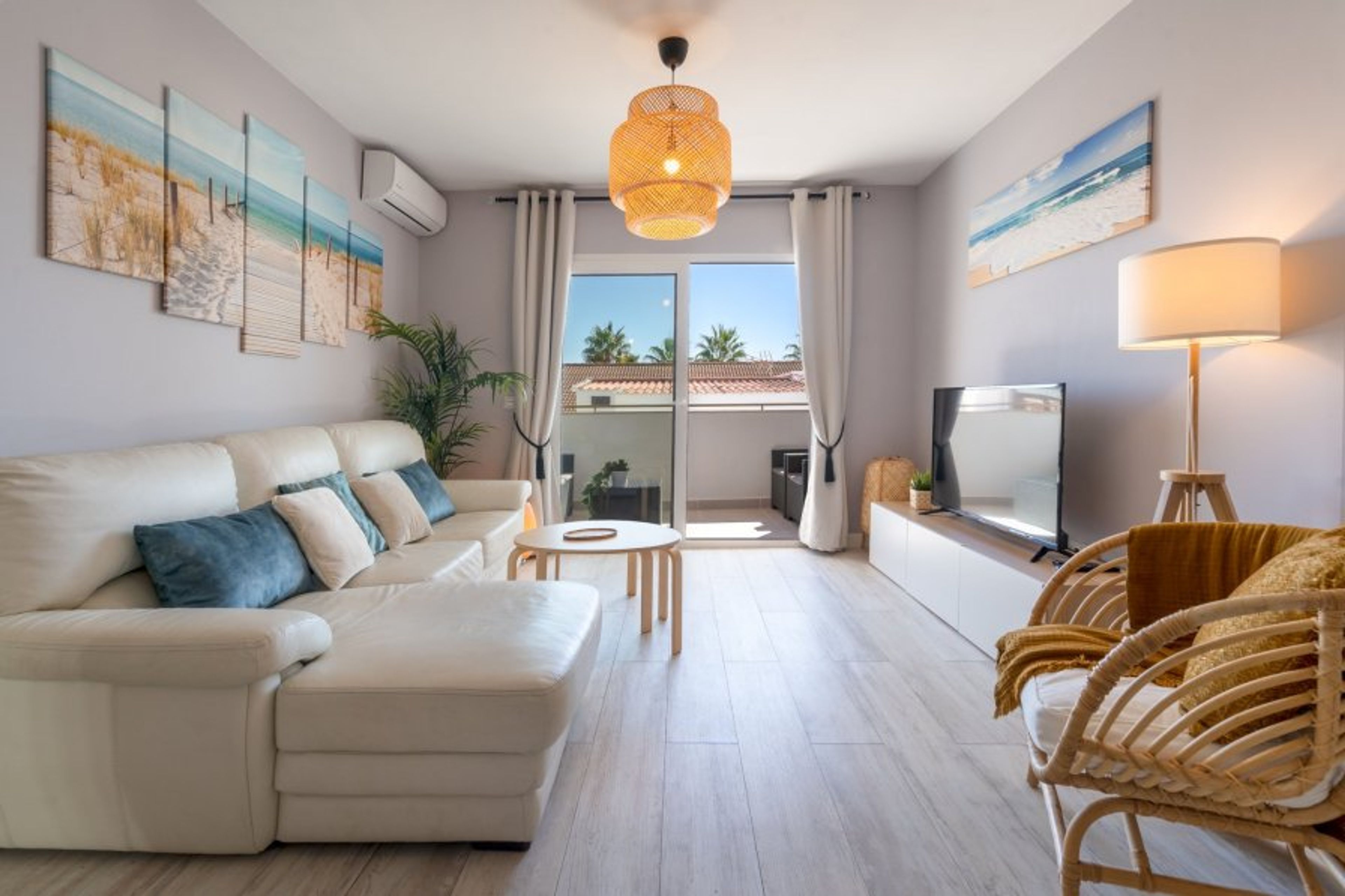 The open plan kitchen dining and living area is decorated with a contemporary beach summer vibe with comfortable seating, large tv, dining table for 6 people and opens up on to the balcony where you can watch the world go by as you sit in the morning with your breakfast or after a day at the beach relaxing before you go out to enjoy the Village of La Cala de Mijas with its many eateries, bars and restaurants.
