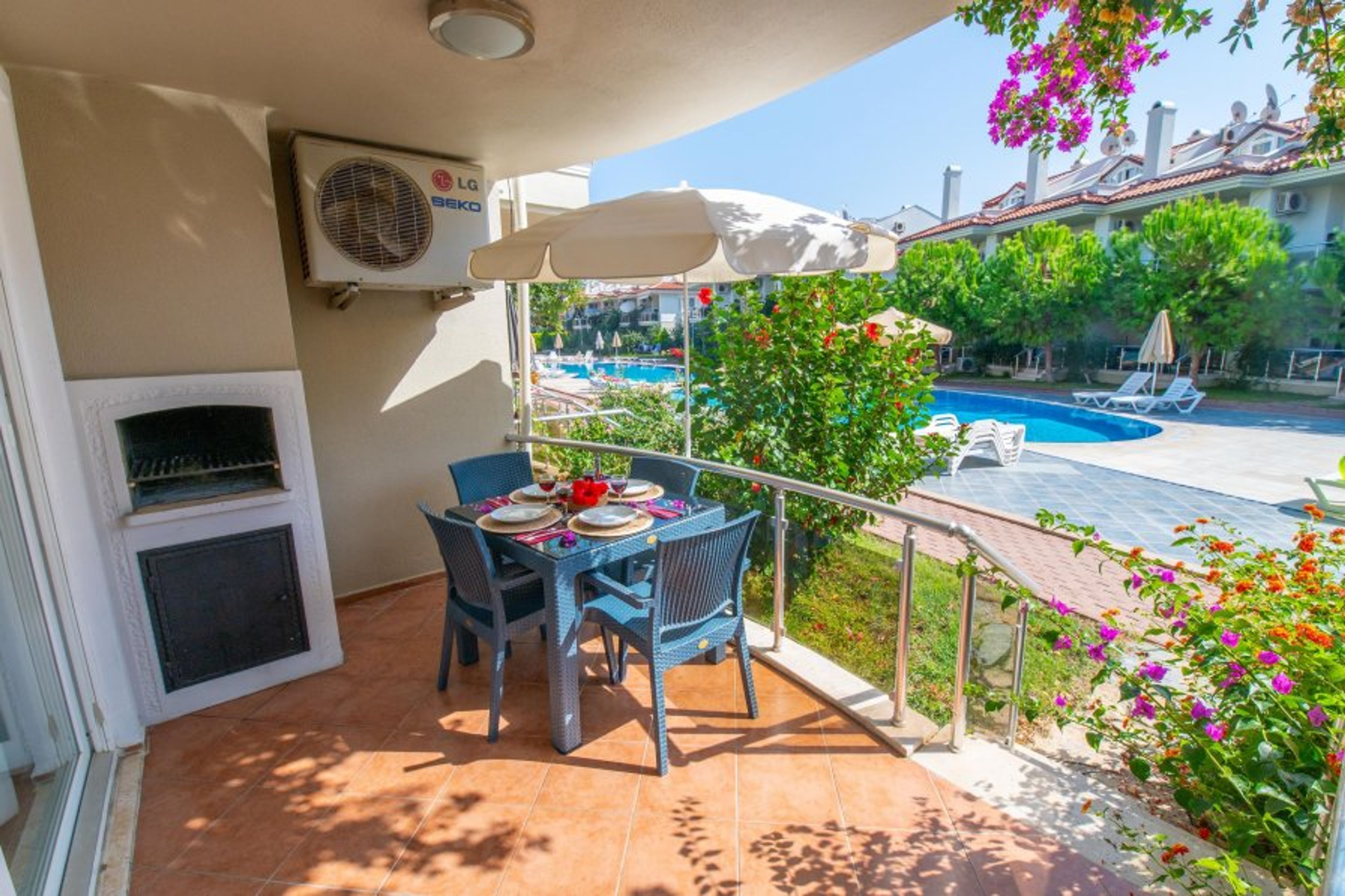 This fully air-conditioned 1 bedroom ground floor apartment has an open-plan kitchen which leads out onto the balcony, 1 bedroom and 1 bathroom (Extra bed/baby cot available). Sunset Beach Club provides you with a fun, family and relaxed atmosphere which will make it a holiday to remember. With a large balcony dining area, you can enjoy your BUİLT-İN BBQ or a cocktail whilst watching the poolside or chill out sunbathing around one of our many pools with beautiful sea views.