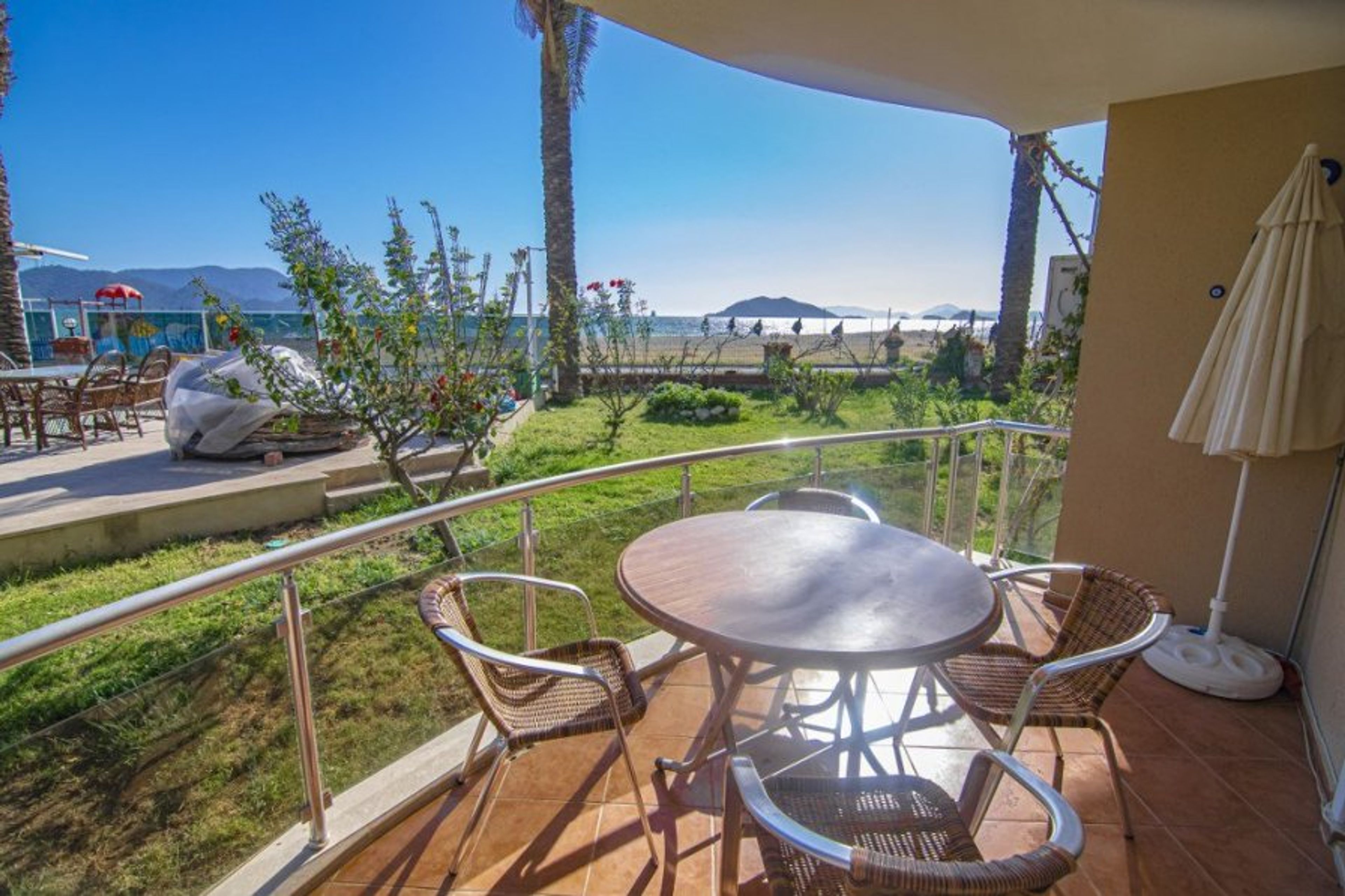 2 bedroom beachfront apartment located at Sunset Beach Club complex in Fethiye/Calis- Aqua Lettings This fully air-conditioned 2 bedroom ground floor apartment has an open-plan kitchen which leads out onto the balcony, 2 bedrooms and 2 bathrooms (Extra bed/baby cot available). With a large balcony dining area, you can enjoy your BUILT-IN BBQ or a cocktail whilst watching the poolside or chill out sunbathing around one of our many pools.