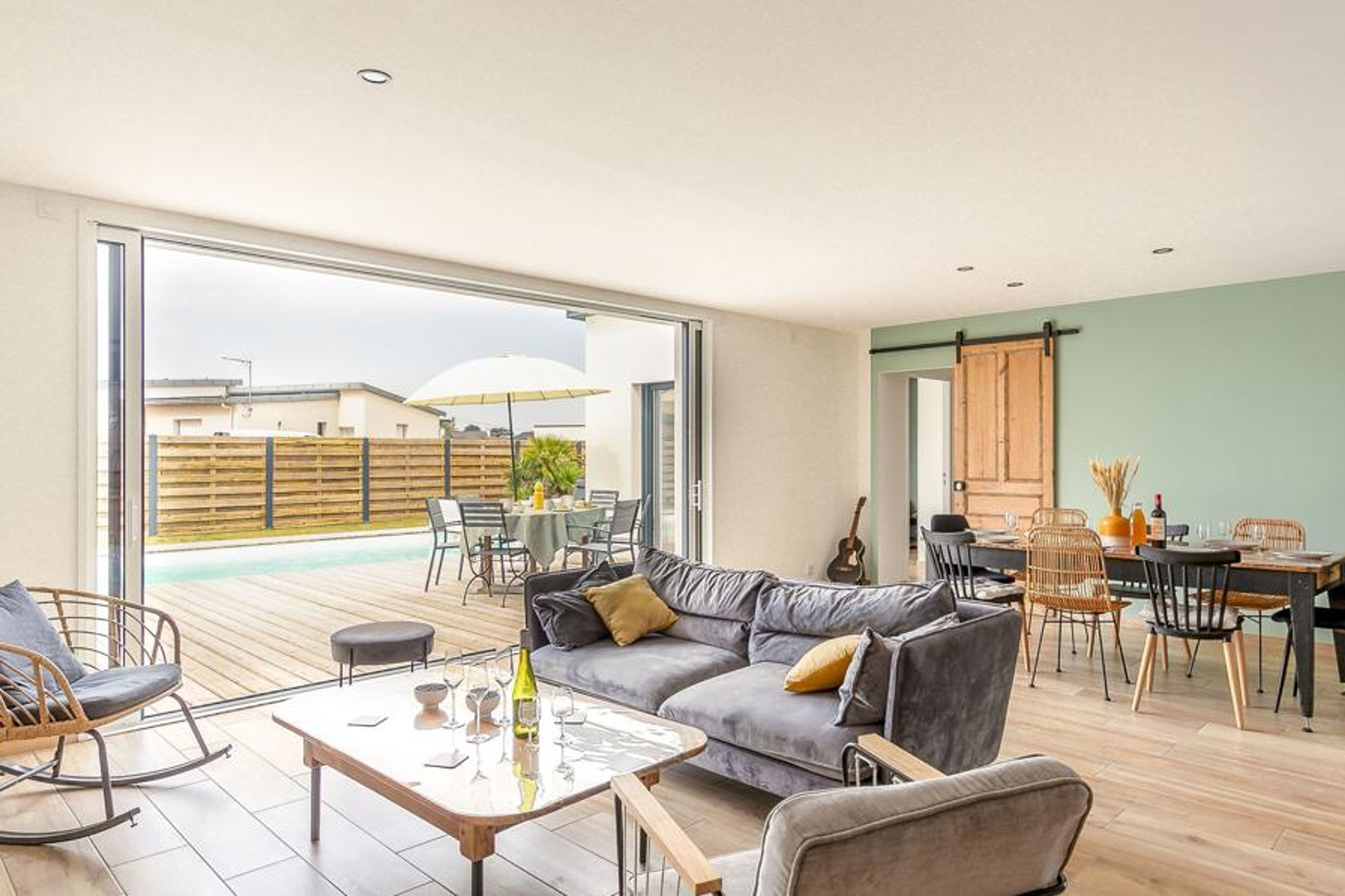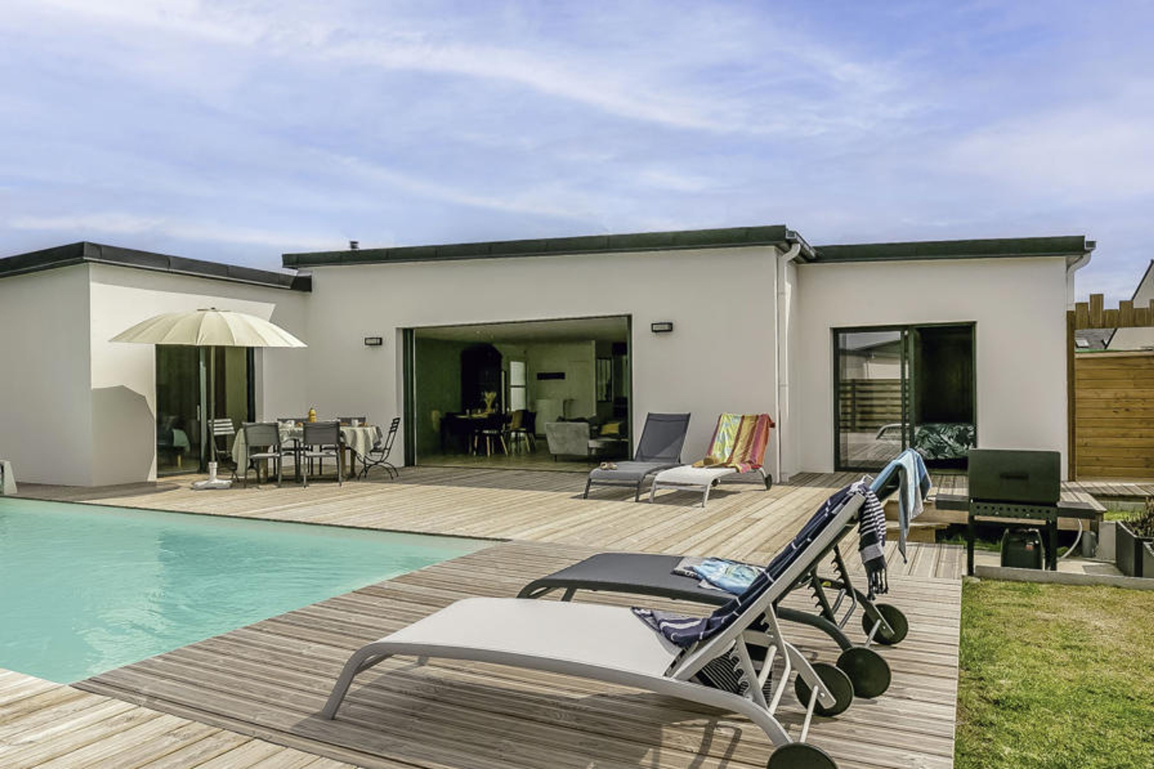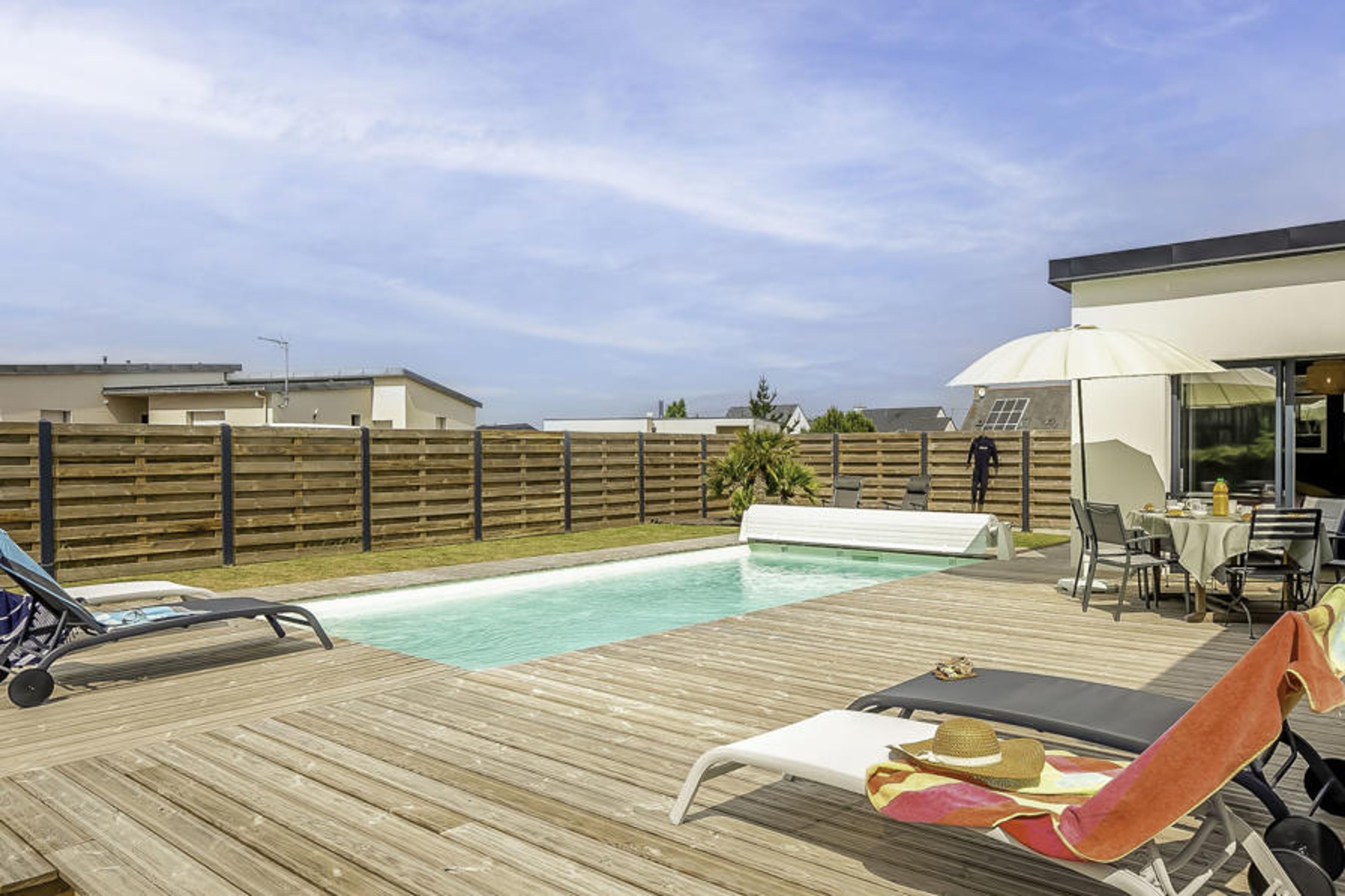 Modern, beautiful single-family house "Les Lagons du Lividic", built in 2021. In the district of Lividic 2 km from the centre of Plounéour-Trez, 12 km from the centre of Lesneven, in the residential district, 250 m from the sea, 250 m from the beach. Private: property 700 m2, well-kept garden 400 m2 (fenced) with lawn and wildlife garden, swimming pool angular, heated (8 x 3 m, 24 m2, depth 140 cm, seasonal availability: 30.Apr. - 29.Oct.) with shutter cover. Outdoor shower, parking (for 2 cars) on the premises, single garage. Grocery 2.1 km, supermarket 6.5 km, restaurant 2 km, bakery 2 km, café 1.8 km, bus stop 250 m, sandy beach "Plage du Lividic" 250 m. Golf course (18 hole) 35 km, surf school 4 km, sailing school 4 km, minigolf 15.5 km, walking paths from the house 200 m. Nearby attractions: Char à voile 25 km, Meneham 7 km, Réserve ornithologique, Dunes de Keremma 7.5 km, Château de Kerjean 27 km, Roscoff, Jardin exotique, Île de Batz 35 km, Océanopolis Brest 43 km. Hiking paths: GR34, sentier des douaniers 200 m. Please note: one bedroom and shower/WC as well as the living room and access to the terrace are suitable for people with reduced mobility.