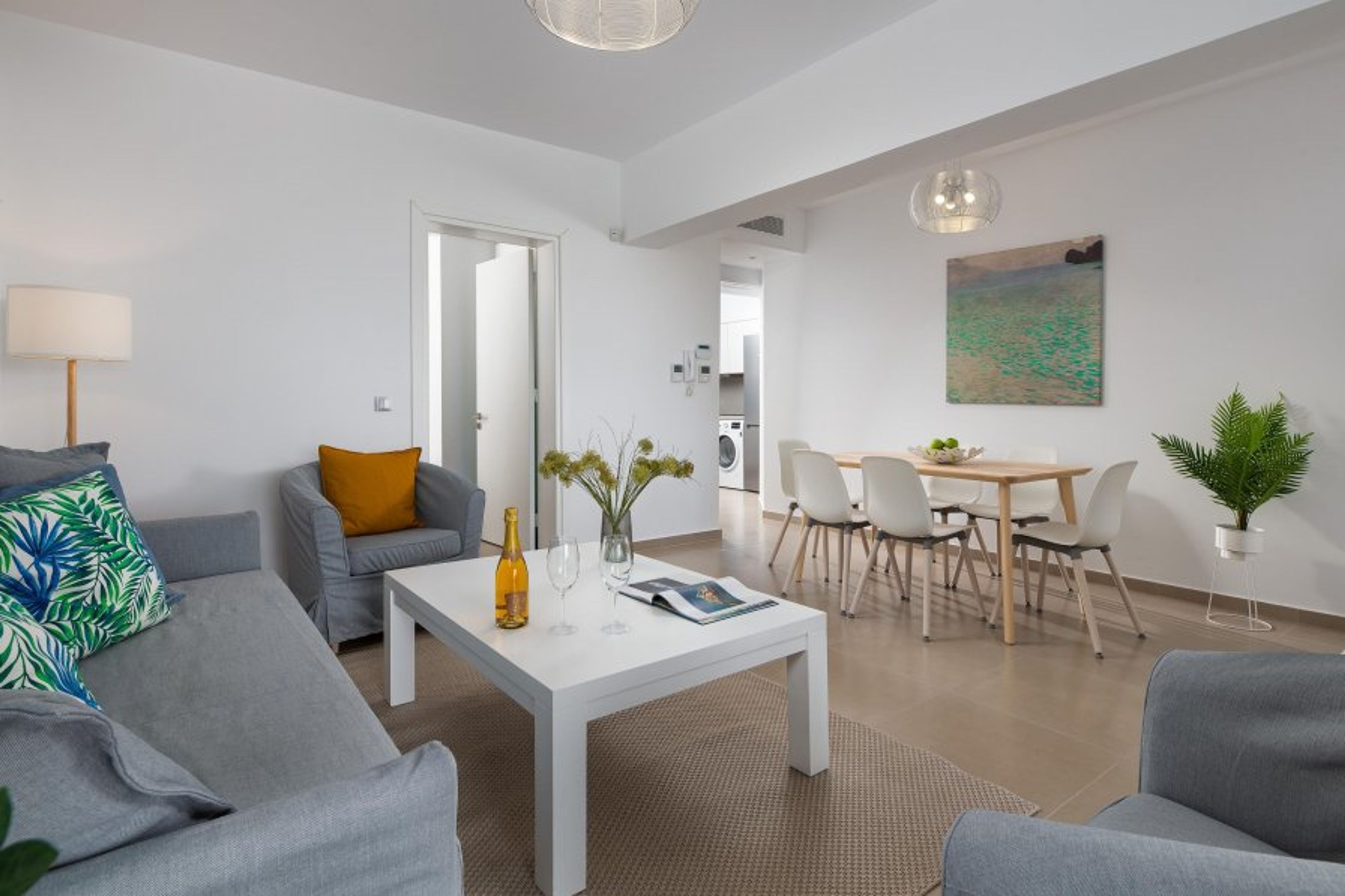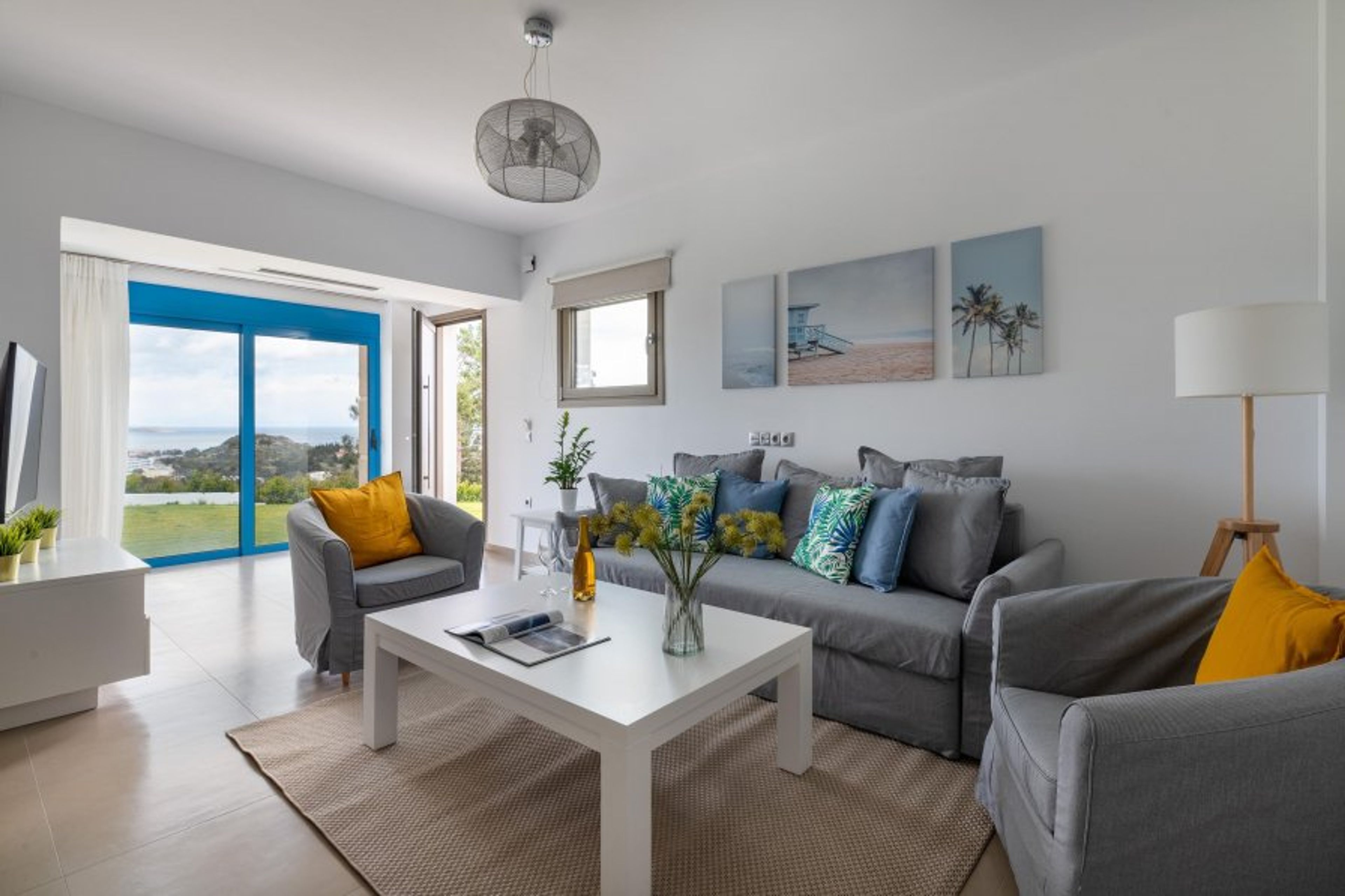 This apartment is on the ground floor and has 2 fully air-conditioned bedrooms, one with a double bed and one with twin beds. Also, there’s a comfy double sofa bed in the living room. There is a bathroom, with a shower. Moreover, there’s a fully equipped kitchen with a sitting area and a comfortable living room with a flat-screen TV with cable channels. There’s free Wi-Fi access throughout the apartments. The interior decoration of the apartment welcomes the refined visitors with a cozy atmosphere of elegant simplicity. Outdoors, visitors will find the sharing swimming pool with its sunbeds which is perfect for dipping and playing. It’s deep enough for swimming and at the near end, it is shallow enough for safe play for toddlers. The pool area is surrounded by a green hill with pine trees and banana trees that add an exotic touch to the garden. In the garden, you can smell and taste herbs and aromatic Mediterranean plants, such as basil, rosemary, mint, thyme, and marjoram. Feel free to cut and taste figs, lemons, and apricots from the trees. Also, there’s a table tennis for fun moments. Its privileged location offers magnificent views in both directions: on one side you can enjoy the wonderful view to Faliraki beach and on the other side the view to the beautiful gardens and the pine forest. There is also a separate children's activity area where children can play basketball, table tennis, or ride a swing with a view. Parking is right inside the courtyard and the whole complex is located within secure gates.