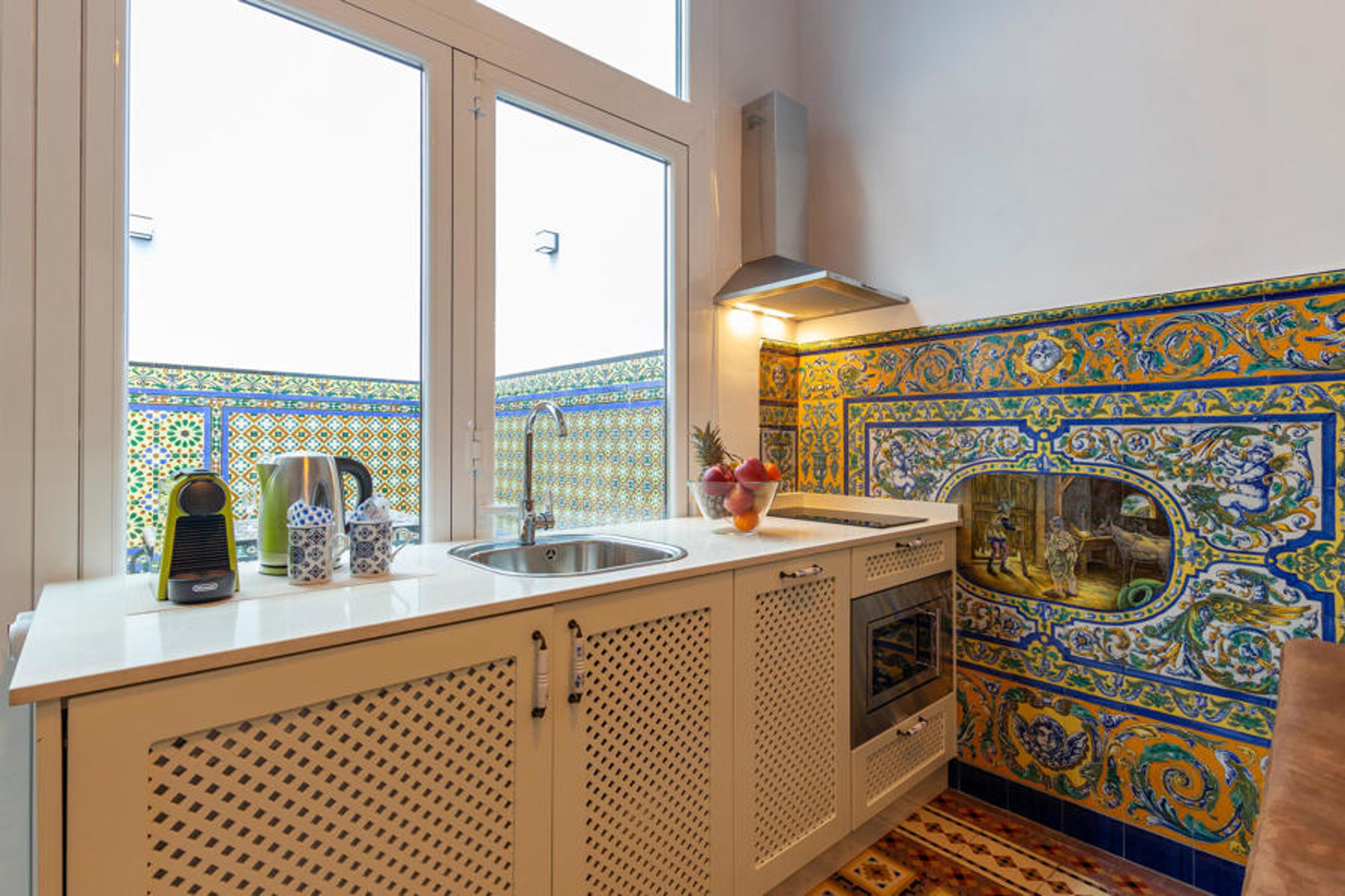 Here you will be greeted by a striking vacation apartment with exciting details in terms of furnishings and placement, including ornate tiles, wooden details as well as stretched a curved metal decorated coffee table and cozy sofa set, all of which you will enjoy in this wonderful apartment. Even in the morning hours you can sit on the open terrace with a cup of coffee and enjoy the fresh air.