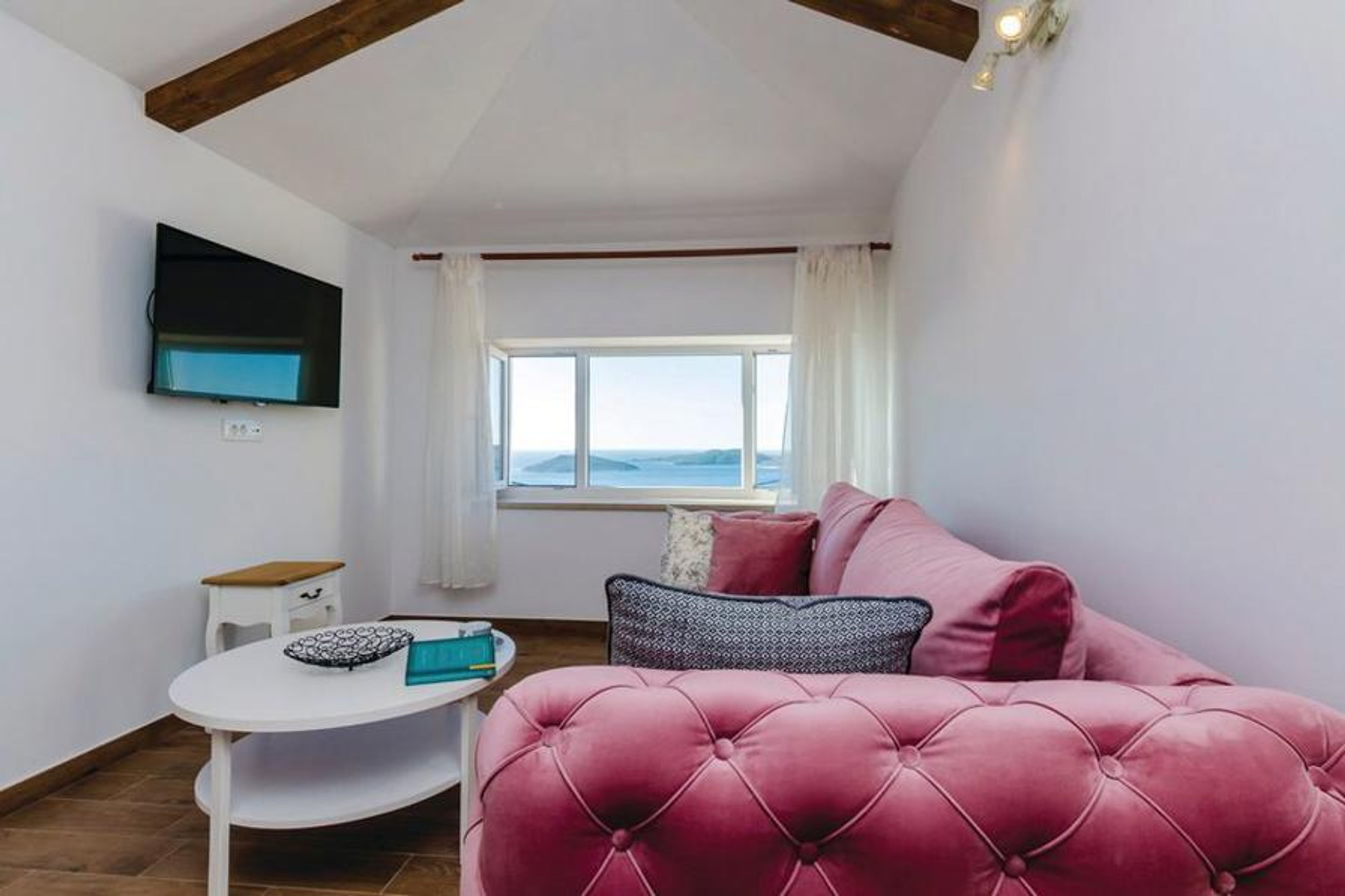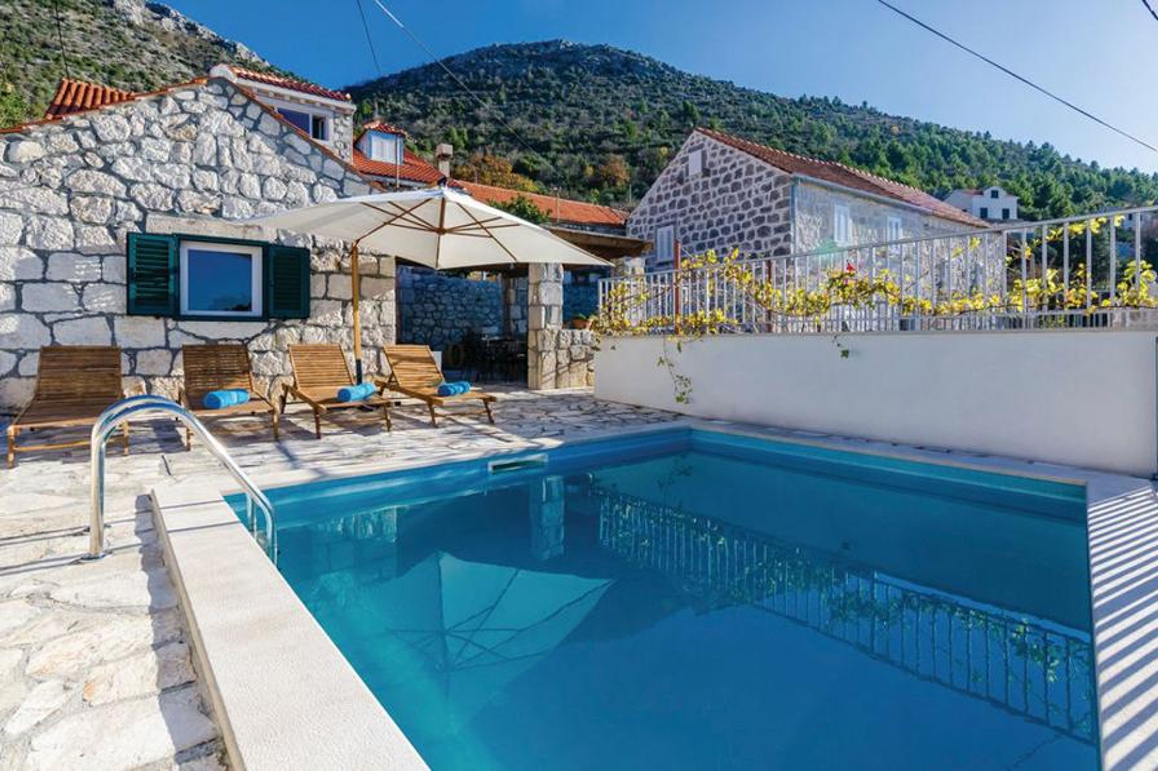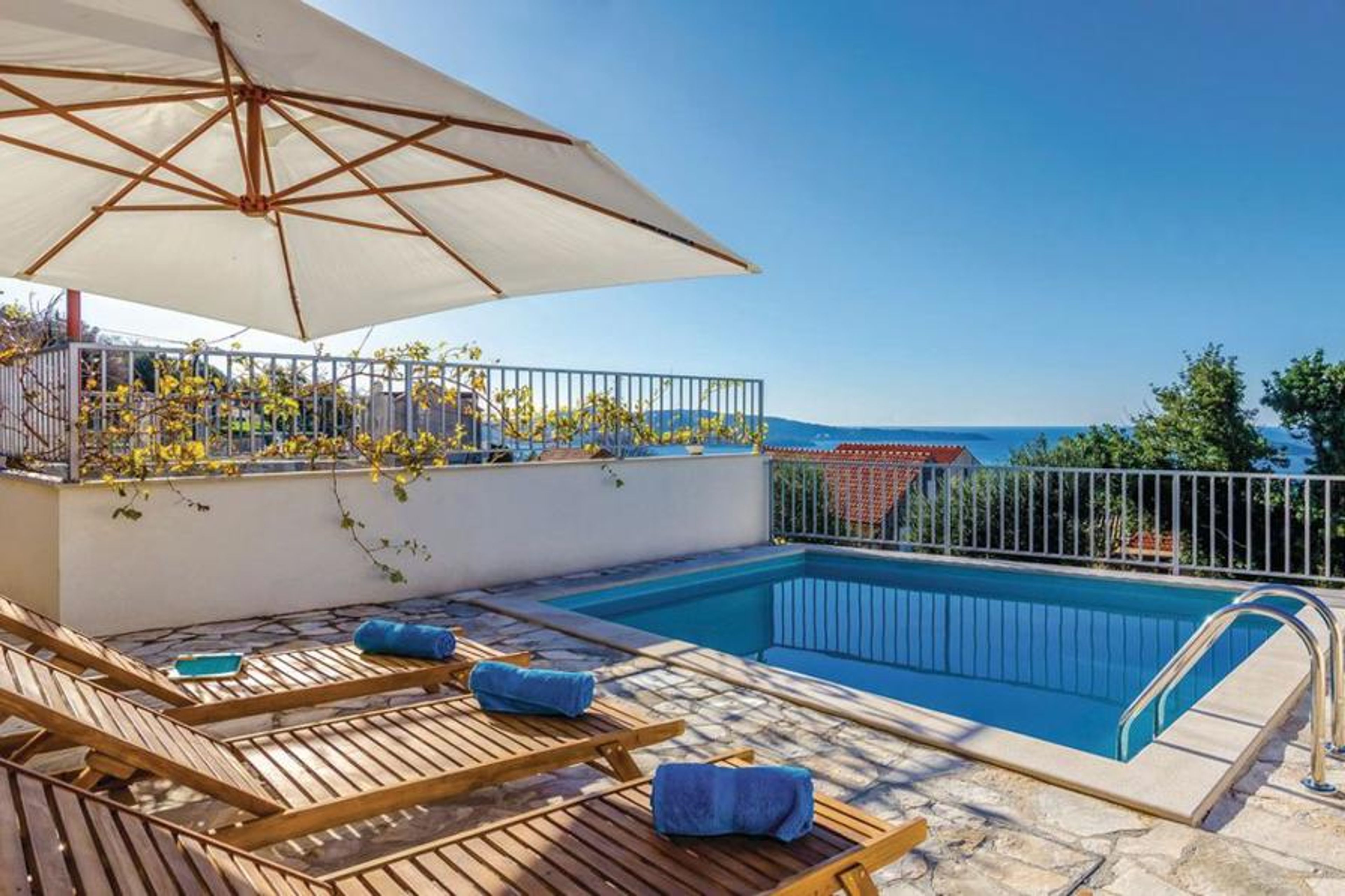 Outside, a large south-facing terrace features a private pool, wooden loungers, and parasols. Guests can relax in the sun while enjoying panoramic views of the Adriatic and nearby islands of Lopud and Sipan. Villa Loris offers a peaceful, scenic setting ideal for families or friends seeking an authentic and relaxing Croatian escape.