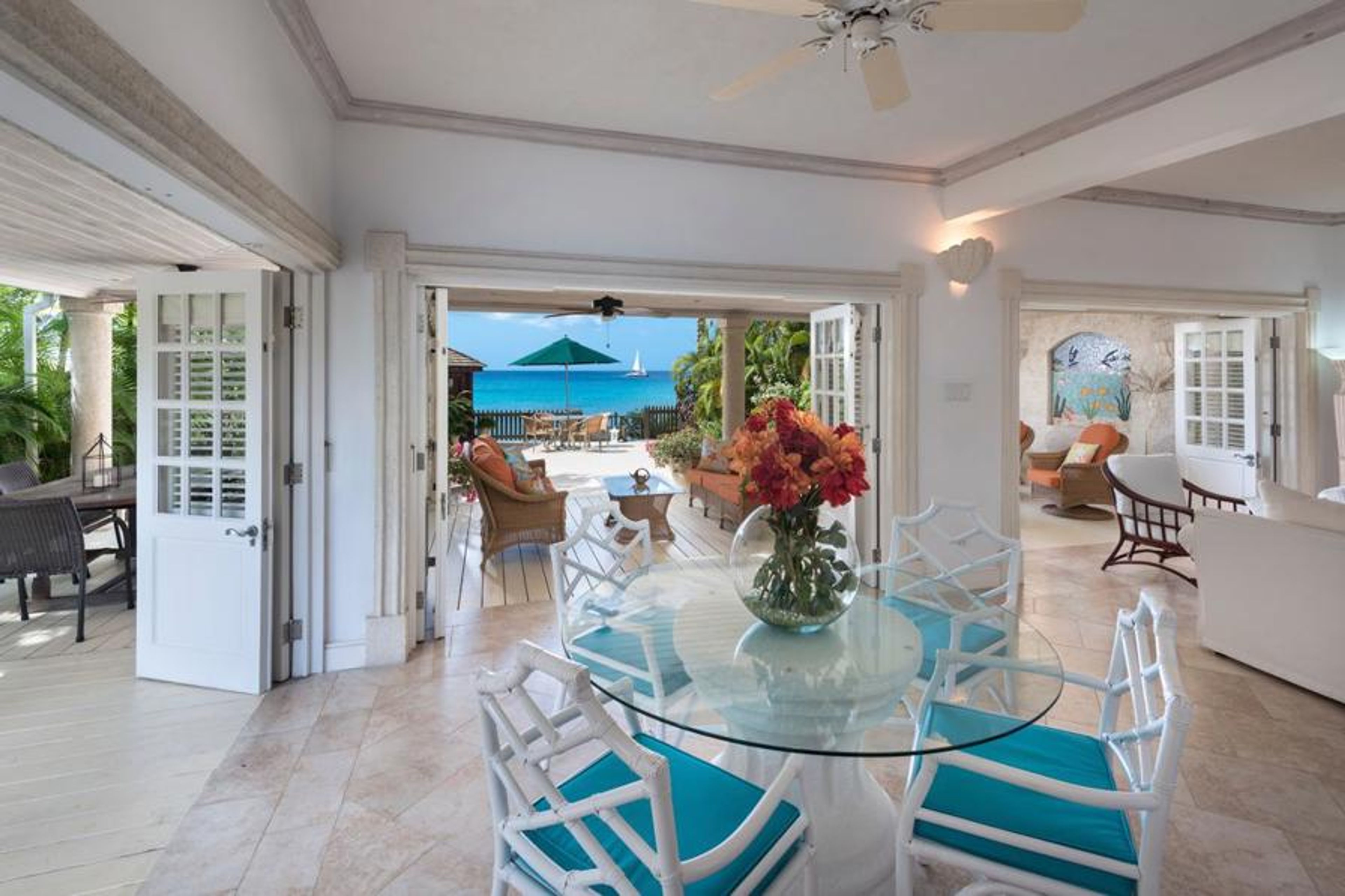 Ascending the spiral staircase, you will reach the first floor, where two of the guest bedrooms are located. The first guest bedroom hosts an irresistible king size bed, making lazy mornings a treat not to be missed. Within this guest bedroom is access to a shared balcony, giving you the opportunity to gaze out at those gorgeous Caribbean sands from new heights. The second guest bedroom is the perfect resting place for younger guests. Complete with two twin beds, an AC unit and a ceiling fan, this will be ideal for the little ones to cool off after a long day.