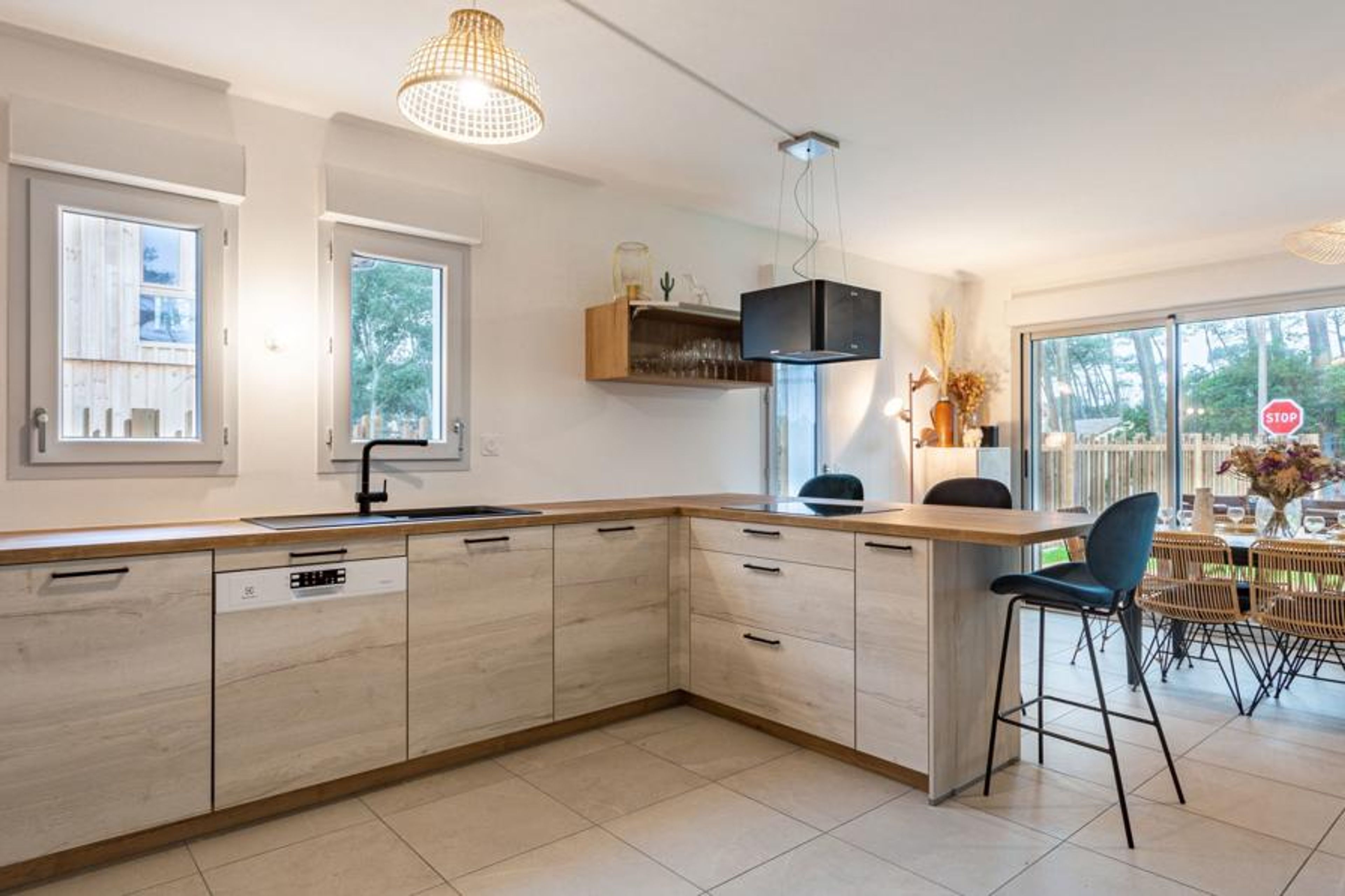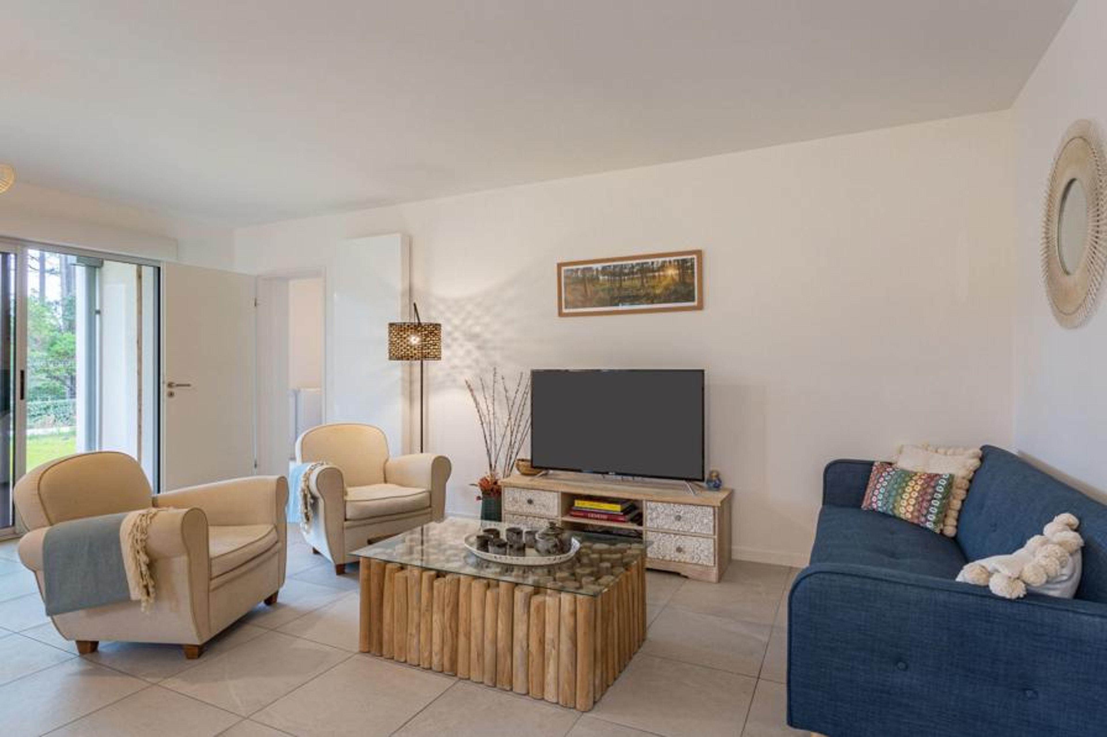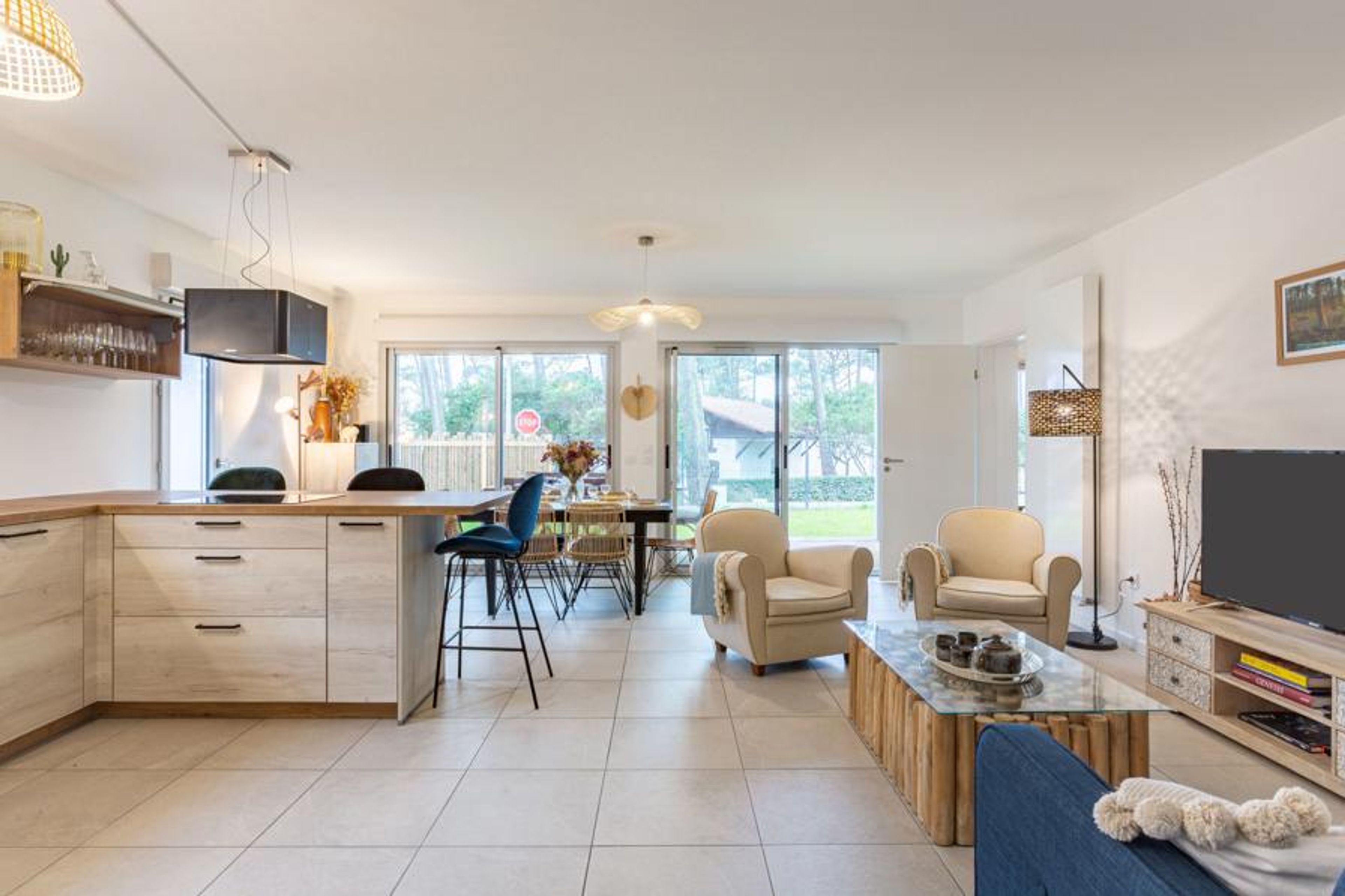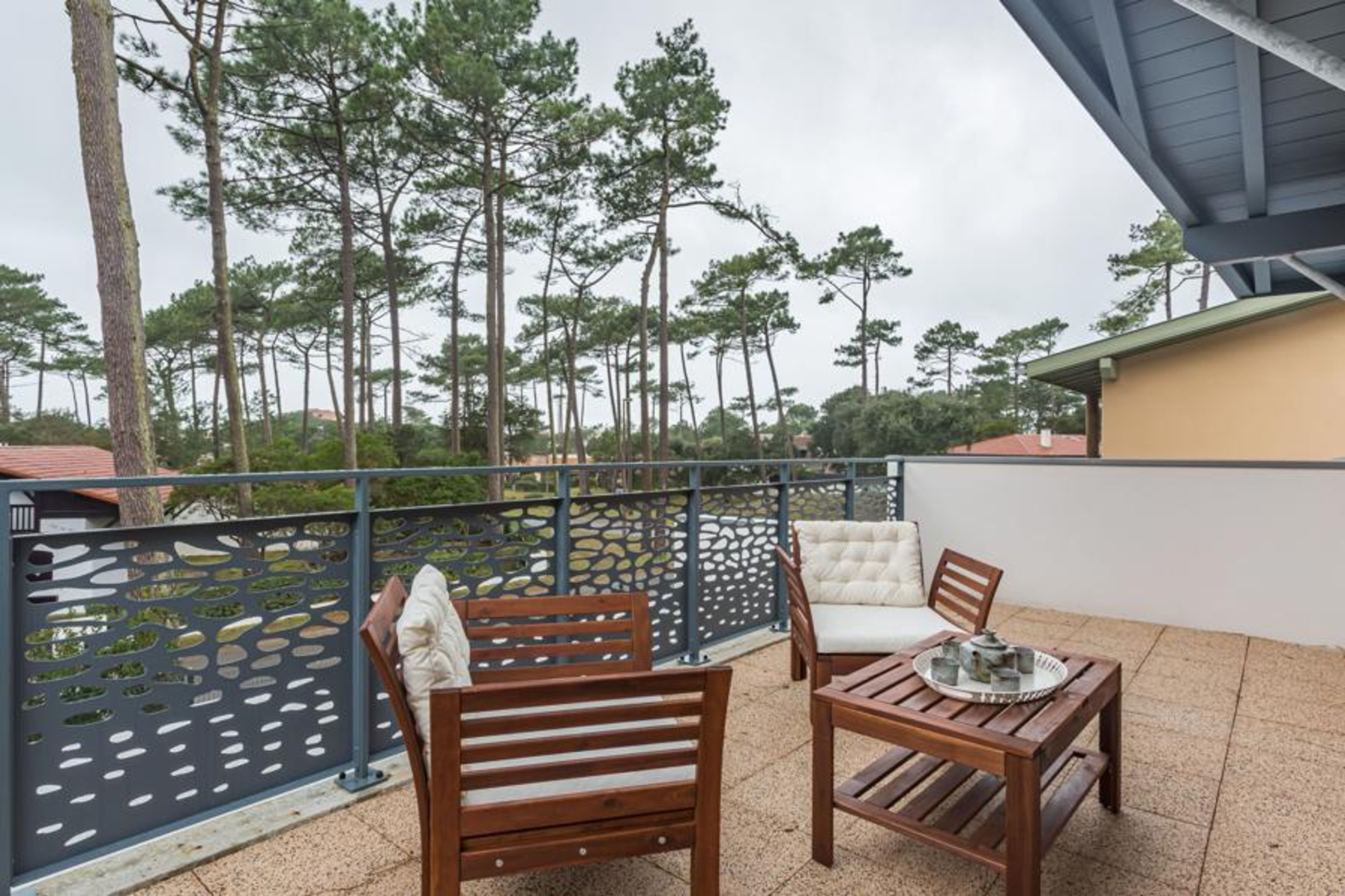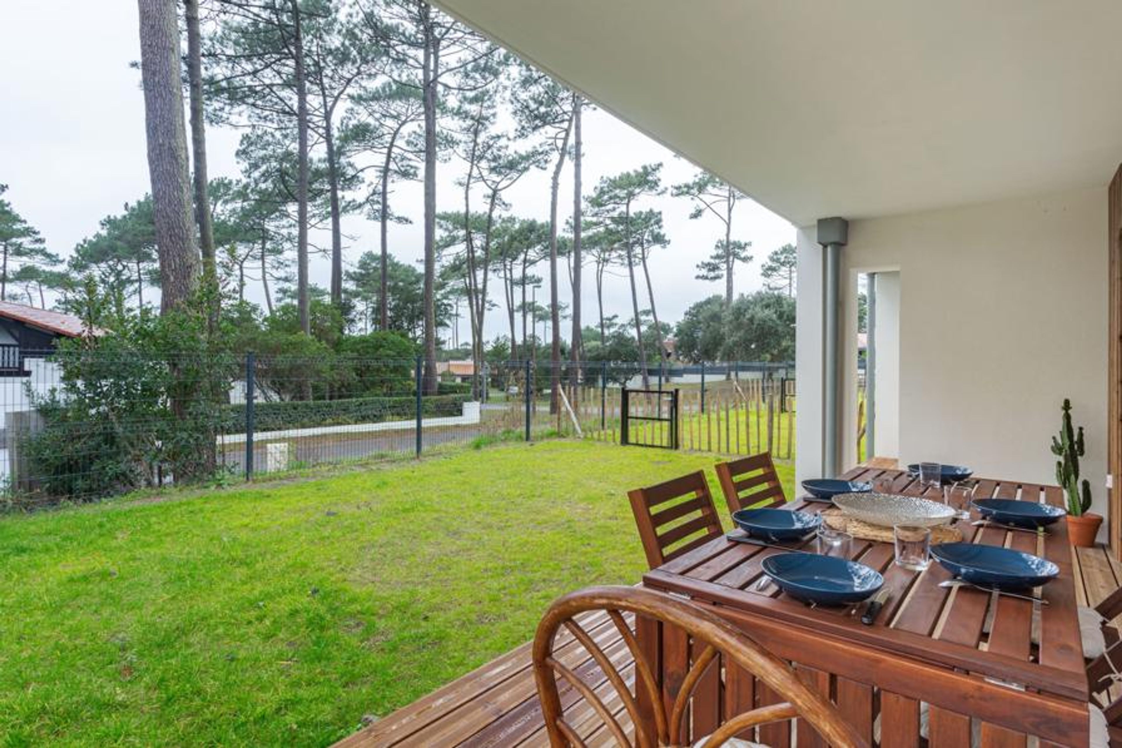 Seignosse Océan 6 km from Hossegor: Residence "Dune Blanche", built in 2021, surrounded by trees. In the resort 500 m from the centre of Seignosse Océan, in a quiet position, 300 m from the sea. Grocery 500 m, supermarket 3 km, restaurant 500 m, bar, bakery, café. Surf school 500 m. Groups of teenagers on request only. The keys‘ handover takes place by the agency hossegor 6 km.