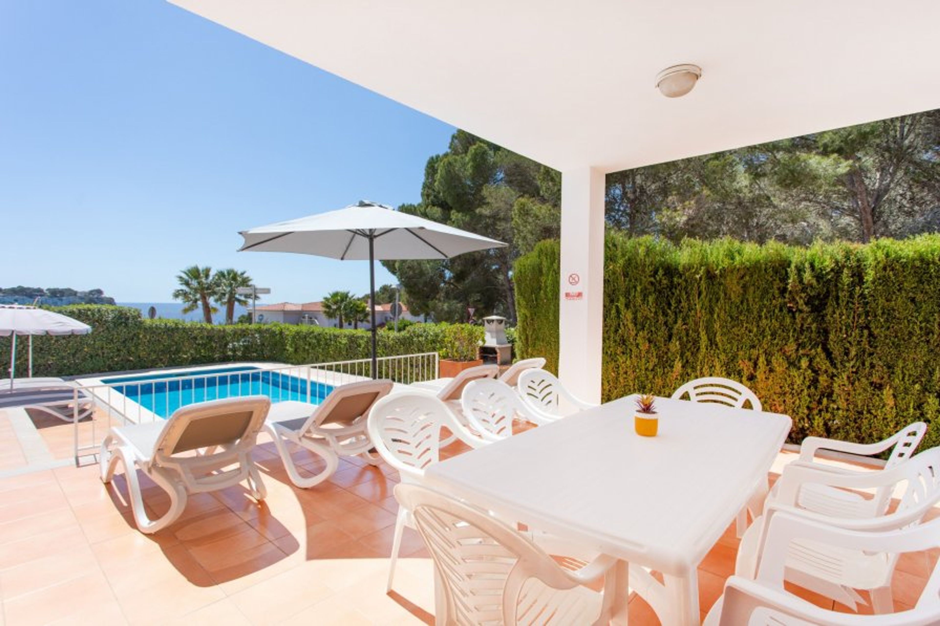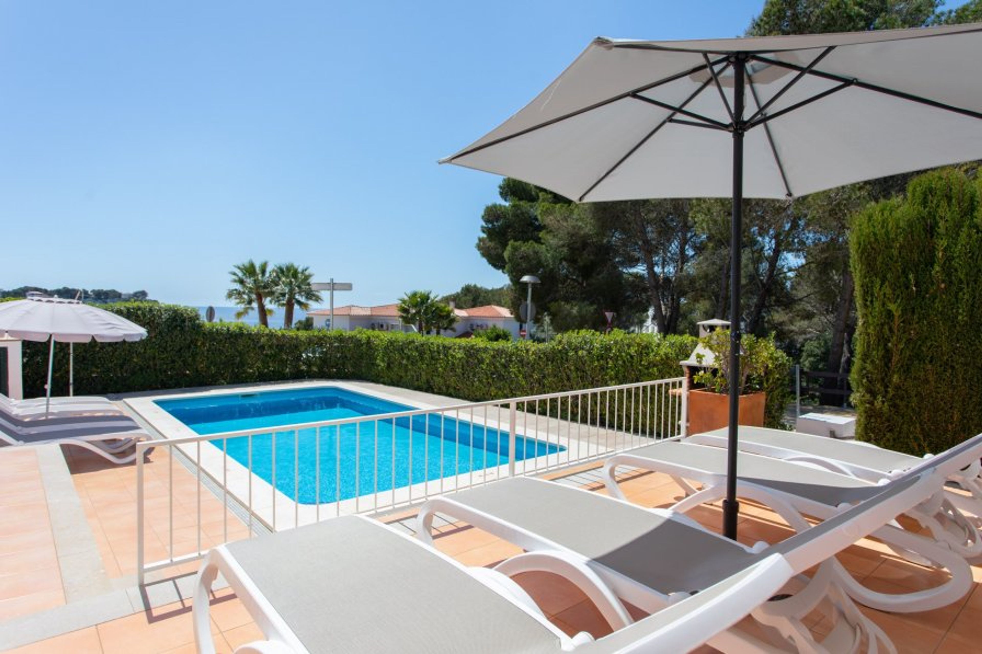 The exterior of the villa for rent in Menorca is located the private pool, the barbecue and the terrace with a garden area. It has sun beds, umbrellas and all the outdoor garden furniture needed to enjoy the sun, the pool, meals and outdoor evening.