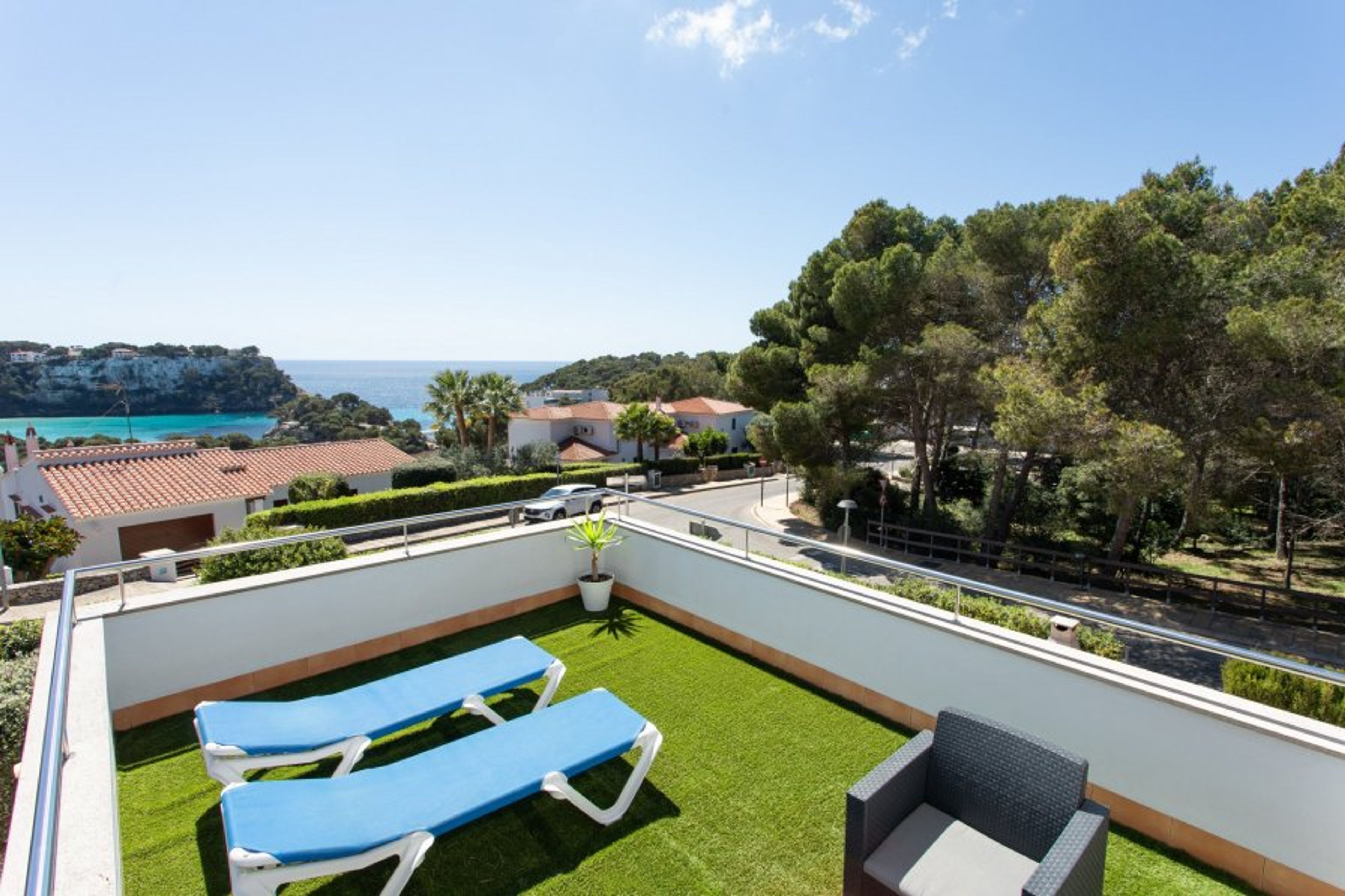 The rooms are distributed in four double bedrooms. On the ground floor, you can find the first bedroom that has a double bed and a wardrobe with enough space to store clothes. On this floor, there is also a spacious bathroom fully equipped with shower and hairdryer. On the upper floor there are the other three rooms and a spacious bathroom that has a bathtub and a hairdryer. The first two bedrooms that are located are equipped with two single beds and a large built-in wardrobe. The third room is the master bedroom. It is en suite and it is equipped with a double bed, a large built-in wardrobe and it enjoys a beautiful private balcony overlooking the beach and Cala Galdana. In addition, the main room has a private bathroom en suite fully equipped and with shower. All bedrooms have air conditioning. This upper floor also has a beautiful terrace overlooking the sea and the beach where you can enjoy beautiful sunsets.