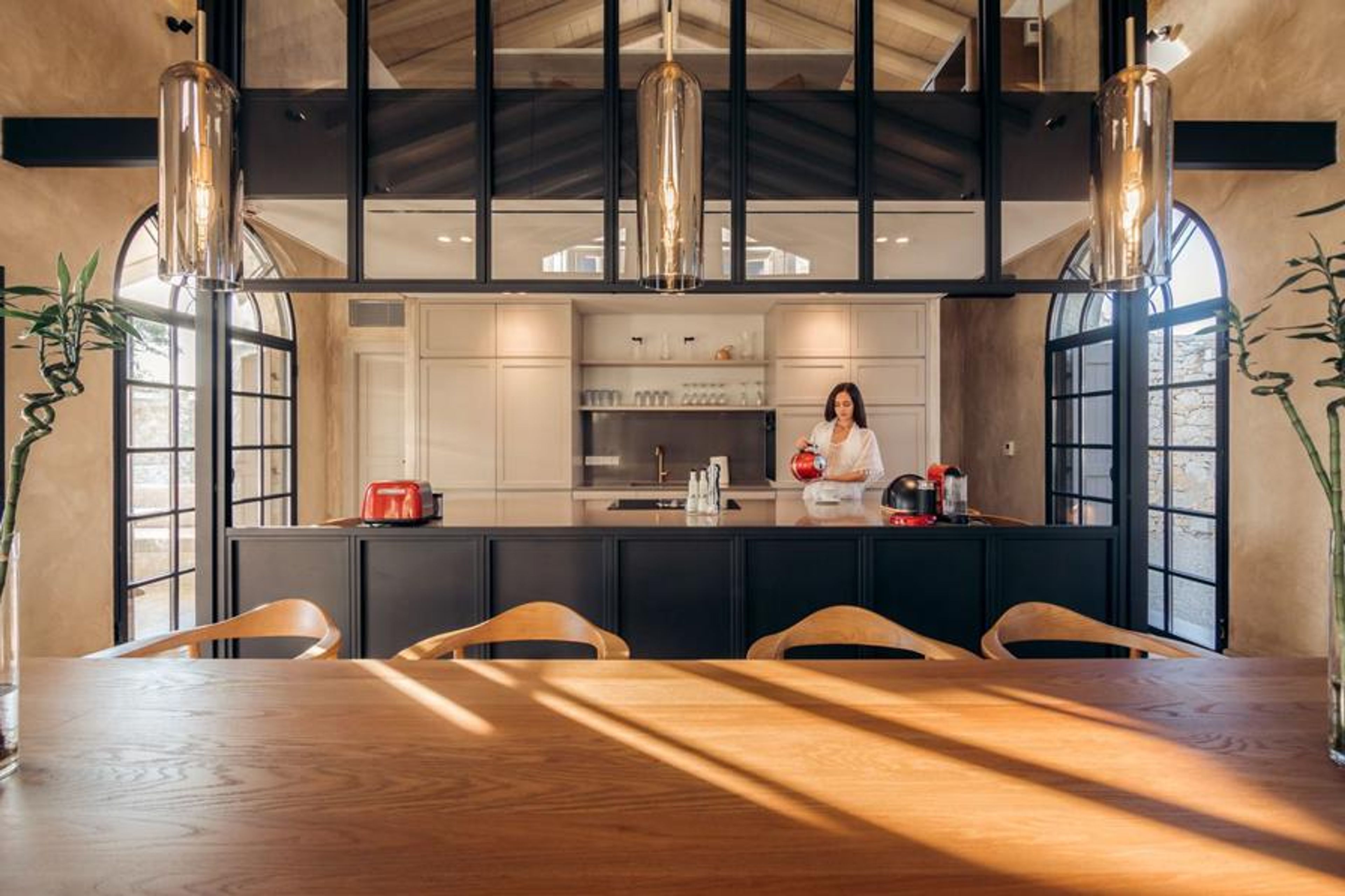 Architects and interior designers have been in their element styling Villa Aegean. The black framed doors and windows in the living area combine brilliantly with the mellow honey coloured stone and cool cream sumptuous sofas. The huge feature fireplace and the vaulted ceilings are incredibly striking and create a cavernous feel to this incredible room. The chef’s dream of a kitchen features cream and black cabinetry and the very best of appliances. Guests can either dine inside at the trendy wooden table and chairs or alfresco in a choice of special spaces. The living space is very sociable, just perfect for a group of friends or family. The huge black framed doors and windows offer glimpses of the beautiful grounds surrounding the villa. Above the kitchen area is a superb mezzanine office space with views down to the living area should you need to check on your emails.