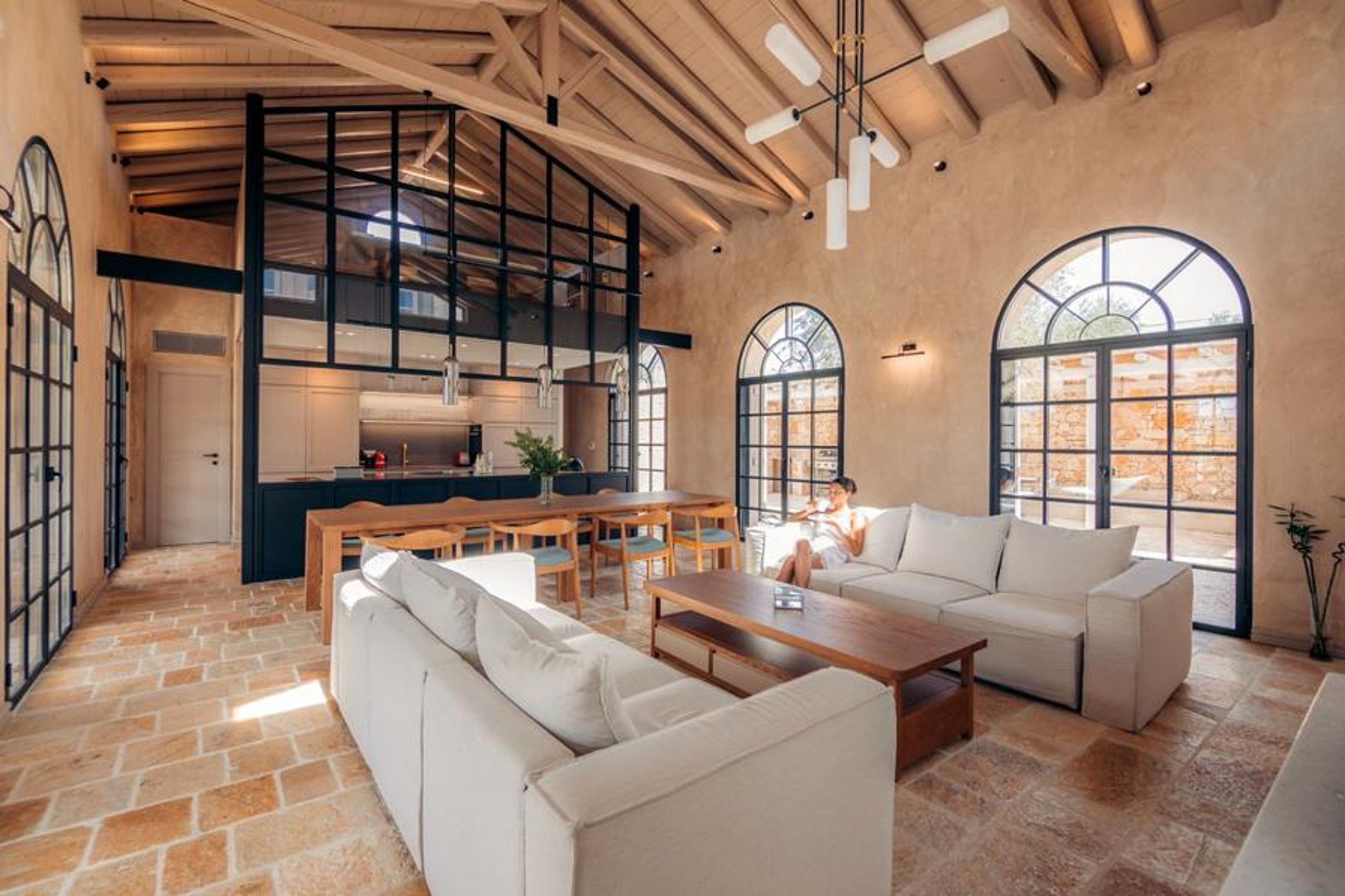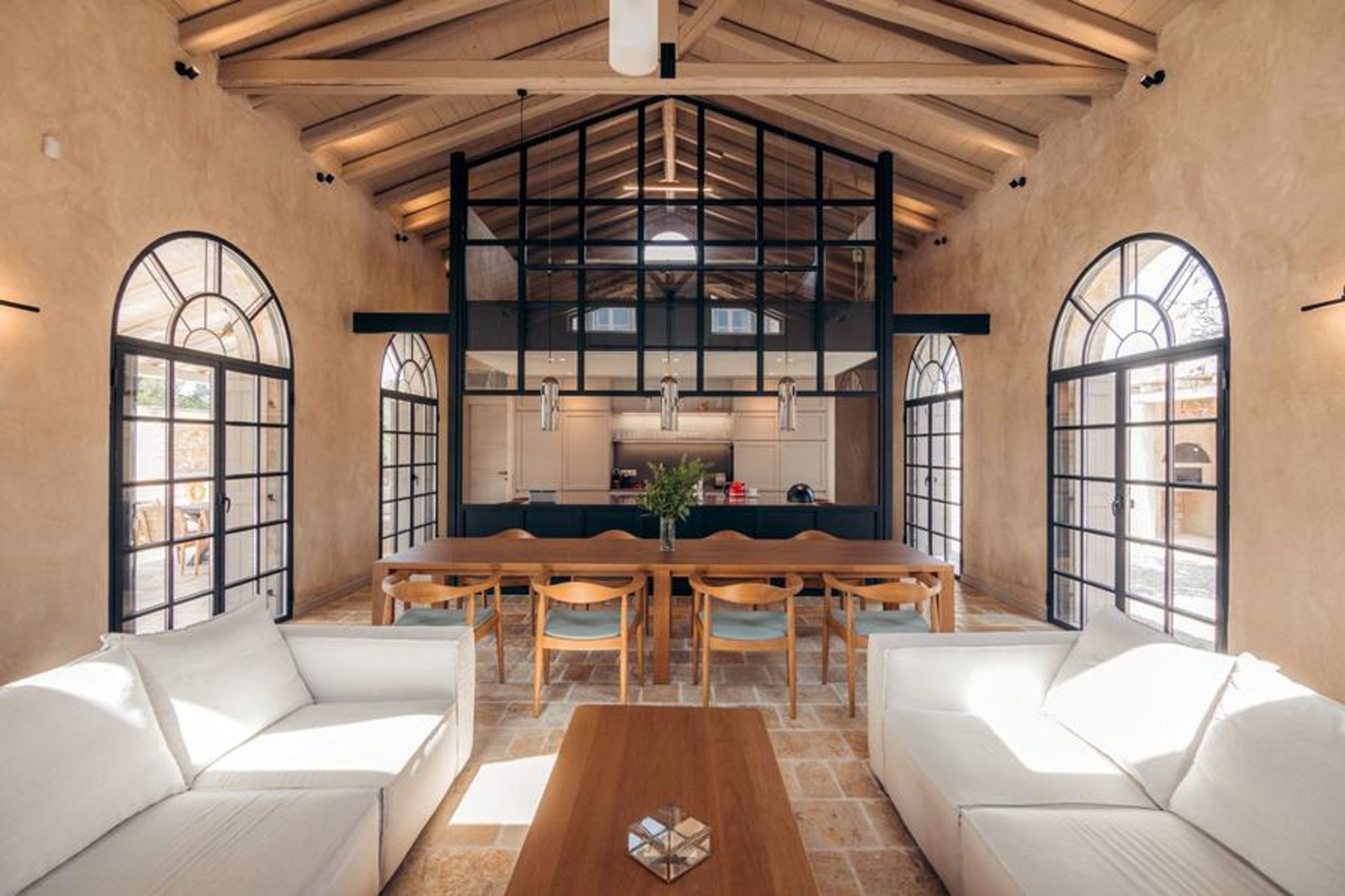 The outside space of Villa Aegean is totally serene. The highly impressive swimming pool is surrounded by a gorgeous terrace, chic, trendy loungers, a shaded alfresco dining area and grounds brimming with organic oil producing olive trees dating back over 150 years and bountiful vineyards and orchards with apples, oranges, lemons and pears. The panoramic scenery is stunning. At one end of the pool terrace you will find a beautiful alfresco lounge area, shaded from the hot sun and built with warm, honey coloured stone and comfy cushions. It is the perfect spot for cocktails and chilling. There are two wonderful spots for alfresco dining, one by the pool and the other on the other side of the living space, both shaded and beautifully designed.