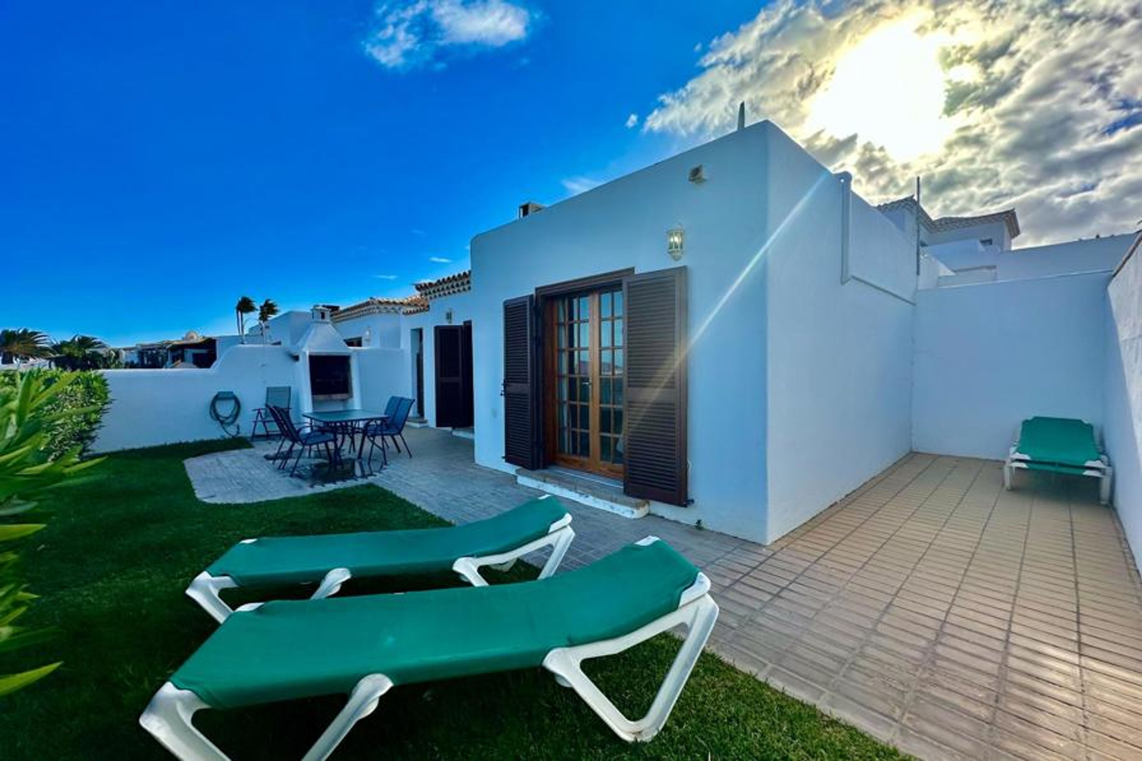 This 2 bedroom villa with shared pool is located in Golf del Sur and sleeps 4 people. It has a garden, barbeque facilities and parking nearby. The villa is near beach front and within walking distance of restaurants.