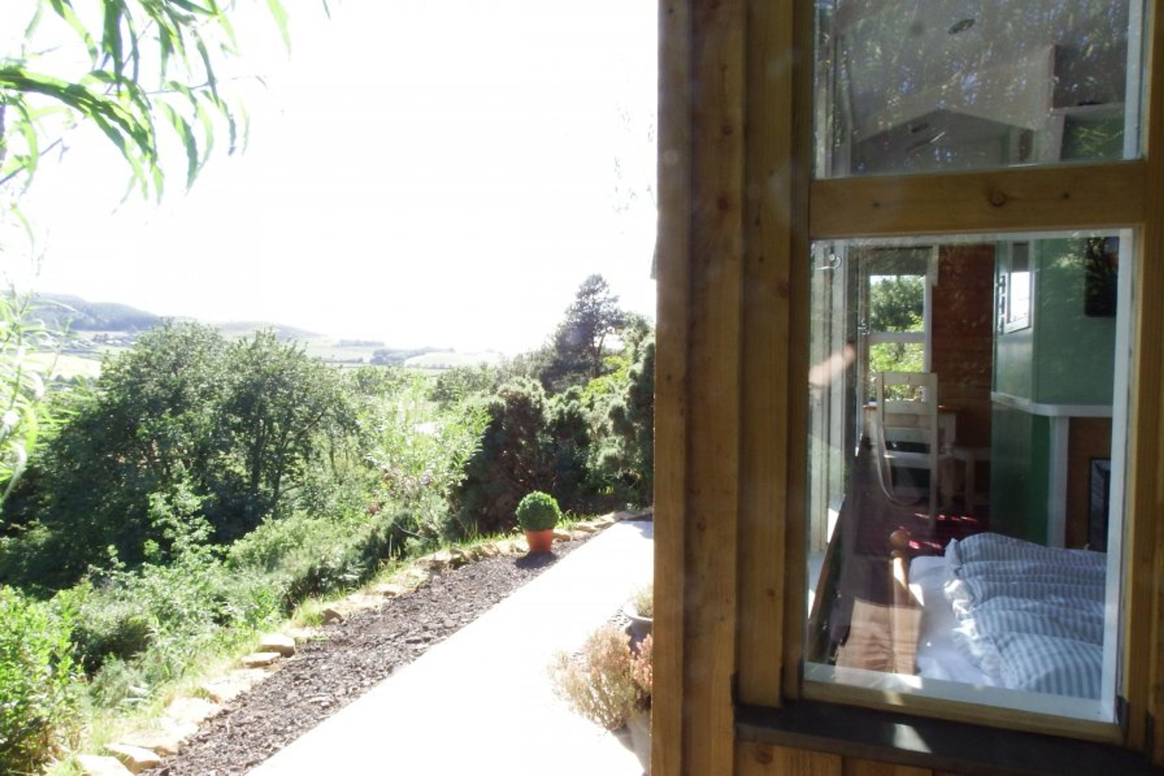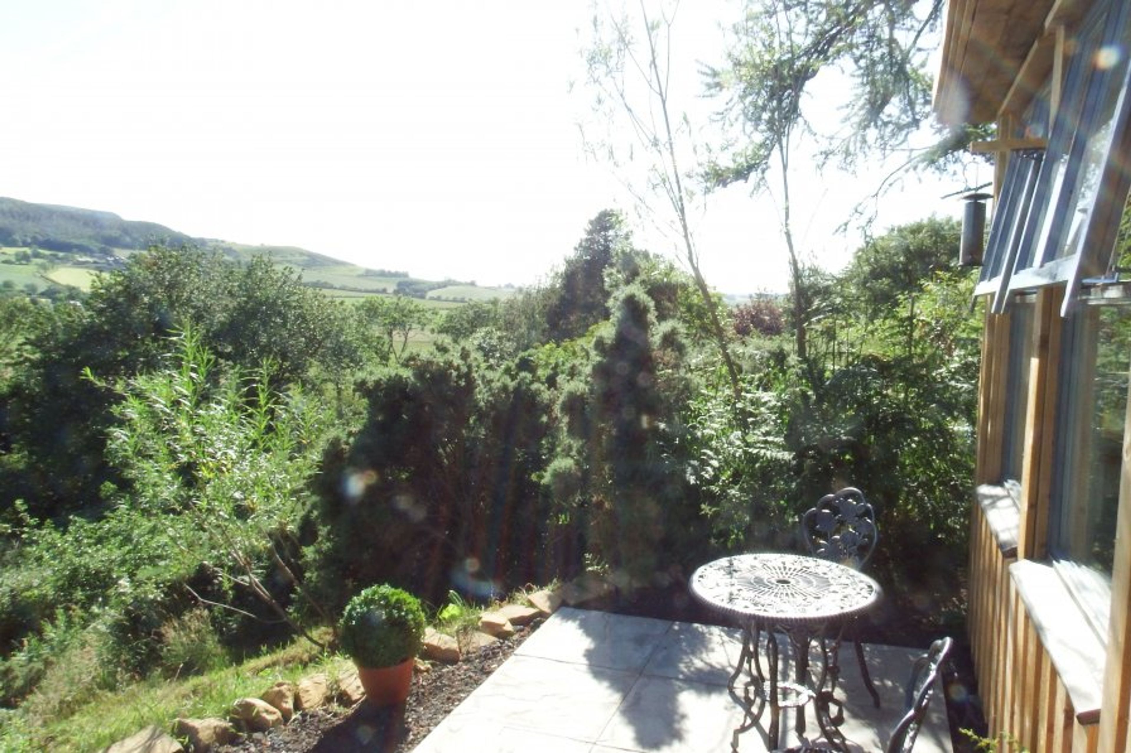 Outside is a terraced area overlooking the views, with seating for outside dining. Below the cabin is a unique sunken rock garden, incorporating a circular seating area sheltered from the wind, but capturing the the heat of the sun, whilst offering outstanding views over the woods and hills.