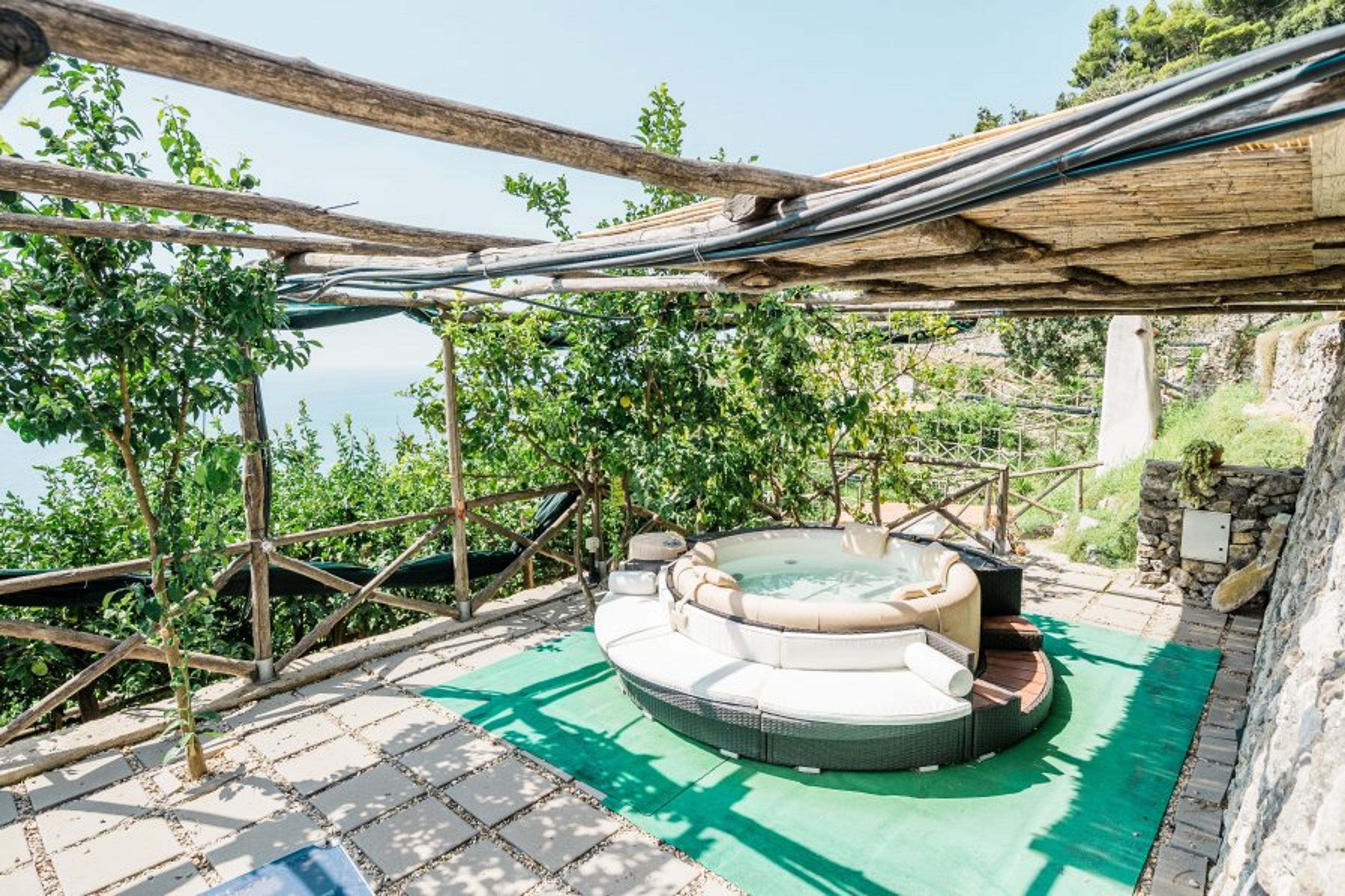 The main terrace partially shaded by a bamboo roof and paved with stone floor, is adorned with lemon plants and hosts a dining table sitting 8 people, an outdoor shower and a barbecue corner.