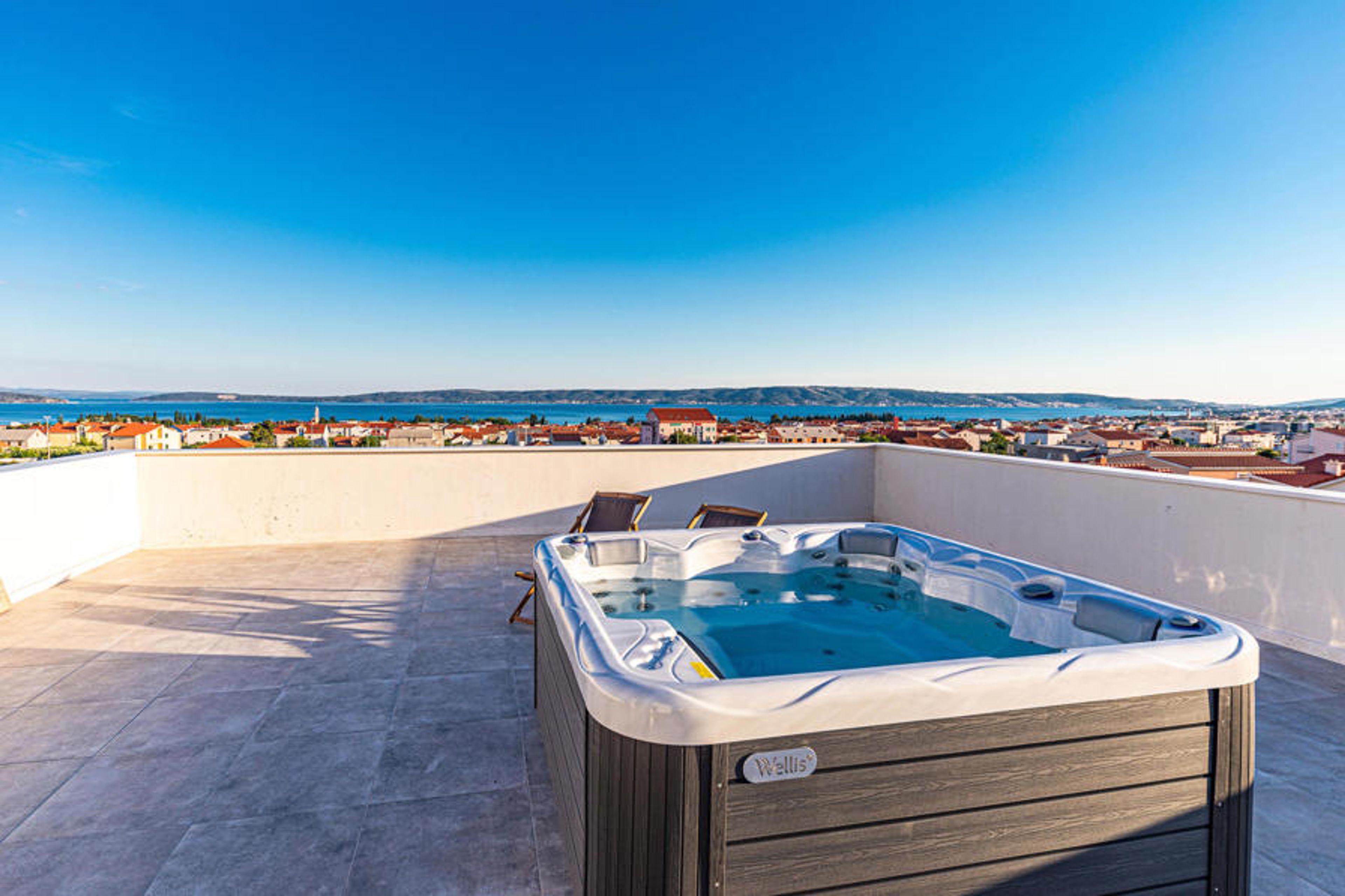 This newly built house consists of two residential units, which are connected by an internal staircase. Among other things, you will enjoy access to an infrared sauna, an entertainment room and a fitness room. On the top level you will find roof terrace with jacuzzi with beautiful panoramic sea view, while on the first floor level you will find a garden with swimming pool with 3 massage jets.