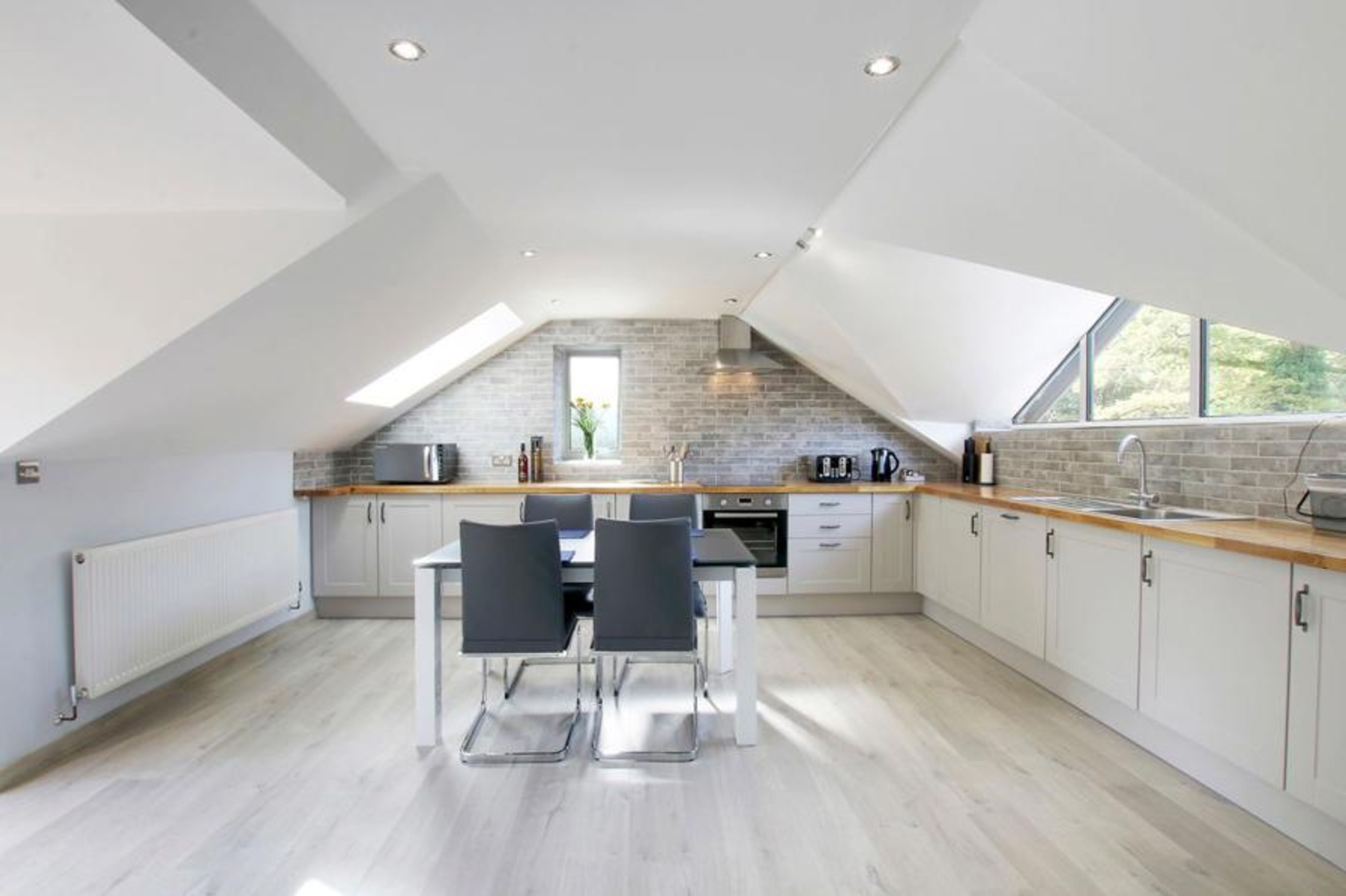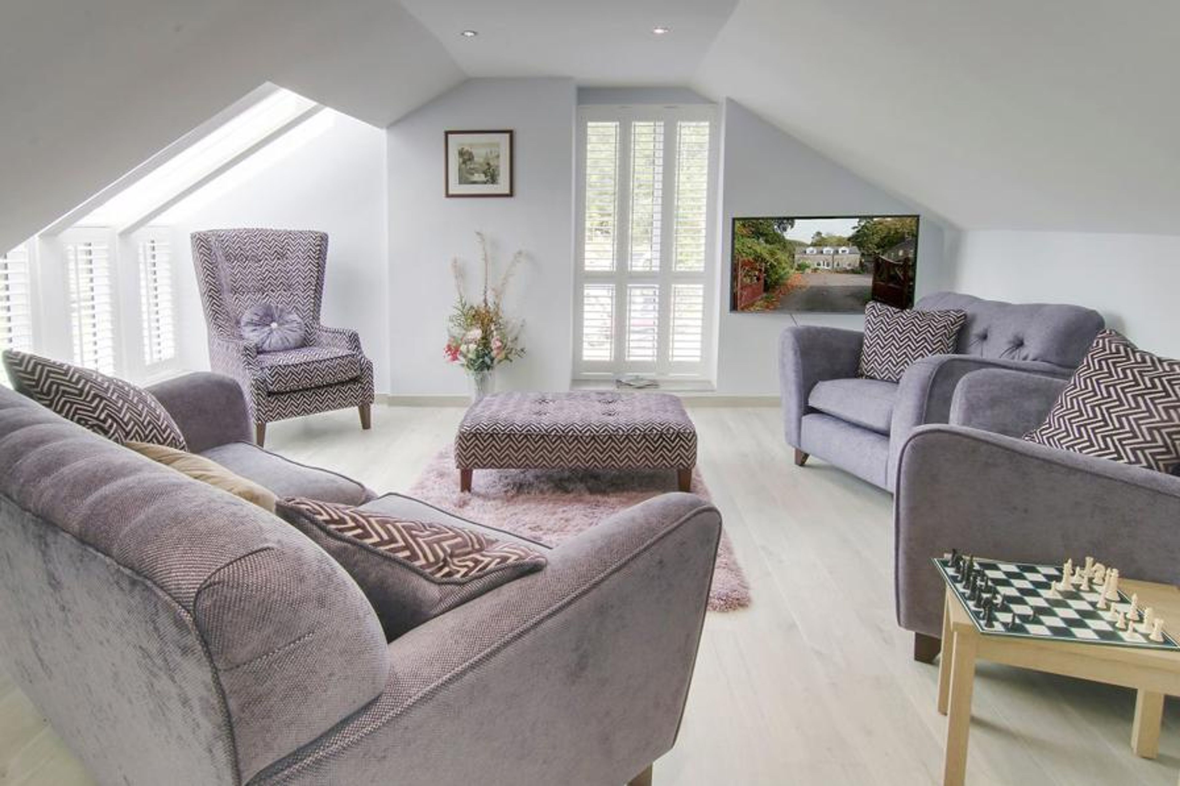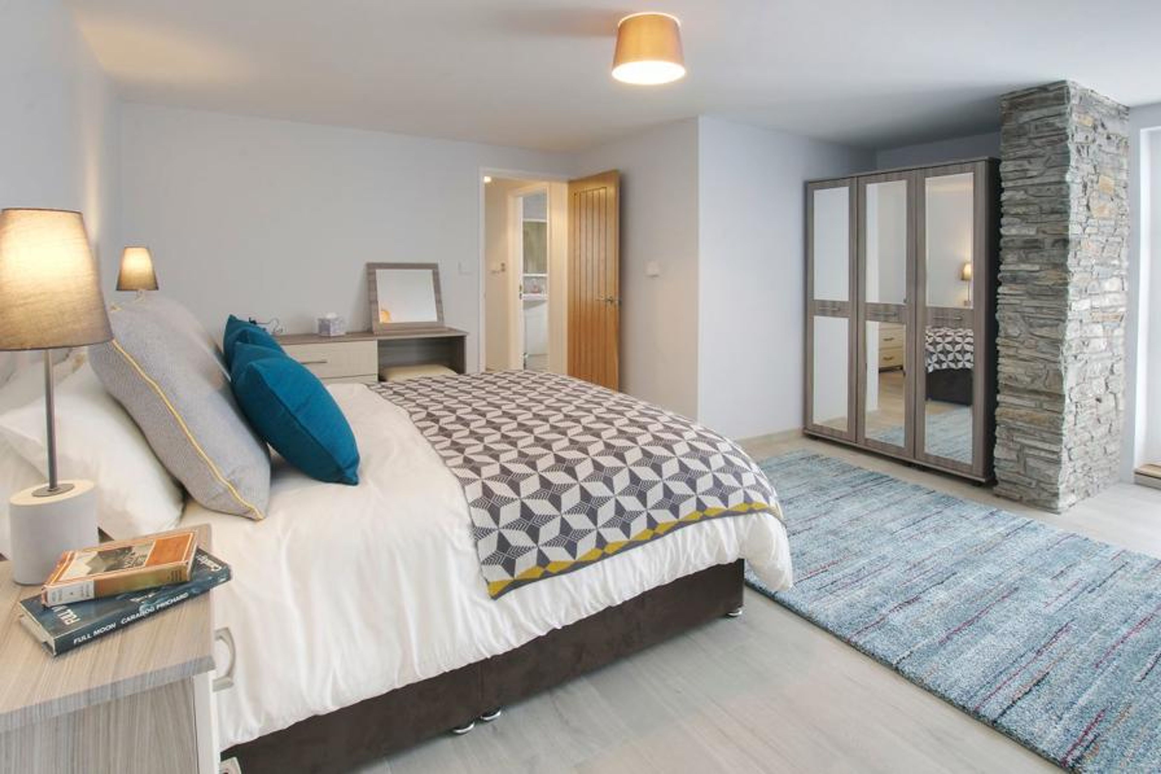 Sleeping six guests in luxurious comfort, the cottage boasts sumptuous furnishings throughout and a calm, neutral colour palette. The walls are decorated with beautiful local art by prominent artists. A display coffee table is filled with centuries old artefacts and curiosities found by metal detectorists at the farm over the years. One of the highlights is an old button which features a raven which was part of an army of ravens that protected a Welsh Prince of the Dark Ages from whom previous owners of the farm claim descent. You will be enthralled with the history of this place! This story is told in the Welsh medieval Tales of the Mabinogion and depicted in an art print by famed Lord of the Rings illustrator Alan Lee which hangs in the living room of the cottage. Despite all this history, the upstairs living area offers the contemporary wow factor and offers wonderful views of the estate. With a snazzy, brilliant white kitchen offering the very best in appliances, dining for six and a large living area brimming with comfy sofas and chairs, it is a wonderful modern space. Guests enjoy sitting in the reading chair in front of the floor-to-ceiling windows enjoying the scenery as well as watching the 150 channels available on the Smart television. There is also a useful toilet on the first floor.