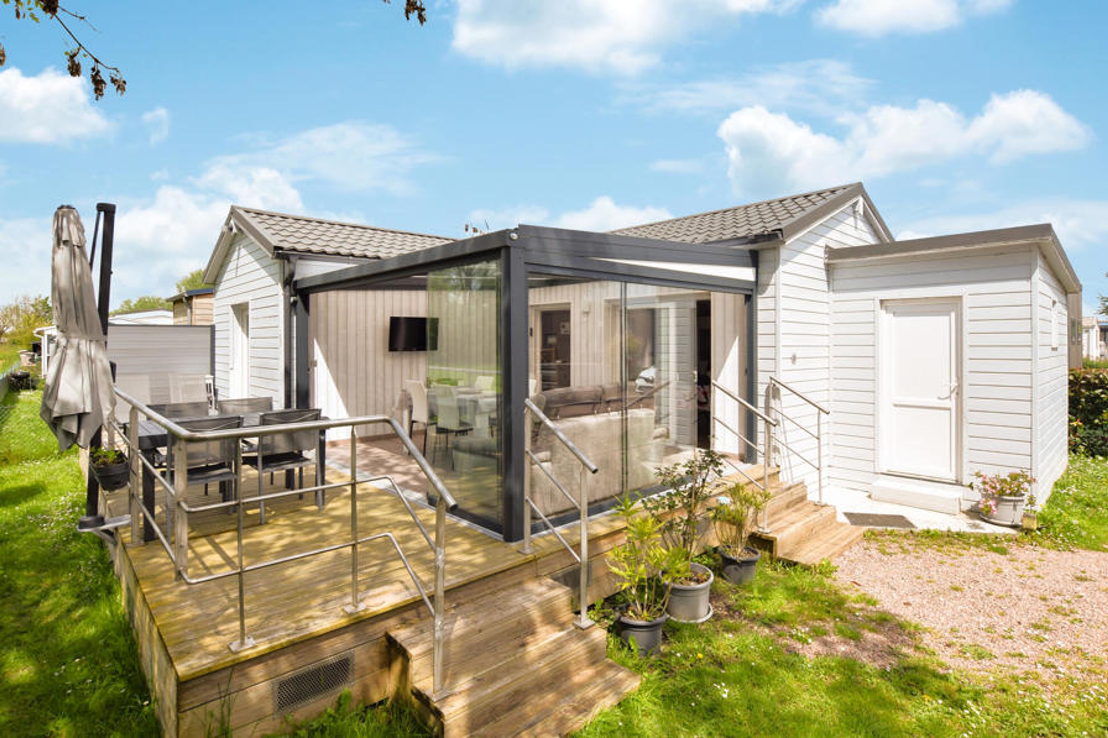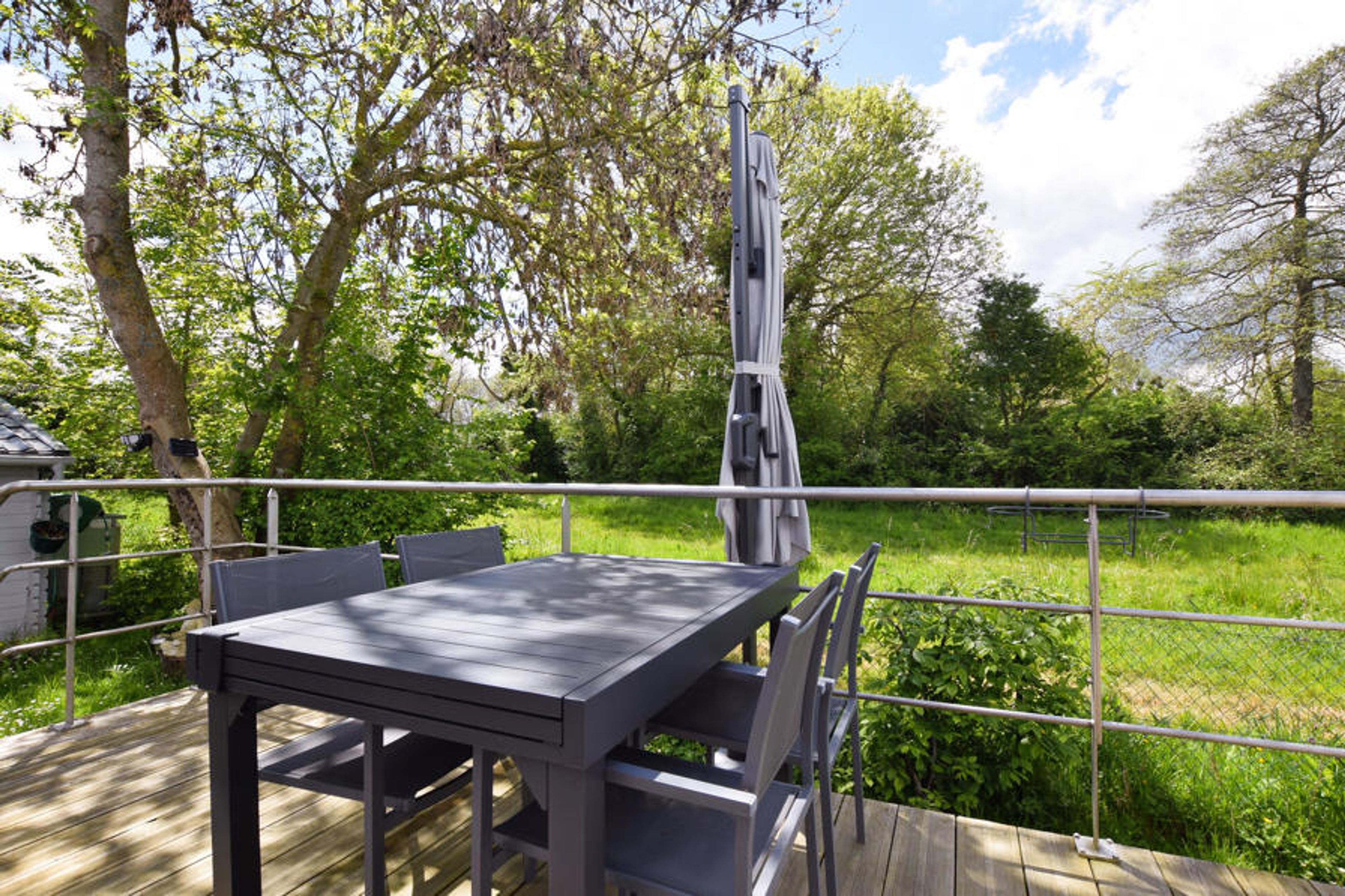 Wooden cottage with terrace and garden overlooking nature in a protected residential area.