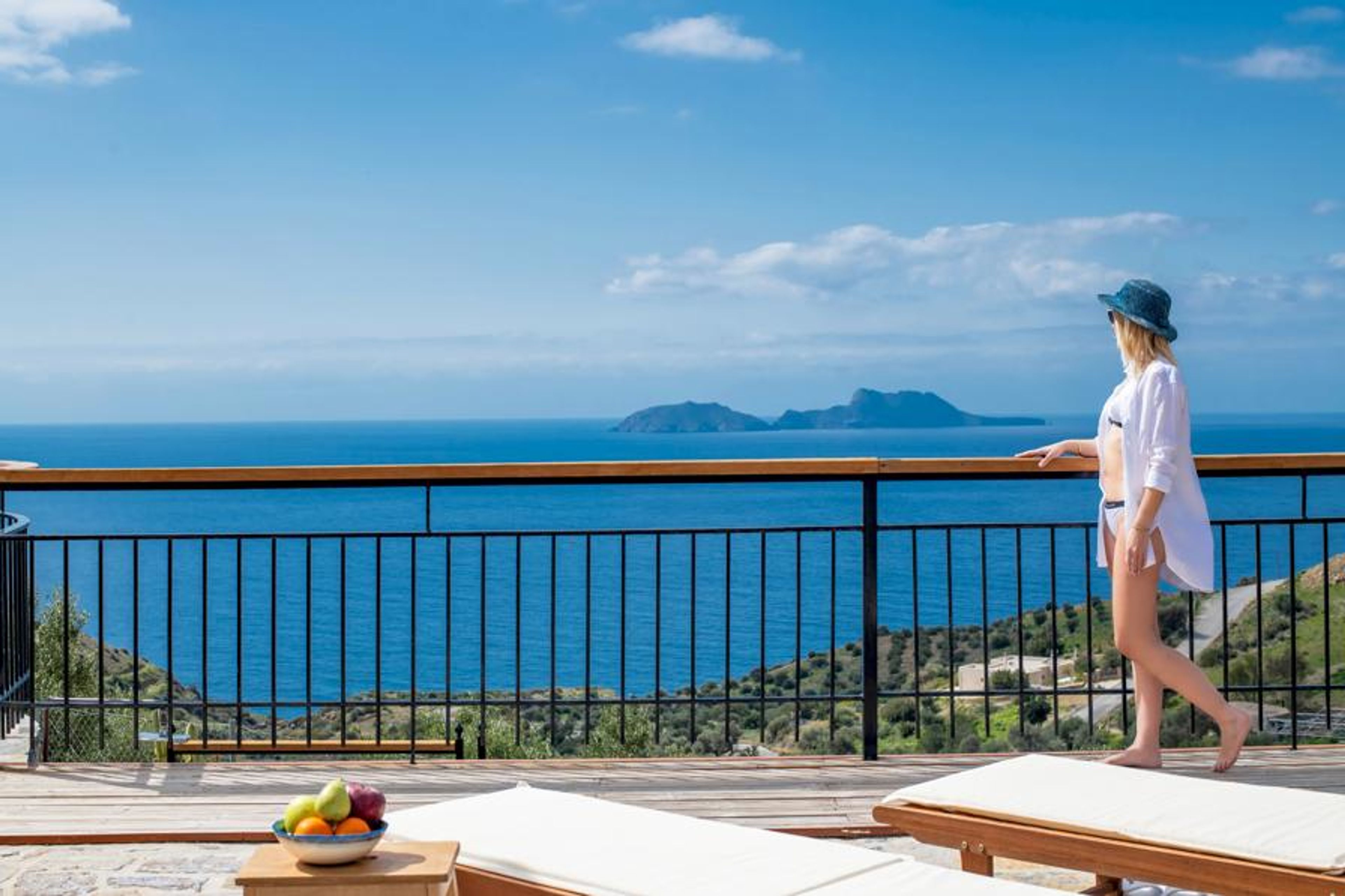 Outside, the private terrace offers stunning panoramic views, where guests can relax on sunbeds or enjoy the breathtaking sunset from the jacuzzi. Surrounded by olive trees, the suite provides a serene and natural setting, complemented by a barbecue area for outdoor dining under the Cretan sky.