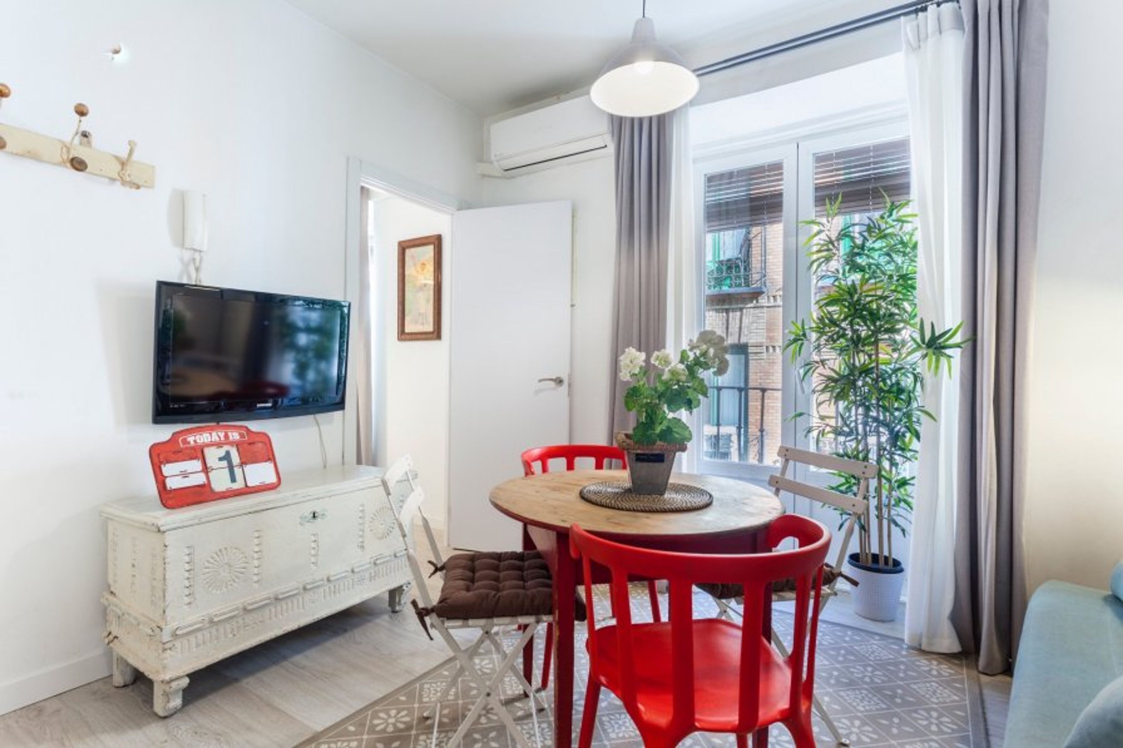 It is an exterior apartment with an independent bedroom. Both the living room and the bedroom have a small balcony facing the street, which makes it very bright.