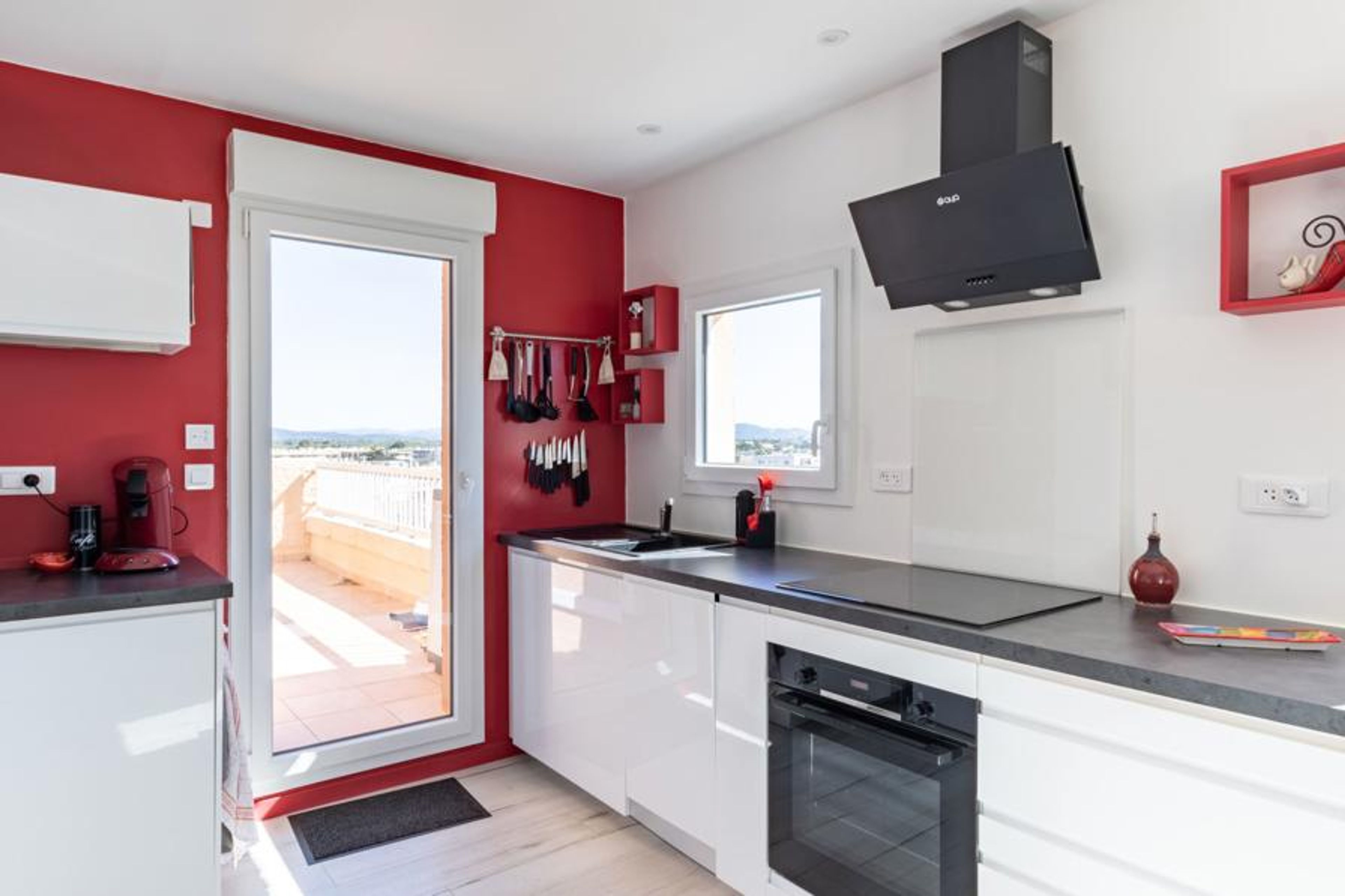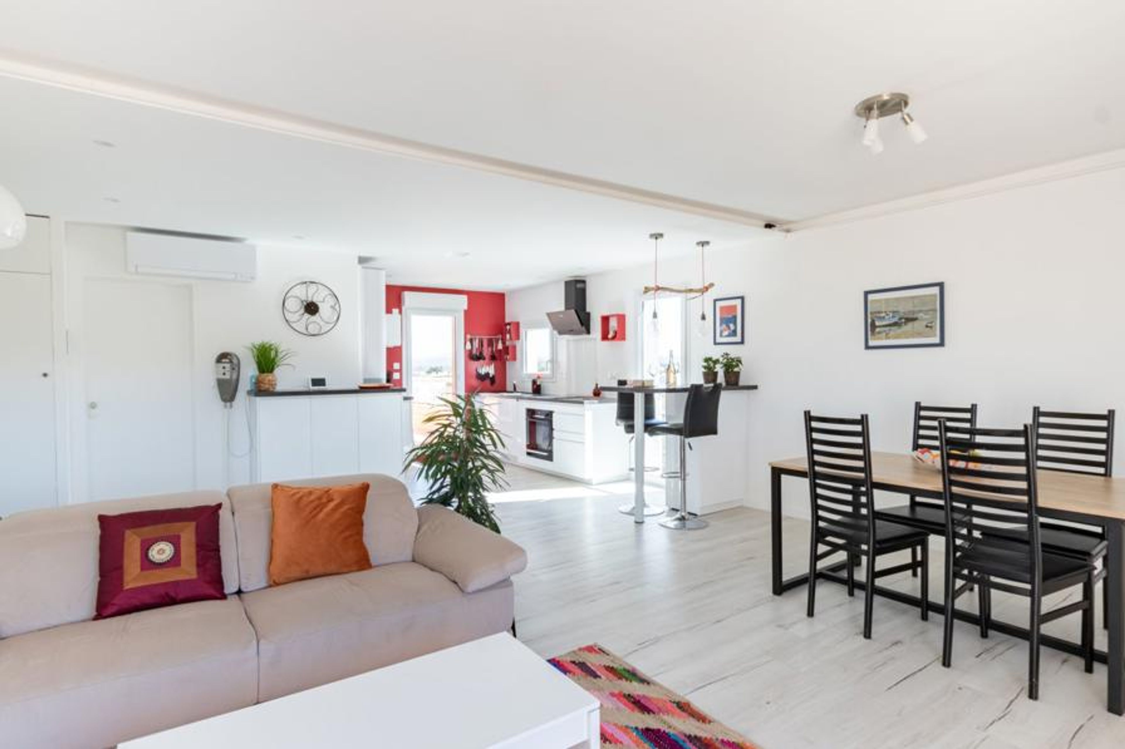 3-room apartment 80 m2 on 4th floor. Spacious, fully renovated in 2020, beautiful and modern furnishings: living/dining room with TV (flat screen), radio and air conditioning. Exit to the terrace. 1 room with 1 french bed (160 cm, length 200 cm), air conditioning. Exit to the terrace. 1 room with 1 french bed (140 cm, length 190 cm). Open kitchen (oven, dishwasher, 3 induction hot plates, toaster, kettle, microwave, freezer, electric coffee machine, Capsules for coffee machine (Senseo) extra). Exit to the terrace. Shower, sep. WC. Electric heating. Terrace 10 m2, terrace 12 m2. Terrace furniture. View of the countryside and the resort. Facilities: washing machine. Internet (WiFi, free). Please note: TV only FR. Smoke alarm. Offer by a private individual according to Art. 155, IV of CGI.