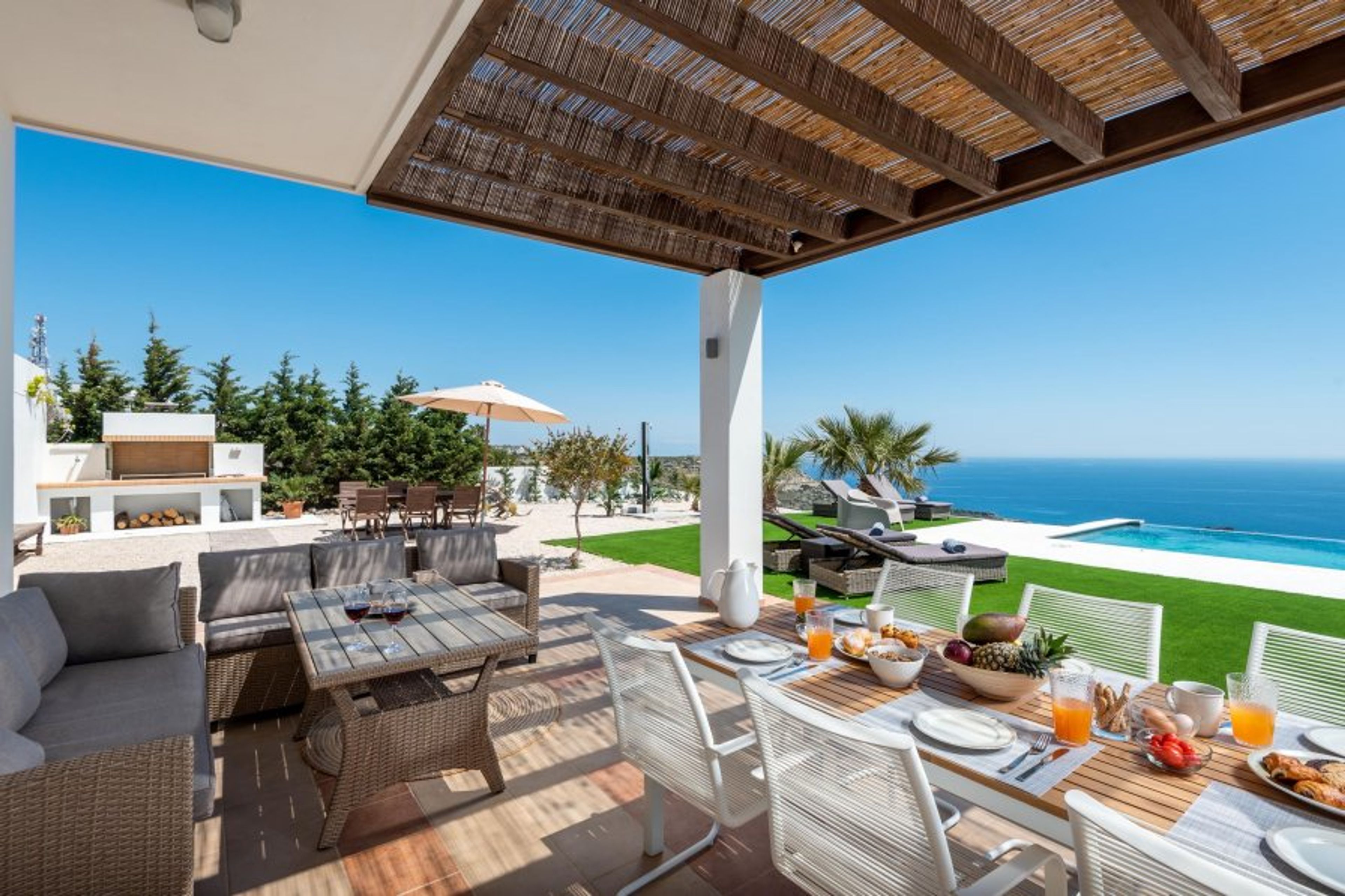 Outdoors, the villa is equally impressive as indoors. It offers garden surrounding the magnificent pool area that’s equipped with parasols and sun beds, creating the perfect setting for a relaxed time under the golden rays of the Rhodian sun. The villa offers a pergola with an incredible BBQ installation with a seating area where guests can enjoy a truly unique outdoor gathering. Also, there is a private parking.