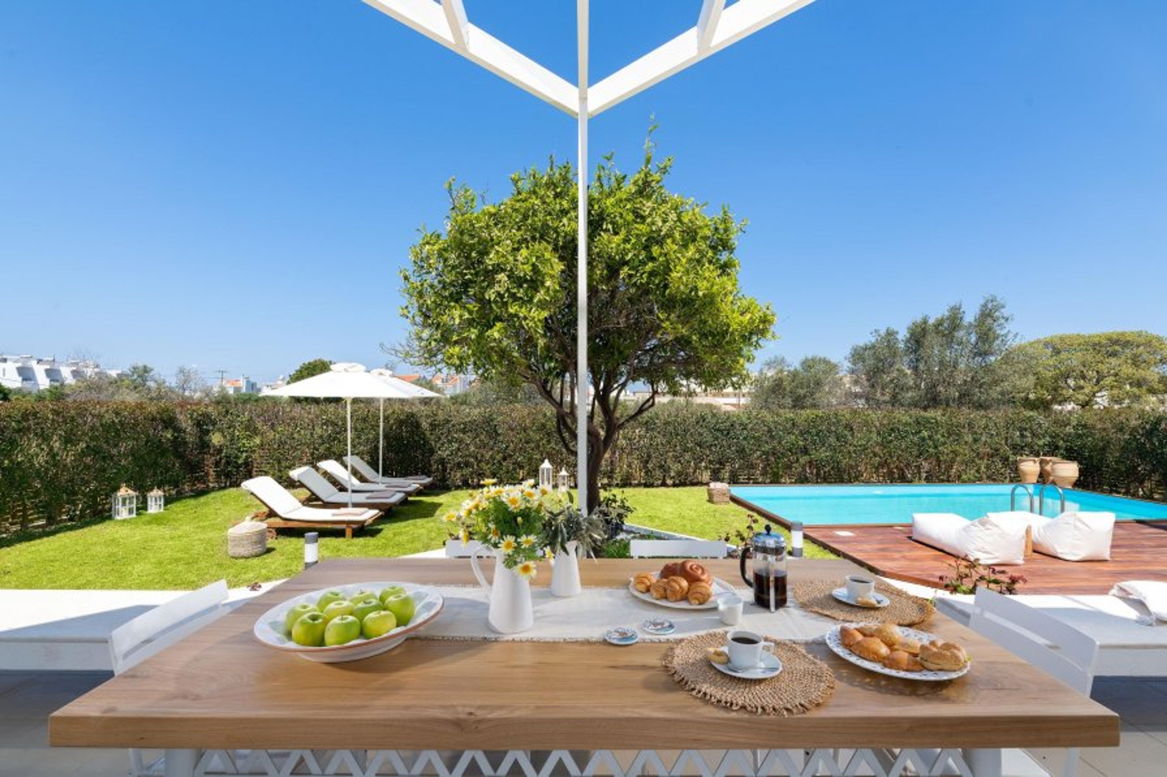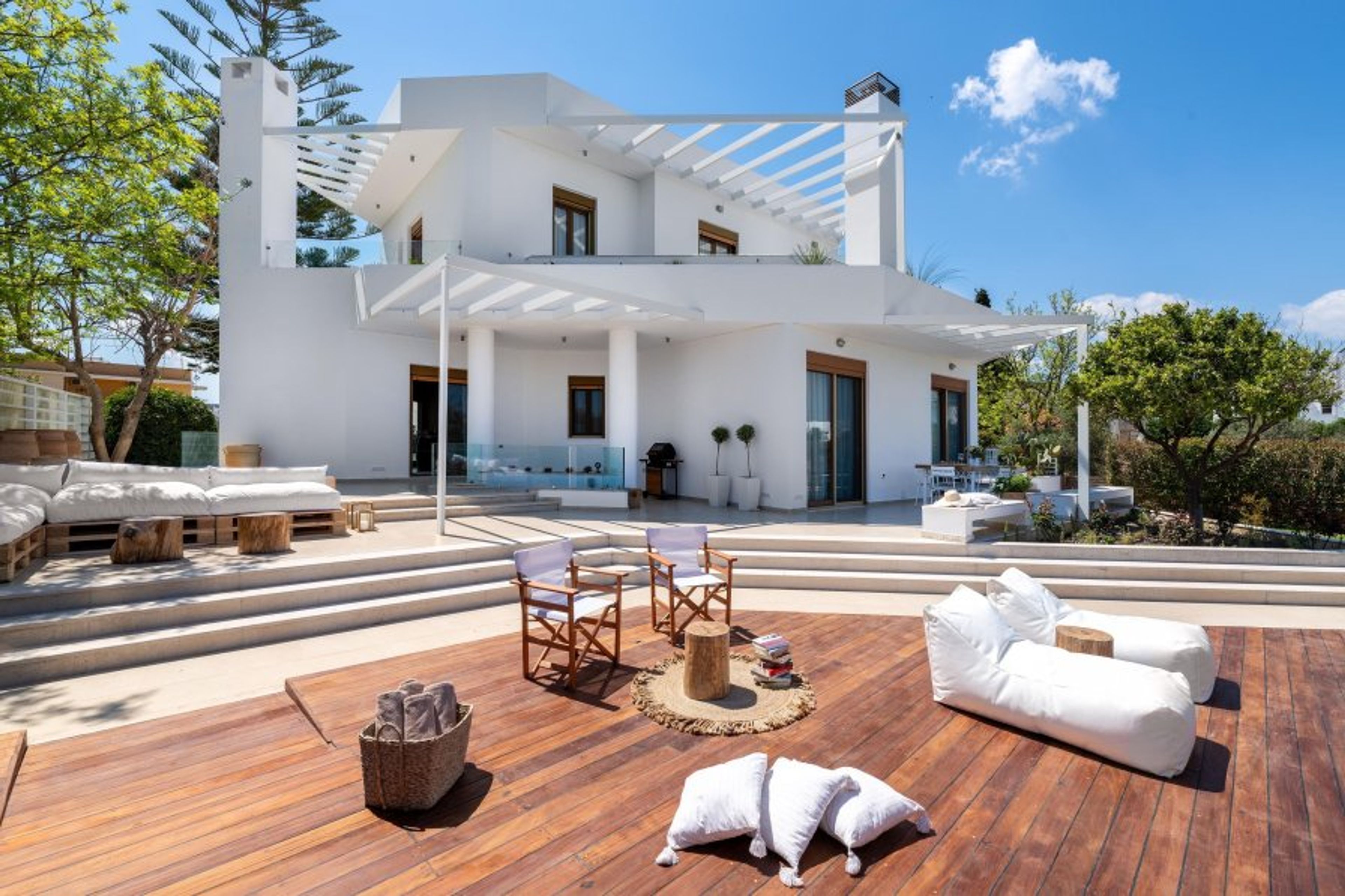 Love White Villa is a work of minimalistic brilliance featuring open-plan interiors. This spectacular villa has three fully air-conditioned bedrooms with quality mattresses and clean lines. Two of the bedrooms are on the first floor and have fantastic balconies. The oversized master bedroom has a king-sized bed and a cozy living room in white tones. It provides an ensuite master bathroom with a hot tub and a rain shower. The second bedroom, in a pearl-white palette, has a double bed and an ensuite bathroom with a hot tub and a rain shower. Both incredible bedrooms own walk-in closets. On the ground floor, there’s an open-plan huge kitchen which is fully equipped and suitable for any meal preparation. There are multiple seating areas where you can enjoy a meal. Also, there is a charming living room in white tones with a smart TV and a modern marble fireplace. There’s a wc. In addition, there are plenty of smart TVs and free Wi-Fi access throughout the property as well as floor heating. Love White villa continues to surprise you as you go downstairs, to the sophisticated basement. It has a unique bedroom with a double bed and a modern living room with a sofa that easily converts into a comfy double sofa bed. Also, at the same level, there is a second fully equipped kitchen and a laundry room with a washing machine and a dryer. In addition, there is a stylish bathroom with a hot tub and a rain shower. Most of the shutters are electric. In the outside area, guests can enjoy the dreamy private swimming pool surrounded by lovely gardening. There are plenty of sun loungers where you can relax and work on your tan under the rays of the Aegean Sun. Of course, the beach is found within a 5-minute walk so you can easily spend your time there. Also, there’s a BBQ installation along with a seating area to enjoy a gathering with your friends or family. Guests should know that there’s a private parking area for two cars as well as that a central security alarm is installed throughout the house.