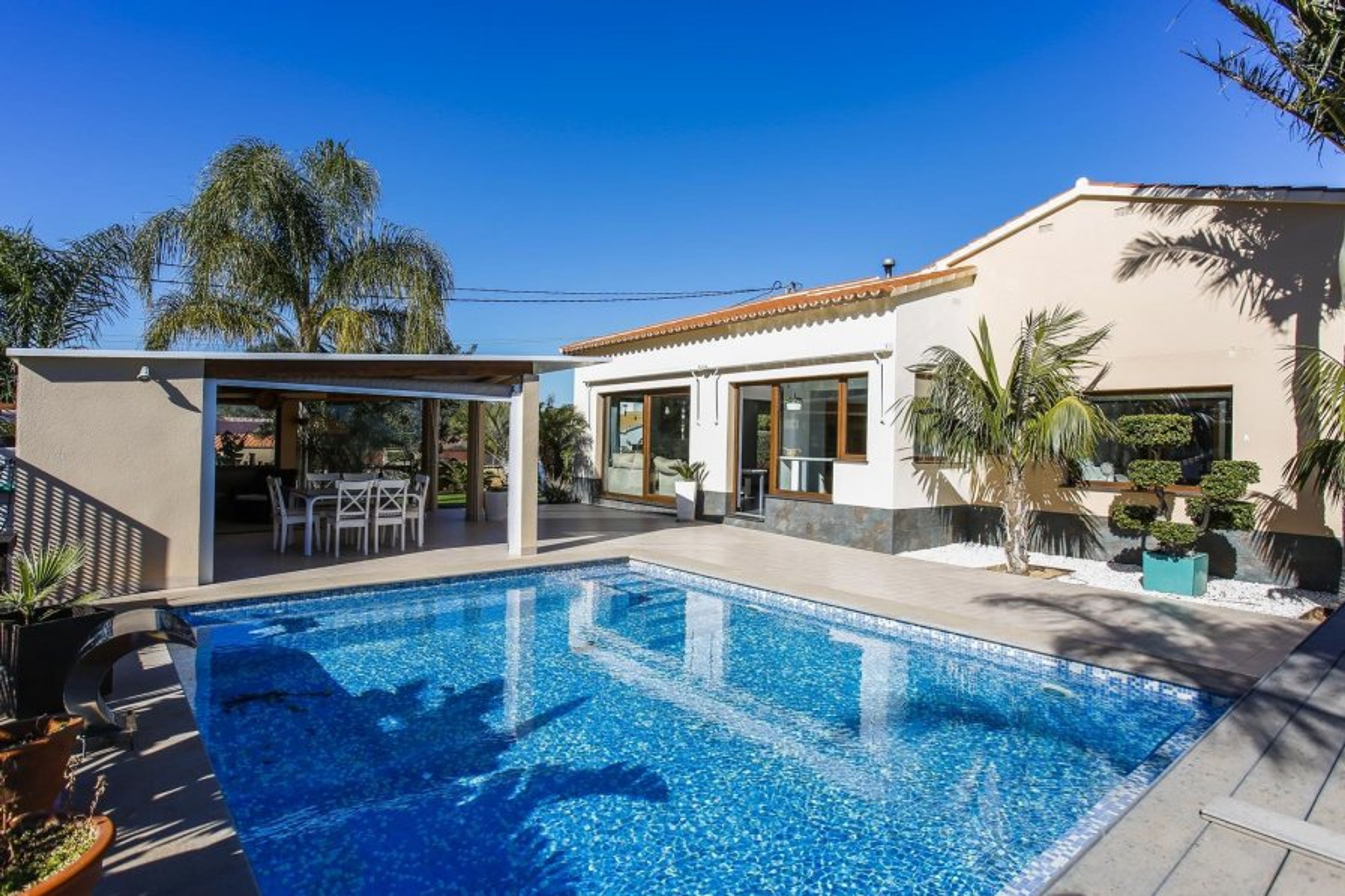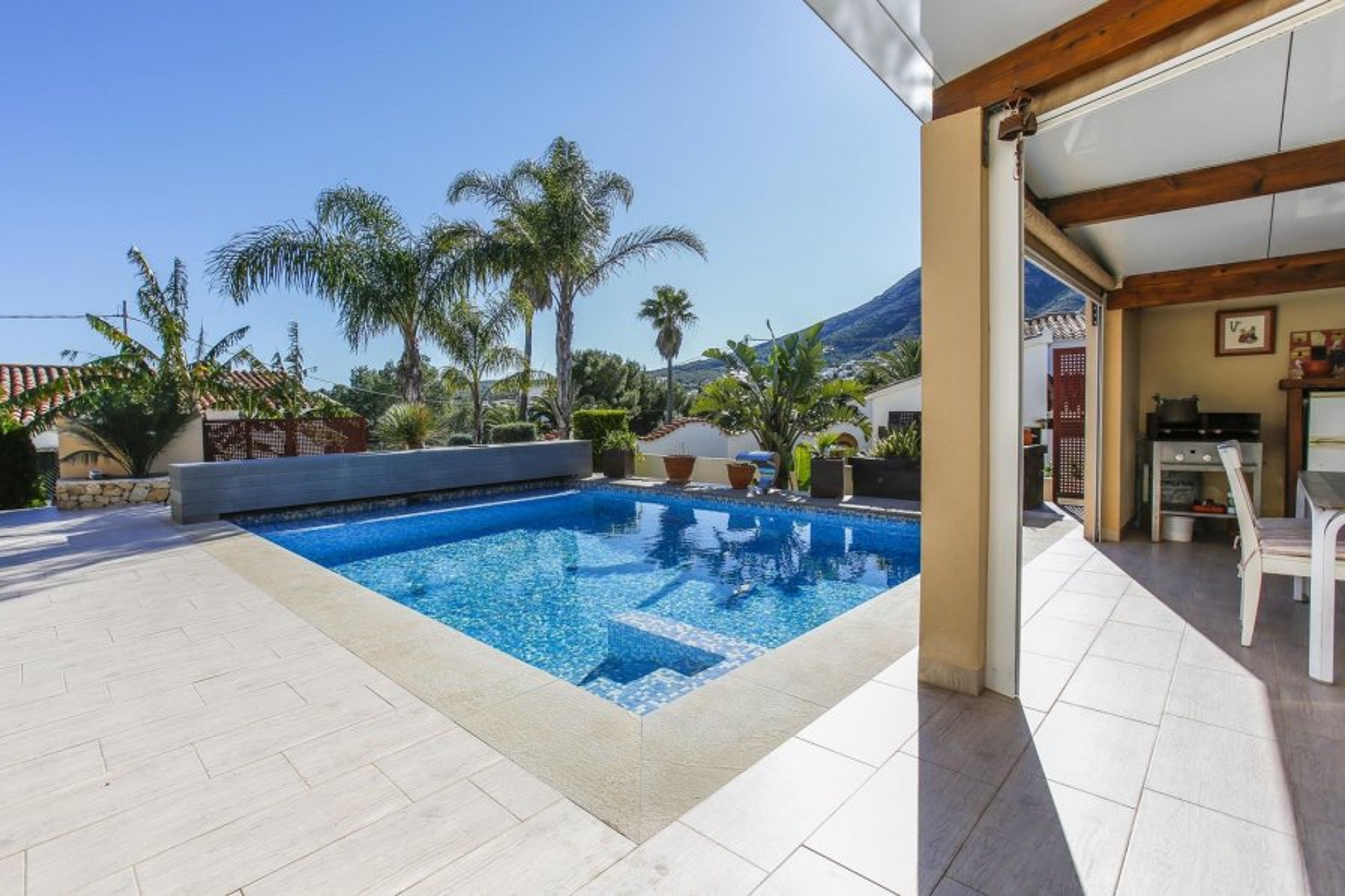 Villa for rent in Denia, located in the Montgó area. Very quiet area, ideal to relax and rest. Completely renovated villa with a beautiful garden, private pool and outdoor dining area with barbecue next to it. The interior of the Villa is distributed on one floor, very comfortable. with 3 double bedrooms, 2 bathrooms with shower, a nice bright living-dining room with access to the pool-barbecue area. Denia has a lot to offer. Located about 100 km from Valencia and Alicante, from Denia you can discover the Costa Blanca both along the sea and inland landscapes, fields of orange and almond trees, charming villages, natural parks. You can also visit the amusement parks of Benidorm. Denia has about 20 km of coastline with sandy beaches, pebble beaches or rocky coves, for sunbathing or diving. You can practice all kinds of water sports, hiking in the Montgo natural park, tennis, golf, cycling, etc. From Denia the ferry leaves for Ibiza and boats for trips along the coast. In Denia you eat very well. Its many restaurants offer tasty and healthy Mediterranean cuisine to satisfy all palates, whether in the typical fishing district, the pedestrian streets around the castle or the beautiful terraces by the sea. It is an ideal place for long walks on the beach, in the port or towards the Castle and typical fishermen's quarter. It has a complete commercial offer to go shopping. Denia, a place to enjoy: its motto is “Denia, you know how to live!”