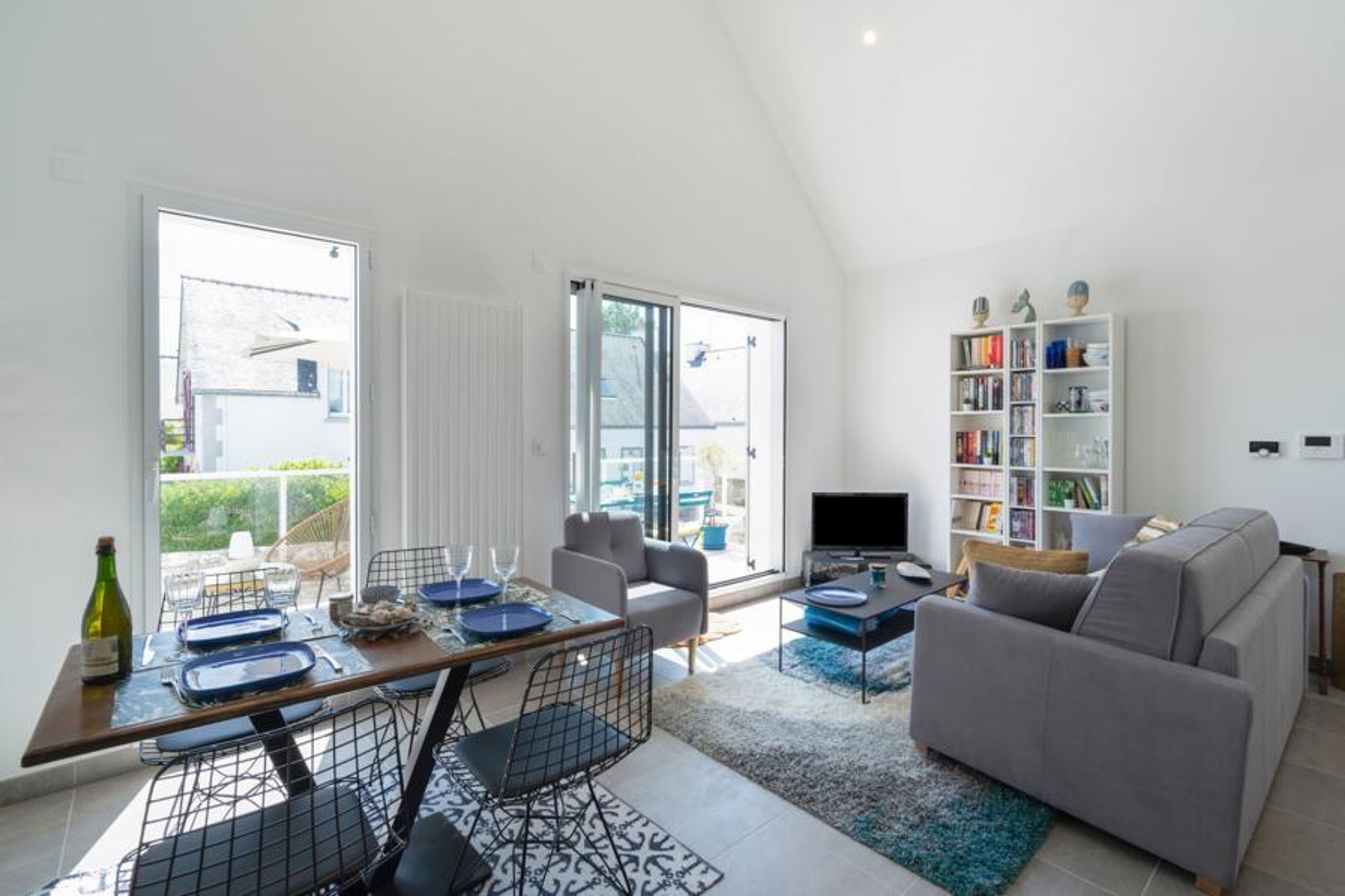 "Le Clos Moguer", 2-room apartment 45 m2 on 1st floor. Living/dining room with 1 double sofabed (1 x 160 cm, length 190 cm), TV (flat screen), radio, CD-player and DVD. Exit to the terrace. 1 room with 2 beds (90 cm, length 190 cm). Kitchen (oven, dishwasher, 3 induction hot plates, toaster, kettle, electric coffee machine, Capsules for coffee machine (NESPRESSO) extra, combination microwave). Shower, sep. WC. Gas heating. Large terrace 10 m2. Terrace furniture. Facilities: washing machine, dryer. Internet (WiFi, free). Parking space n 21. Please note: smoke alarm. Offer by a private individual according to Art. 155, IV of CGI. 56186 000232 AW