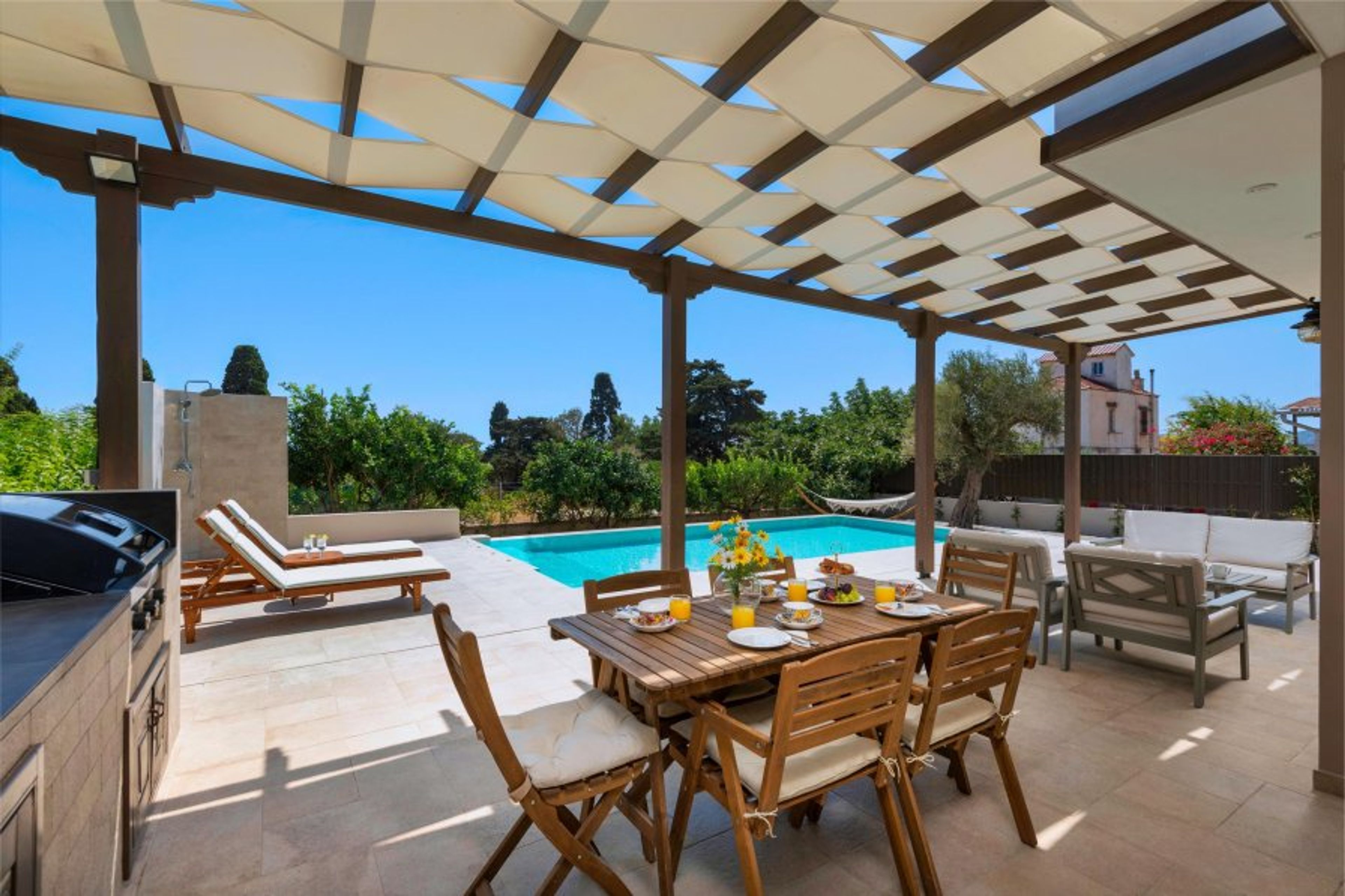 This stunning villa has 2 airconditioned bedrooms in a great design. There is an exceptional bedroom with double bed, and a bedroom with 2 single beds. Also, there are 2 single sofa beds in the living room. There is one stylish bathroom with a shower. The fully equipped kitchen is beautifully decorated and is accompanied by the living area. There’s free WIFI access throughout the property. Outdoors, there’s a fantastic private swimming pool where you can relax under the Aegean sun. This villa has everything you might need to feel comfortable and at home. There’s a BBQ facility where you can prepare al fresco meals and enjoy a gathering with your loved ones at the outdoor dining area.