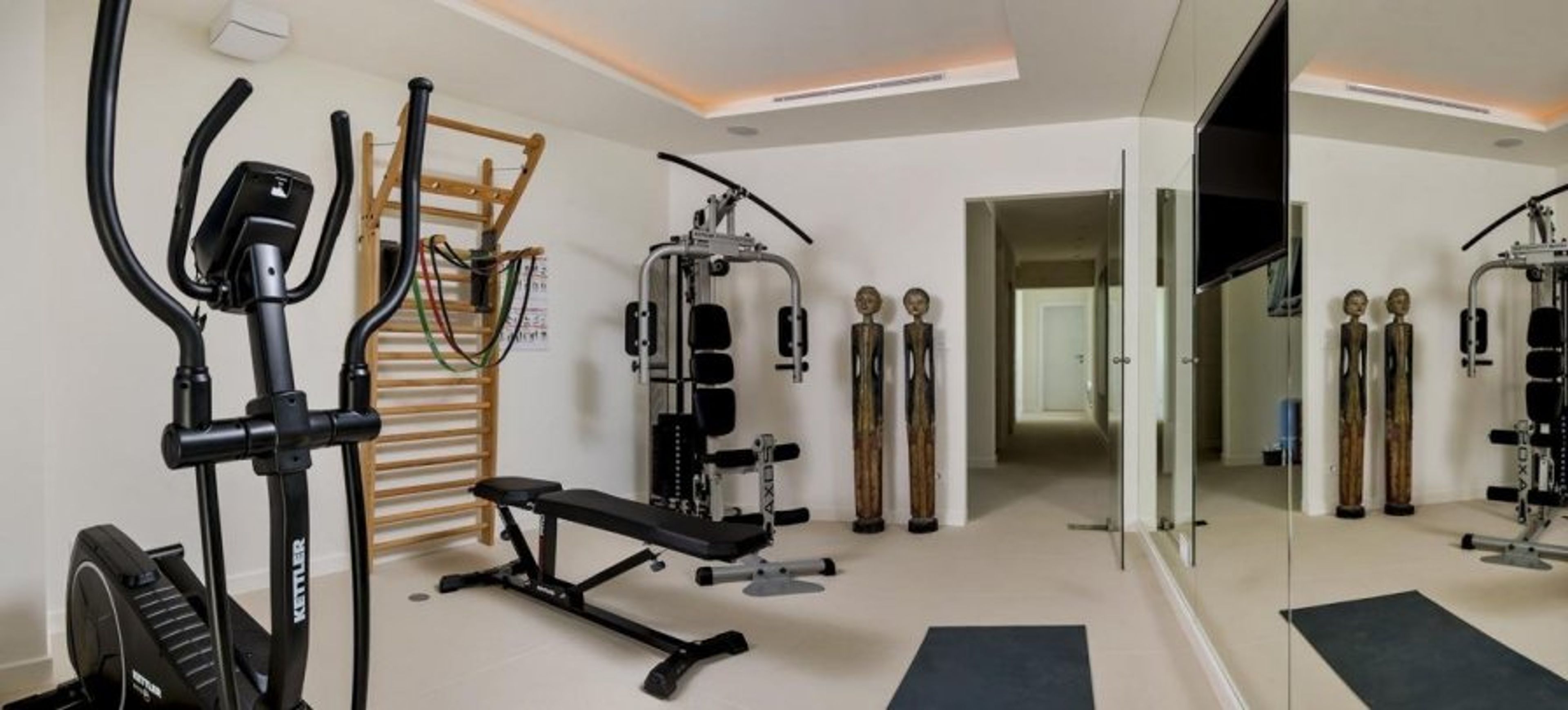 For those who prefer a more active relaxation, the gym room is perfect, offering a flat-screen TV, mirror wall, and top-quality equipment. If you prefer to melt your worries away, the sauna is the place for you, or maybe just taking a dip in the swimming pool and gazing out to sea. The villa offers something for everyone, a truly luxurious stay away.