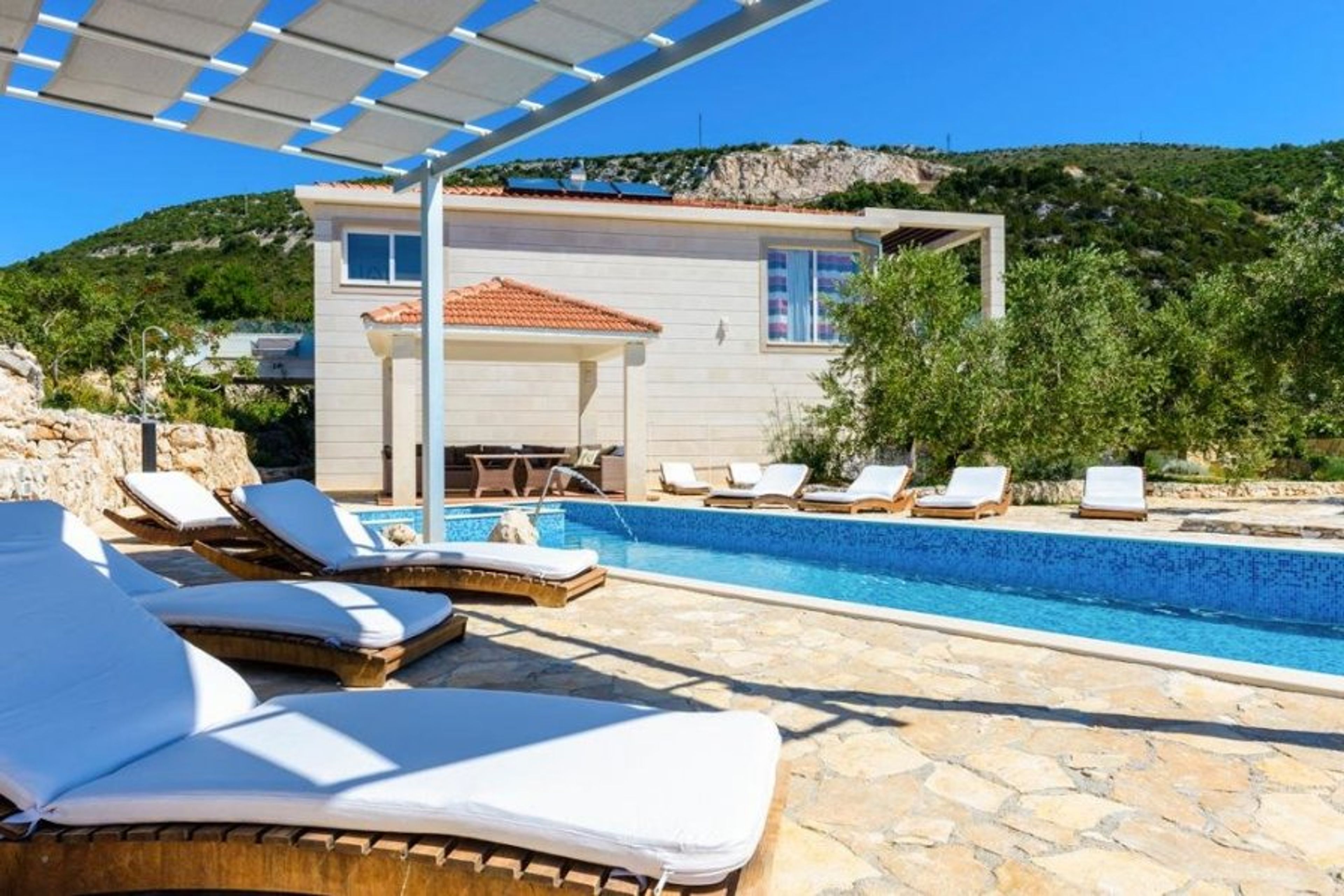 The villa has five bedrooms and bathrooms, accommodating up to thirteen guests.