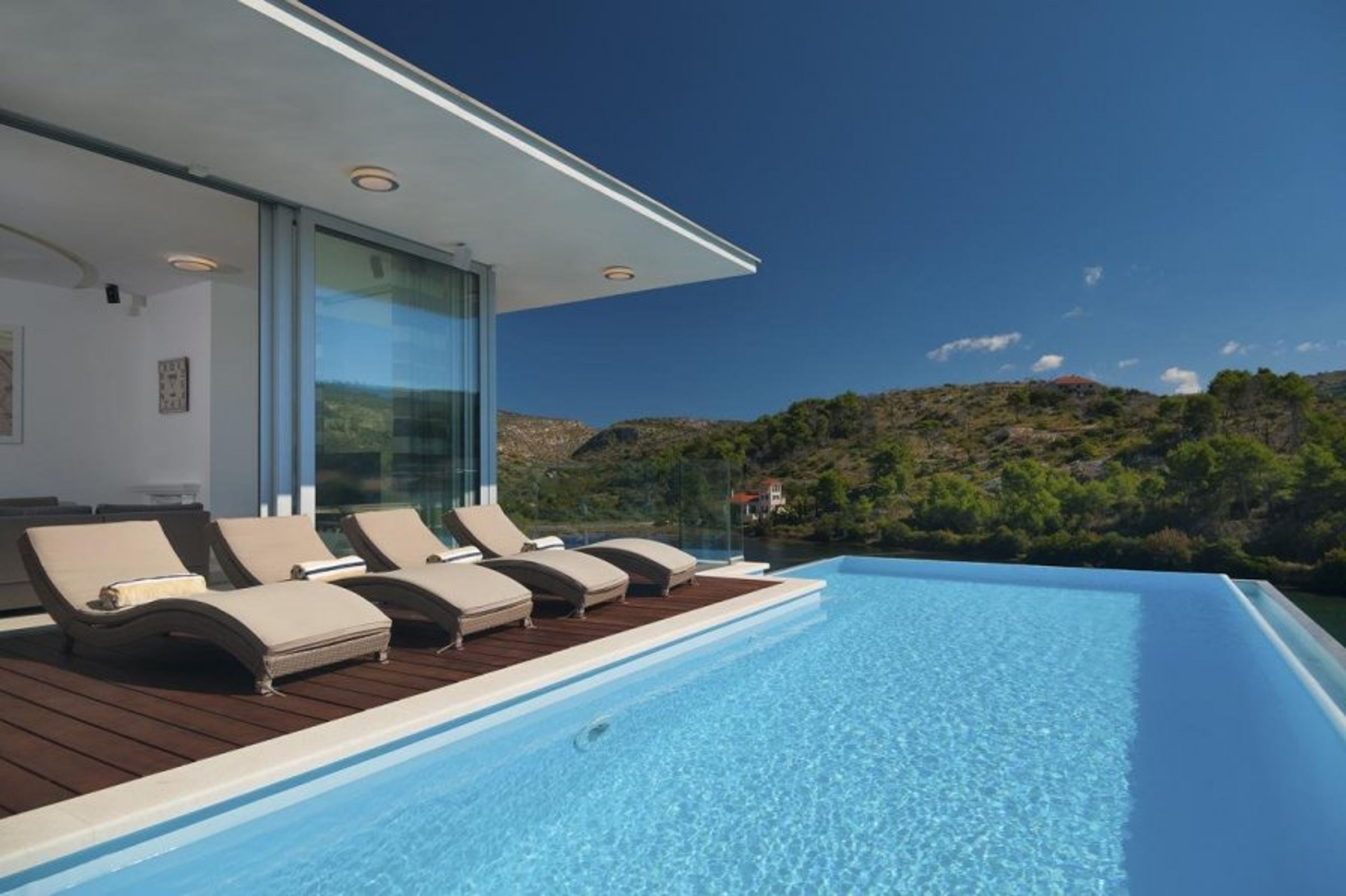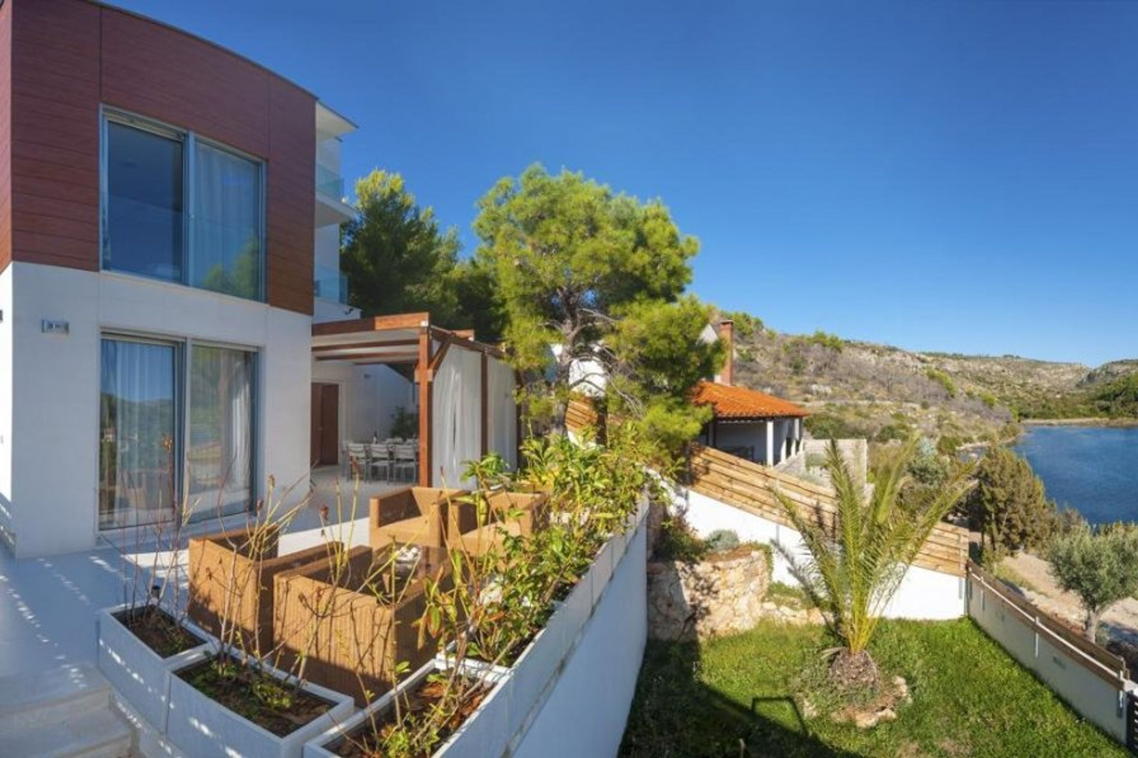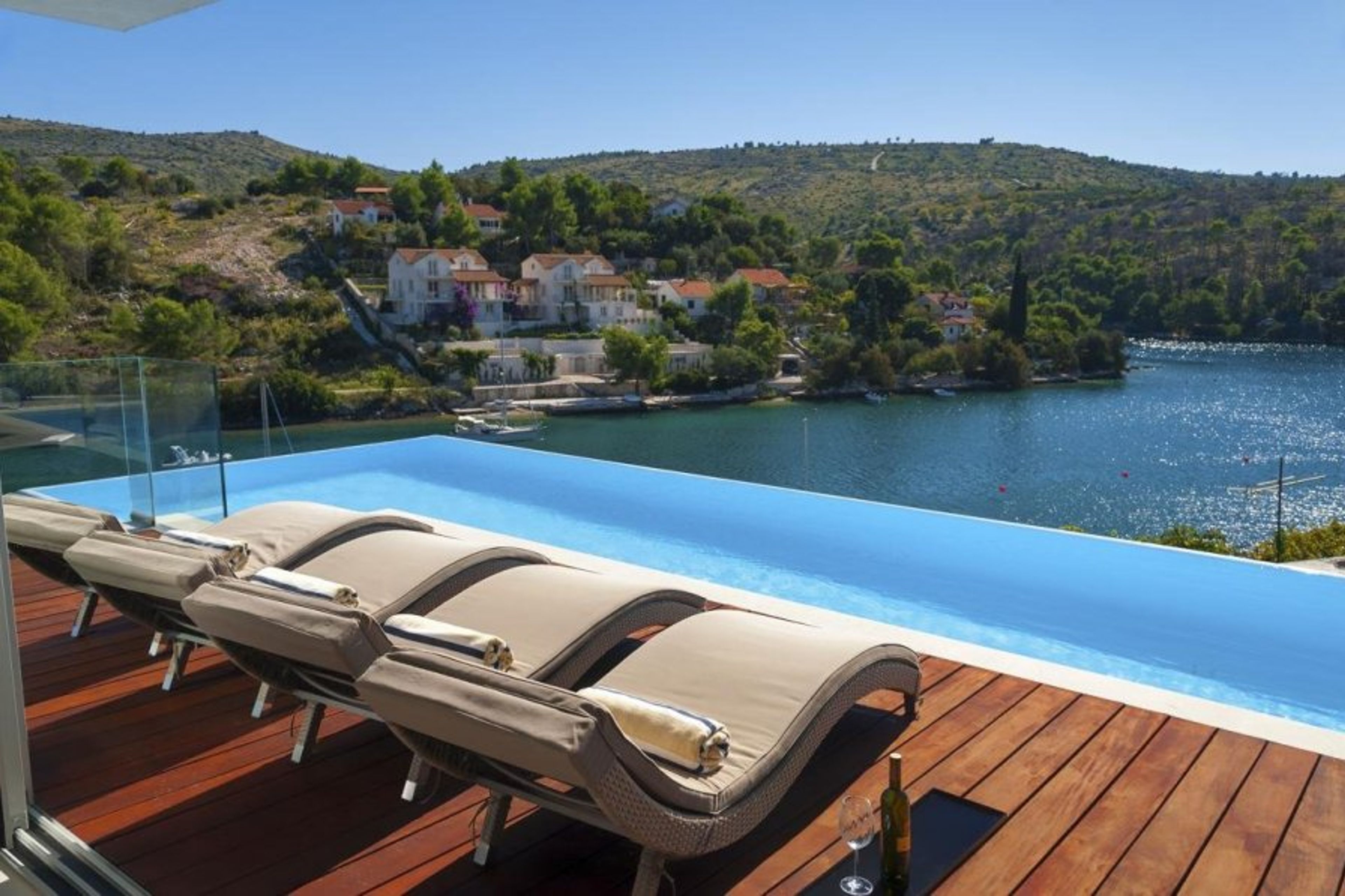 From the lovely hillside location, guests can enjoy stunning panoramic views of the magnificent Adriatic Sea through glass doors.