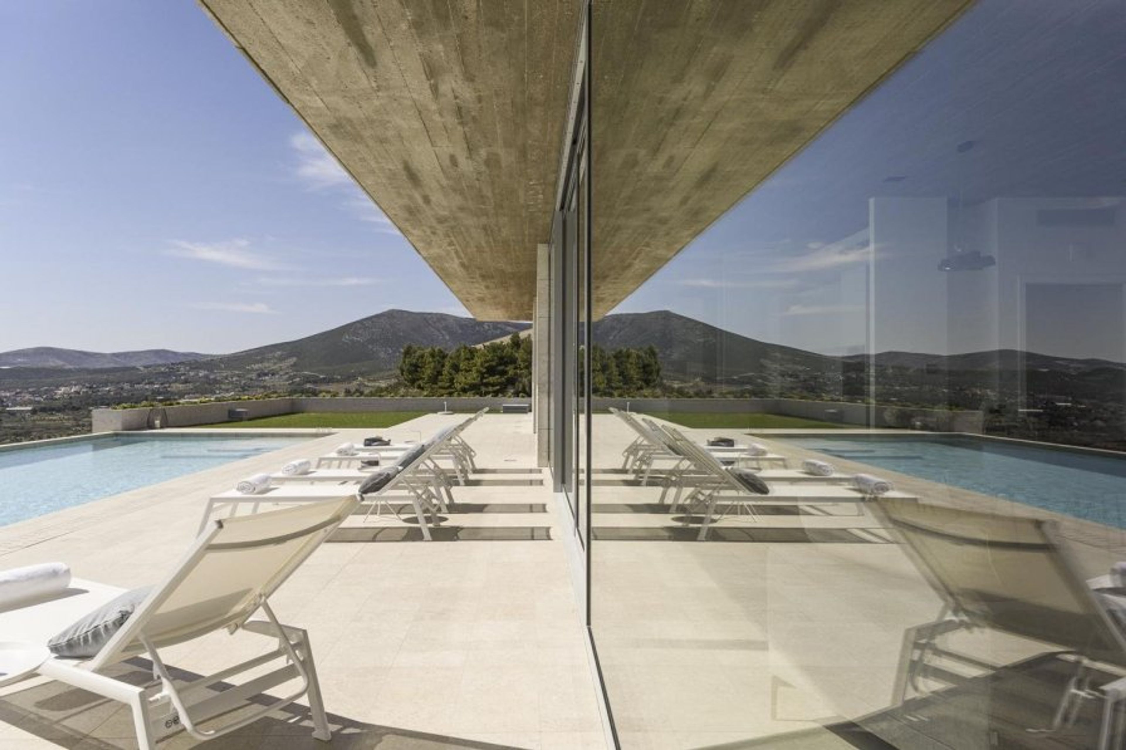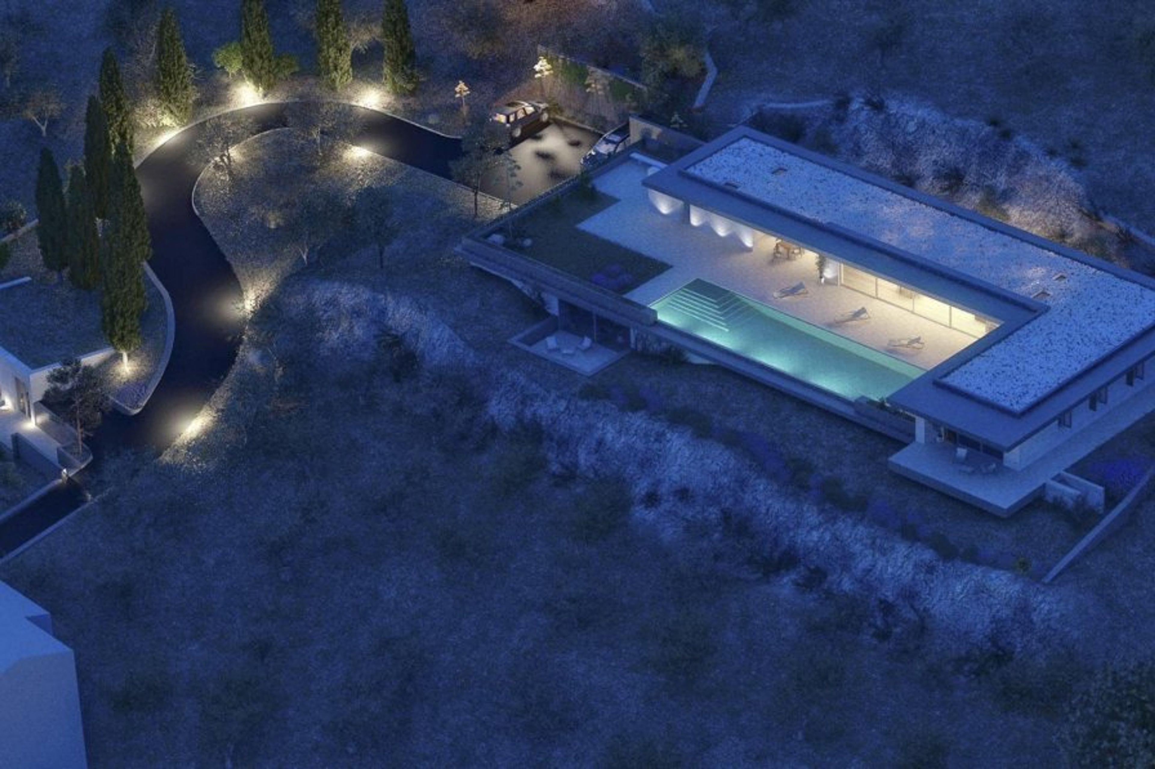 In the main building, guests can find a fully equipped kitchen, a spacious living room and dining area, an upper terrace, and 4 bedrooms and 4 bathrooms, all of which are decorated in modern, minimalistic style.