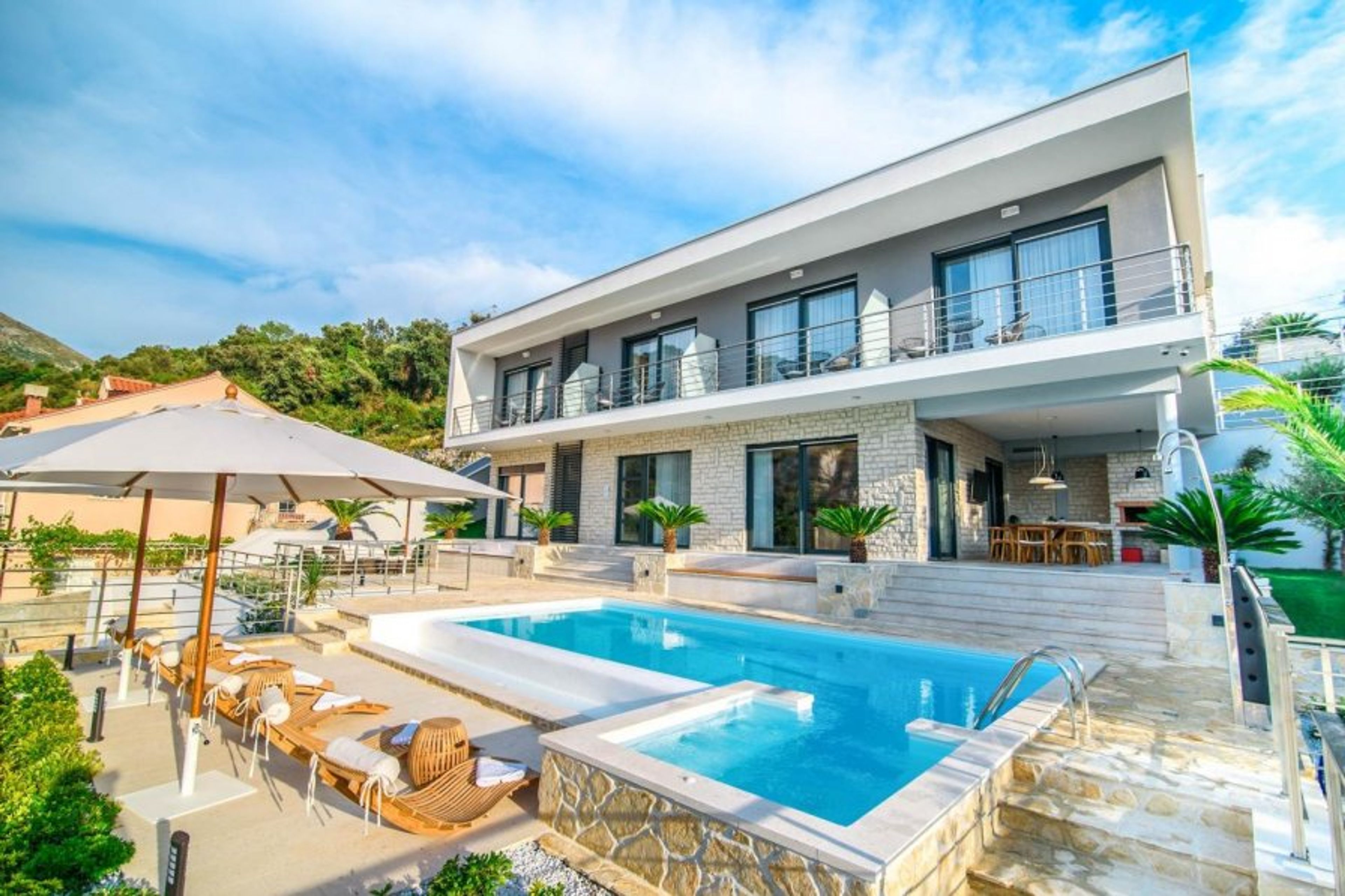 It features a private swimming pool with a poolside lounge area with comfortable sunbeds and parasols, an outdoor shower, a jacuzzi, and a covered outdoor dining area with a BBQ.