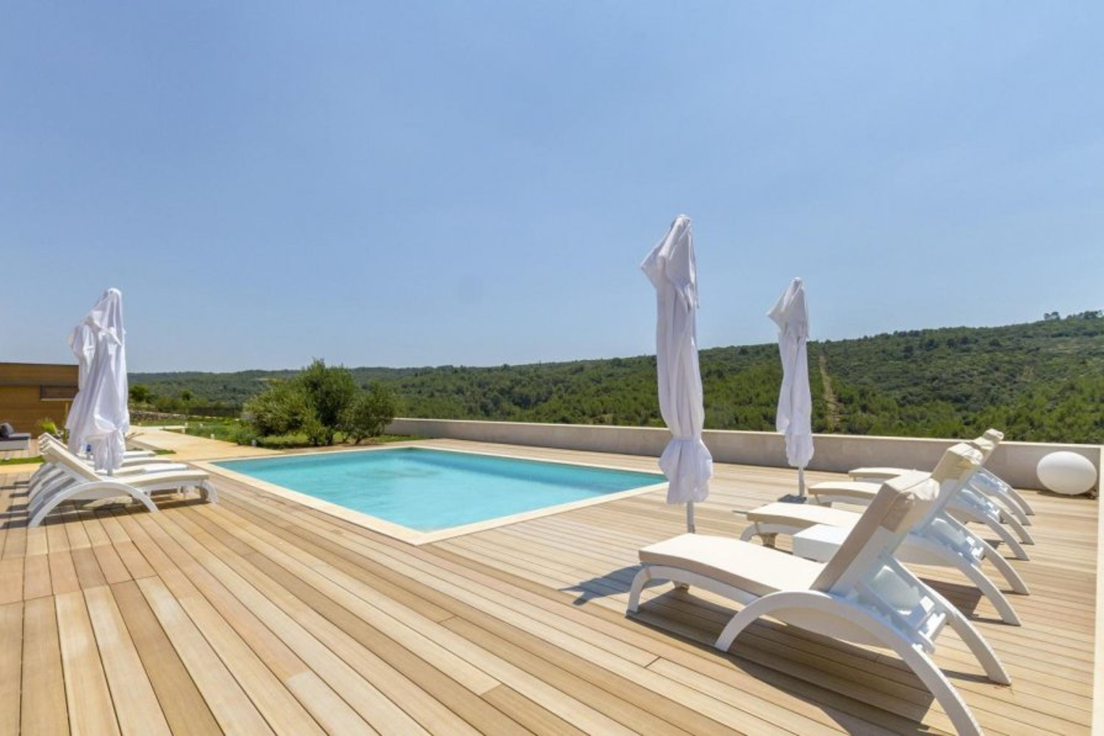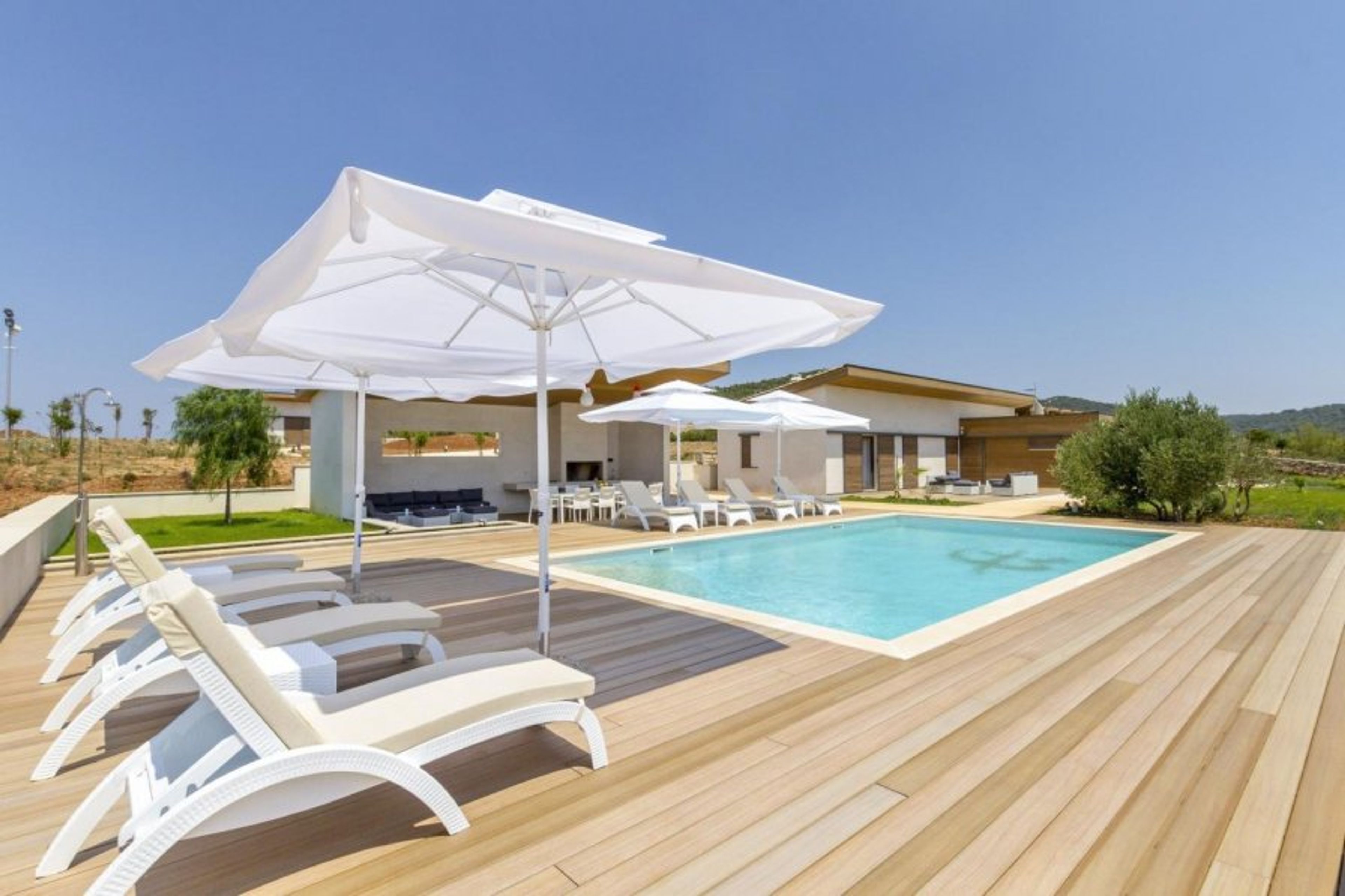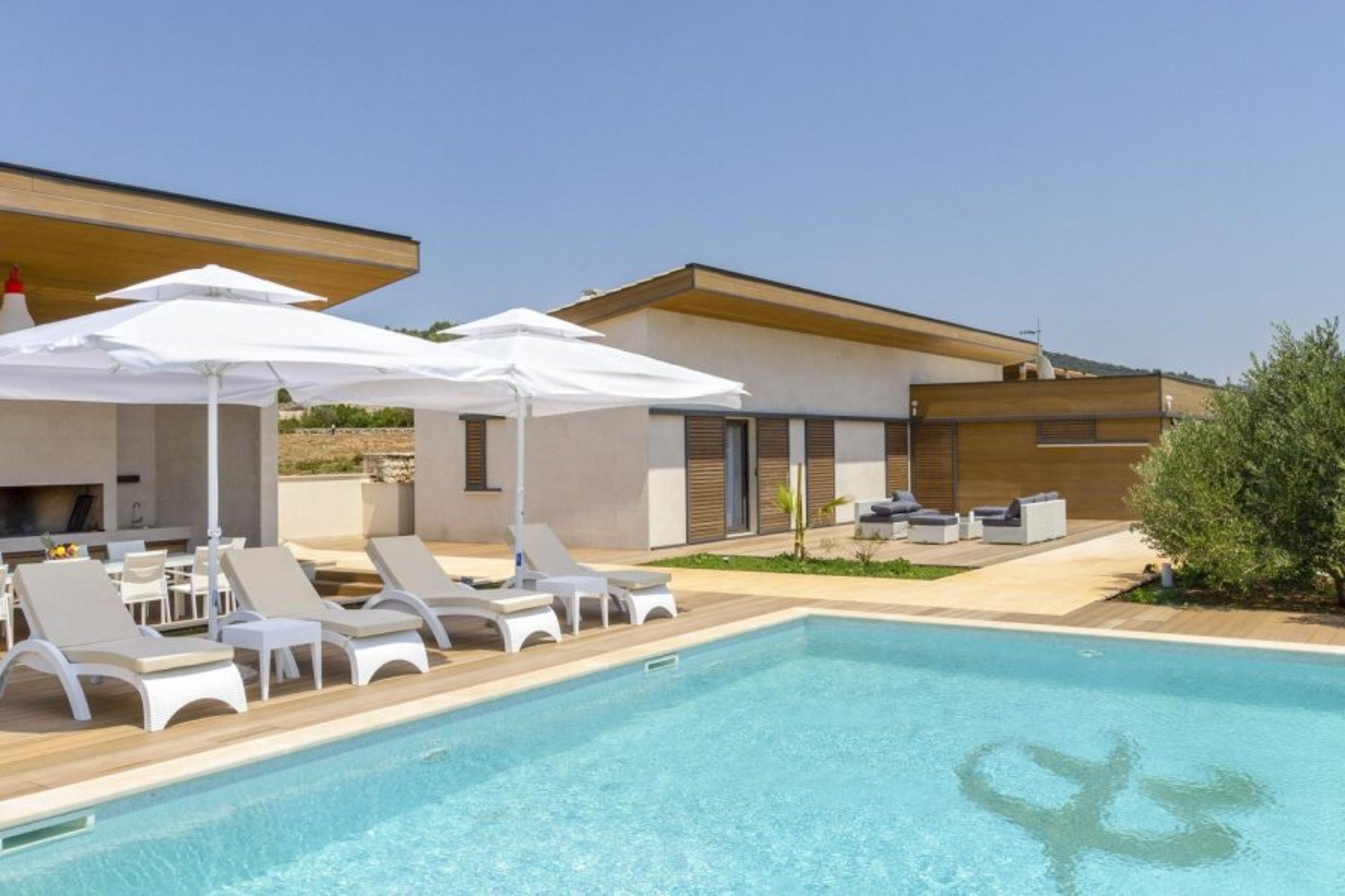 The villa has five stylish bedrooms with double beds and en-suite bathrooms, a fully equipped kitchen, and a modernly decorated living room with a dining area.