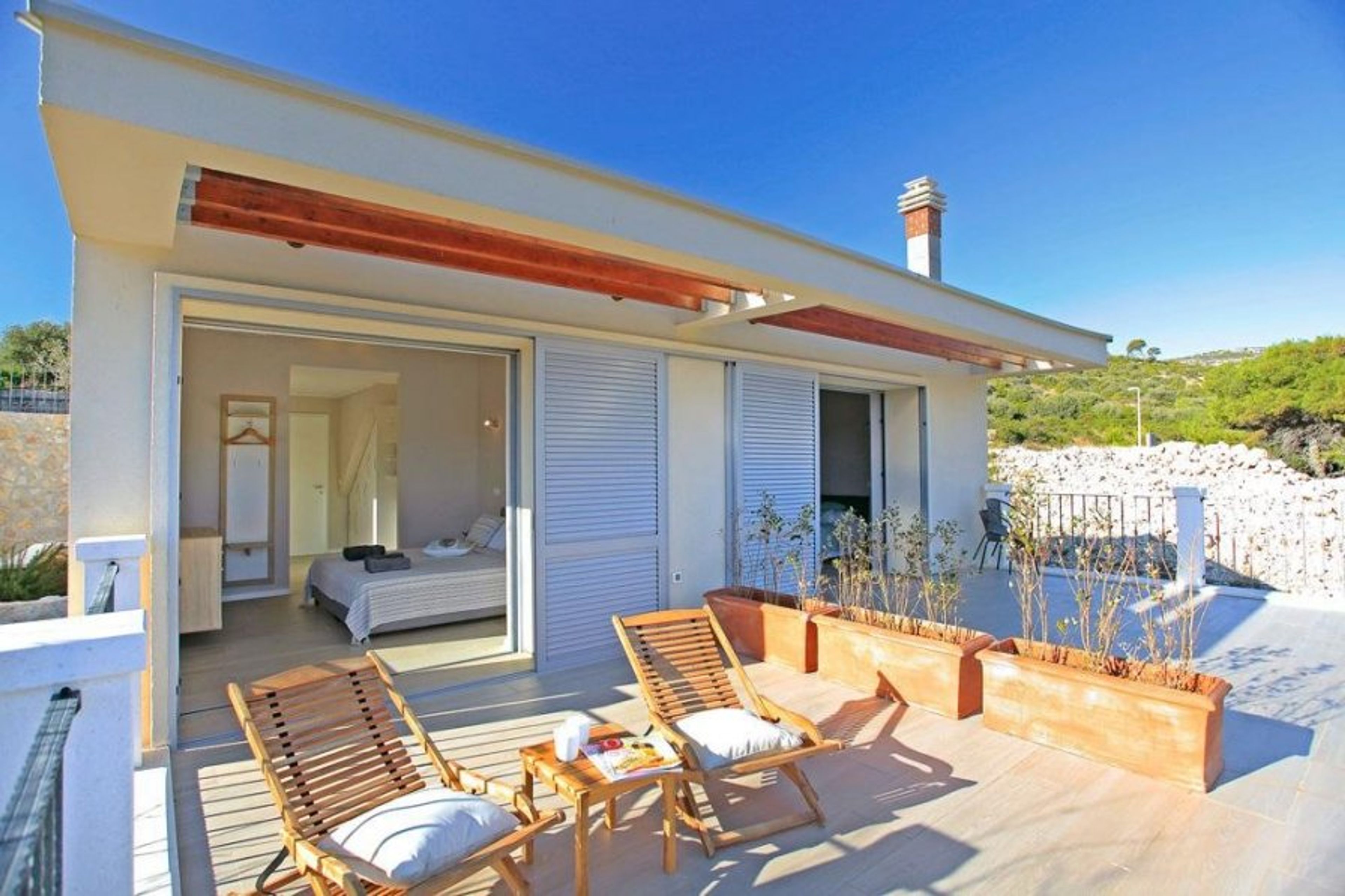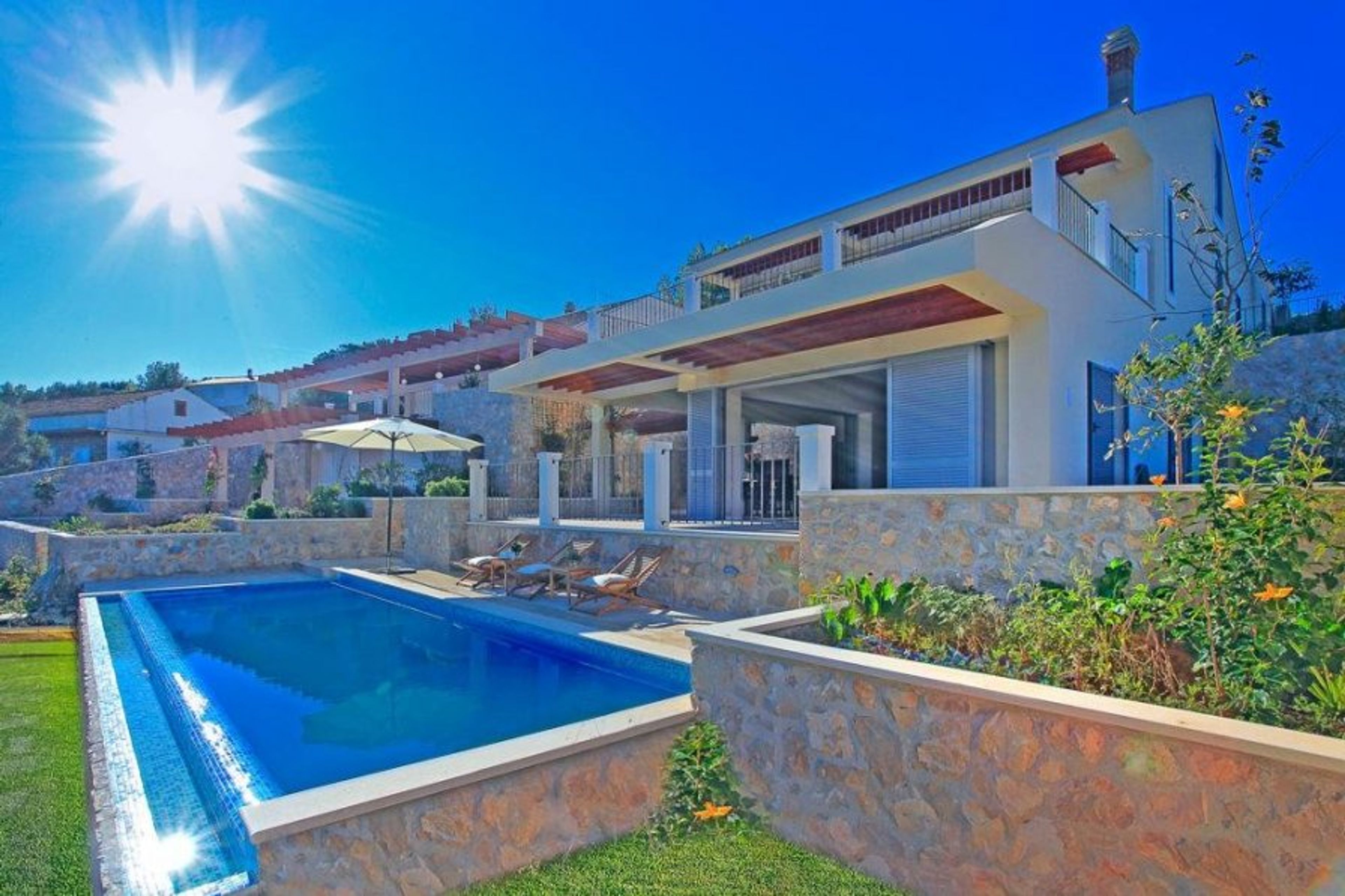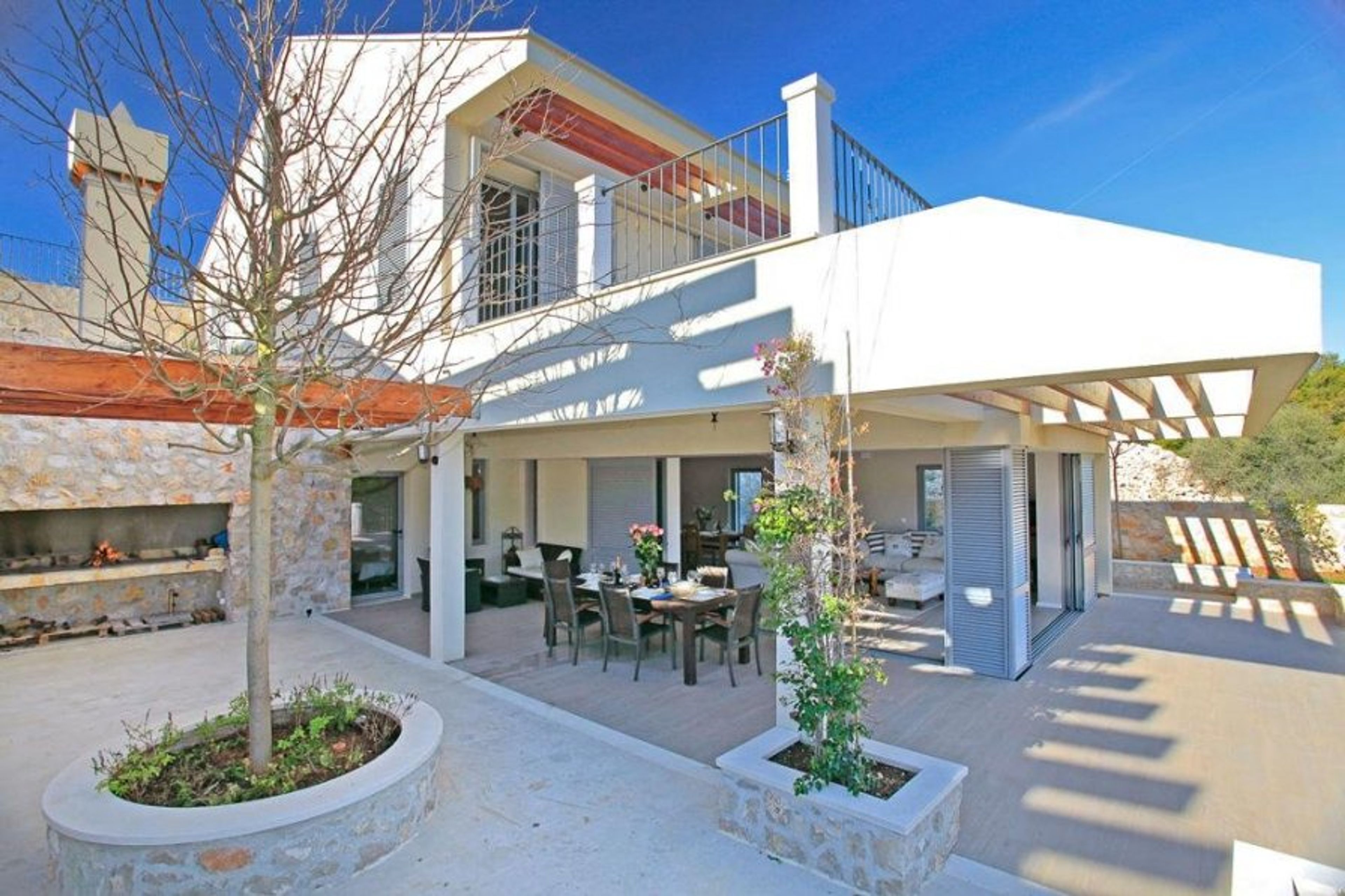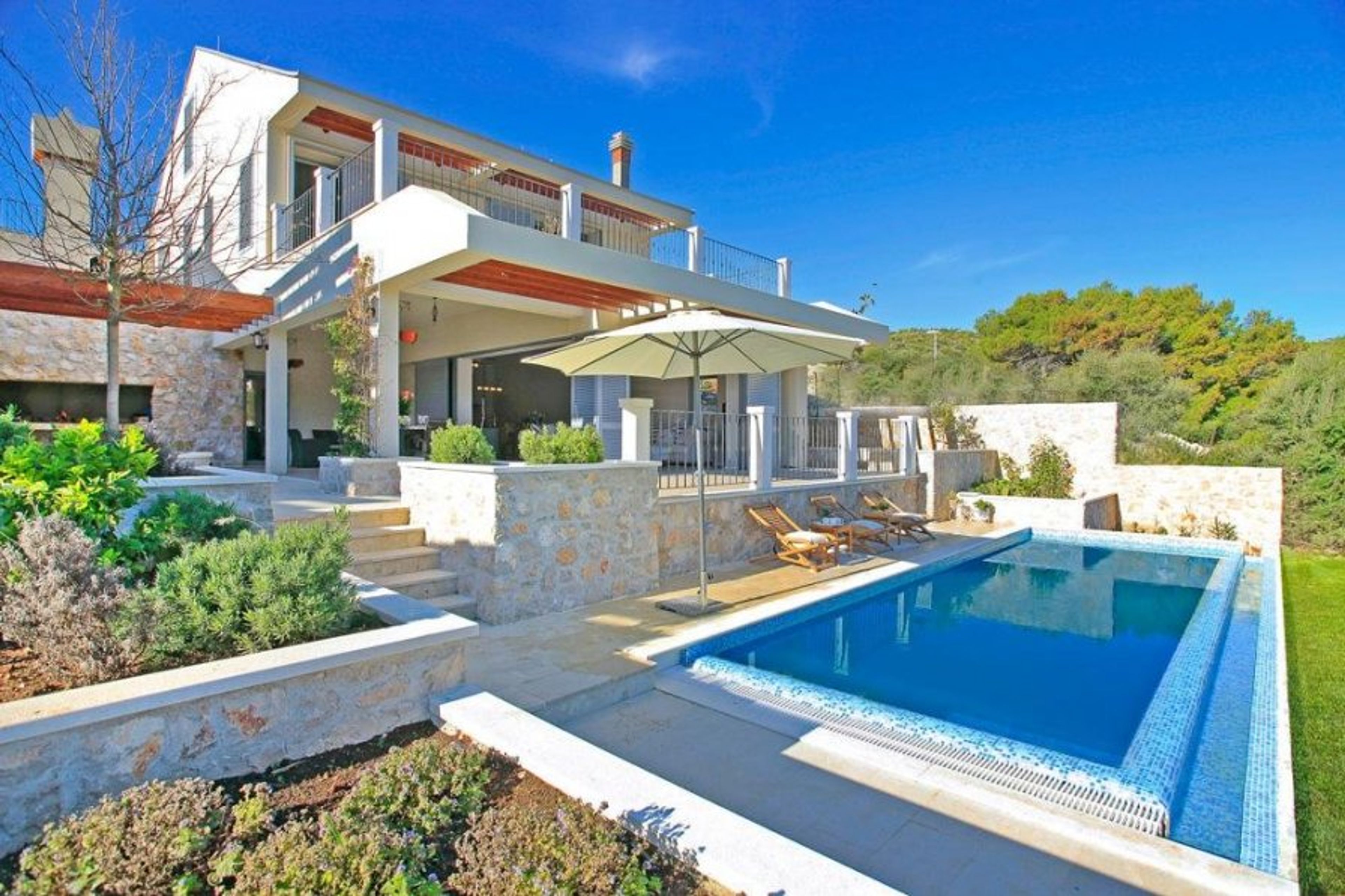 This modernistic villa offers: on the ground floor an open-plan living and a spacious dining area, a fully equipped kitchen which makes cooking indoors for 8 people fun, as well as a beautiful bedroom with a double bed and an en-suite bathroom; on the first floor, a living area made for spending some quality time together and relaxing, 2 great double bed bedrooms with 2 en-suite bathrooms and access to the upper terrace from which you can fully enjoy the breathtaking view; on the second floor a double bed bedroom with an en-suite bathroom and an individual bathroom as well.