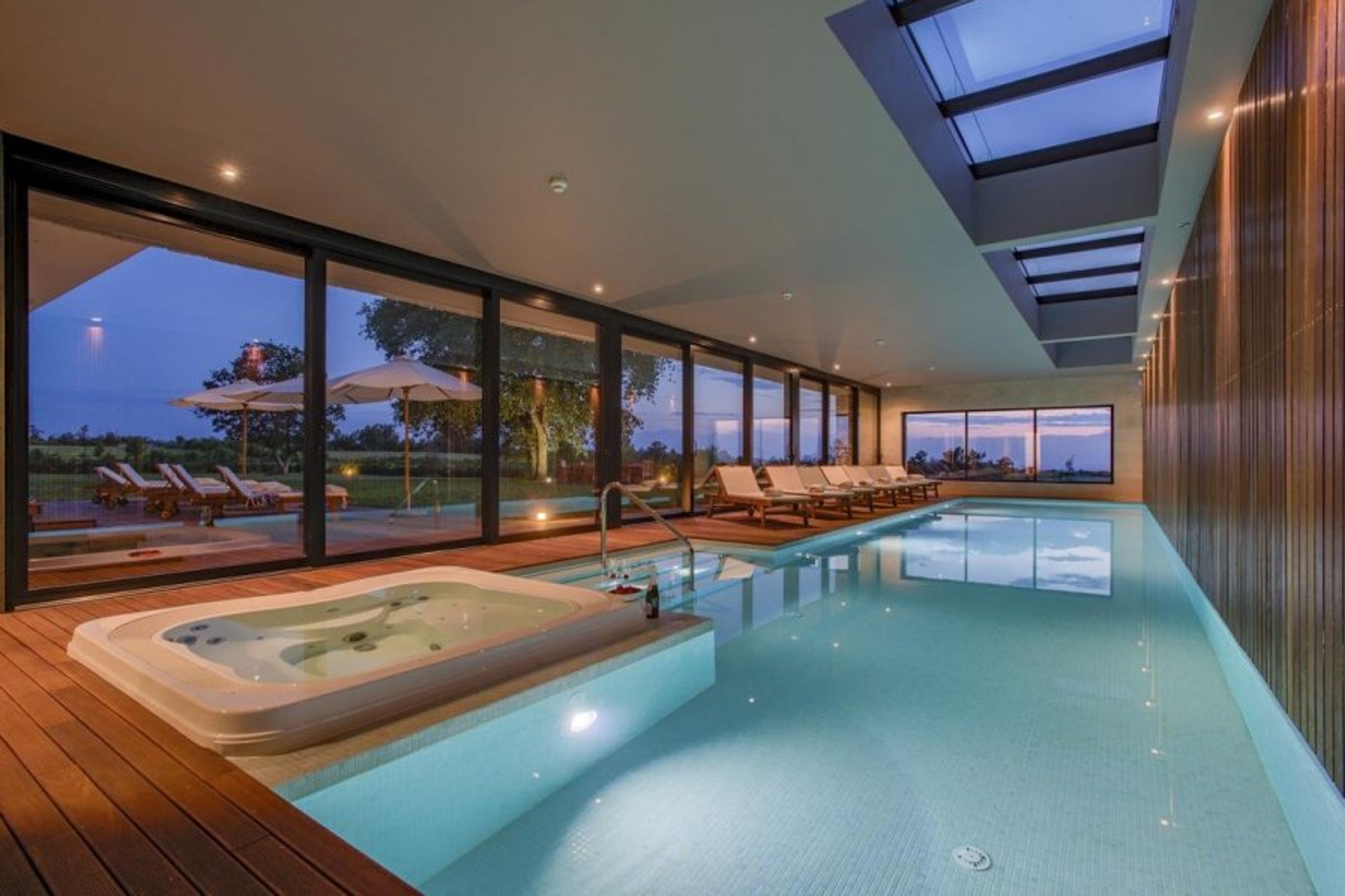 Inside is an open-plan dining and living room, great for spending some quality time with close ones, fully equipped with all the commodities needed for cooking tasteful meals, 4 modernly designed double bed bedrooms which all include en-suite shower rooms and individual balconies, a family bathroom, a well-equipped gym for those in love with exercise, a private sauna for pure relaxation, an indoor swimming pool ideal, a hot tub which takes the relaxation to another level and a roof-top sun terrace.