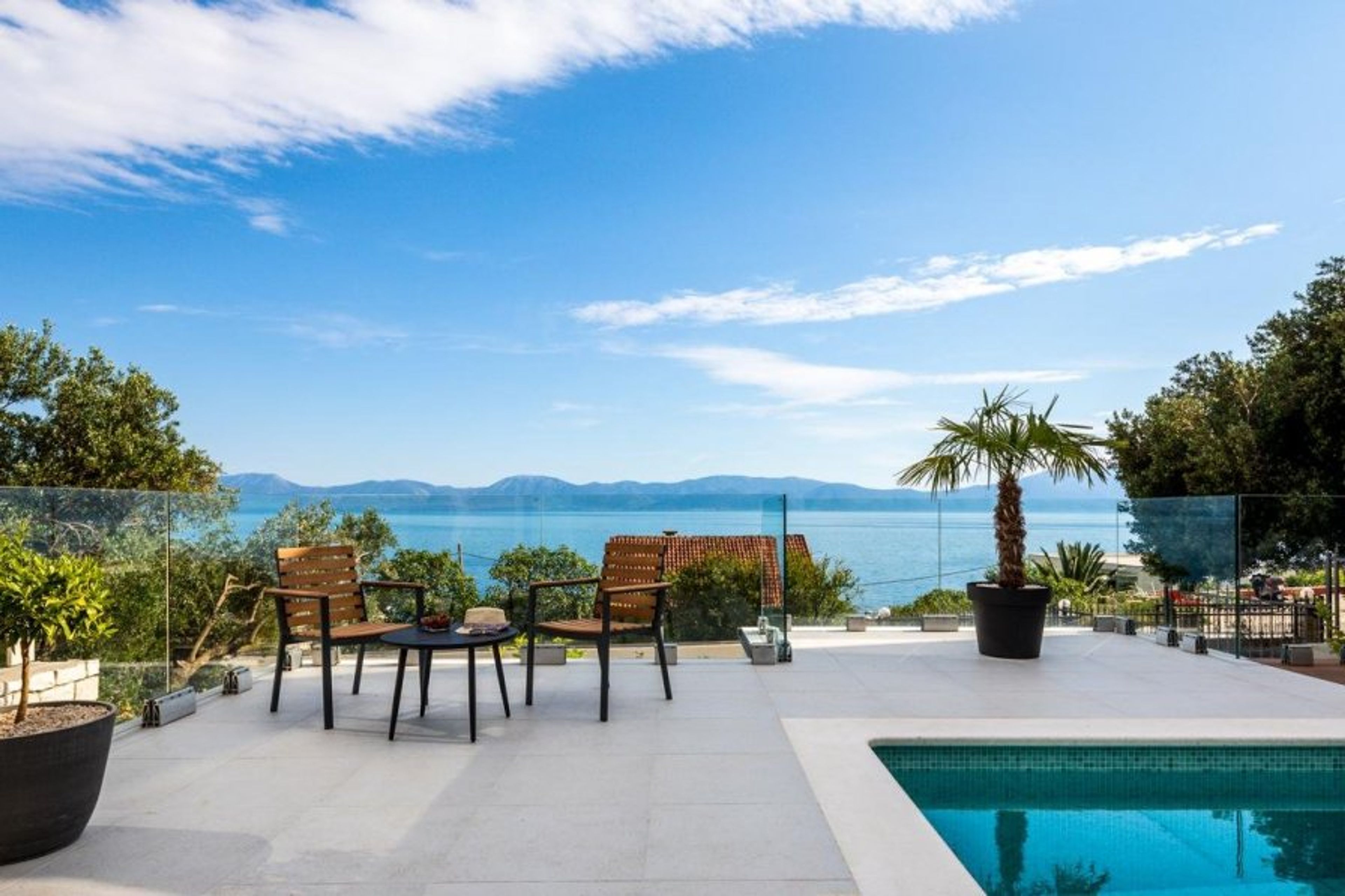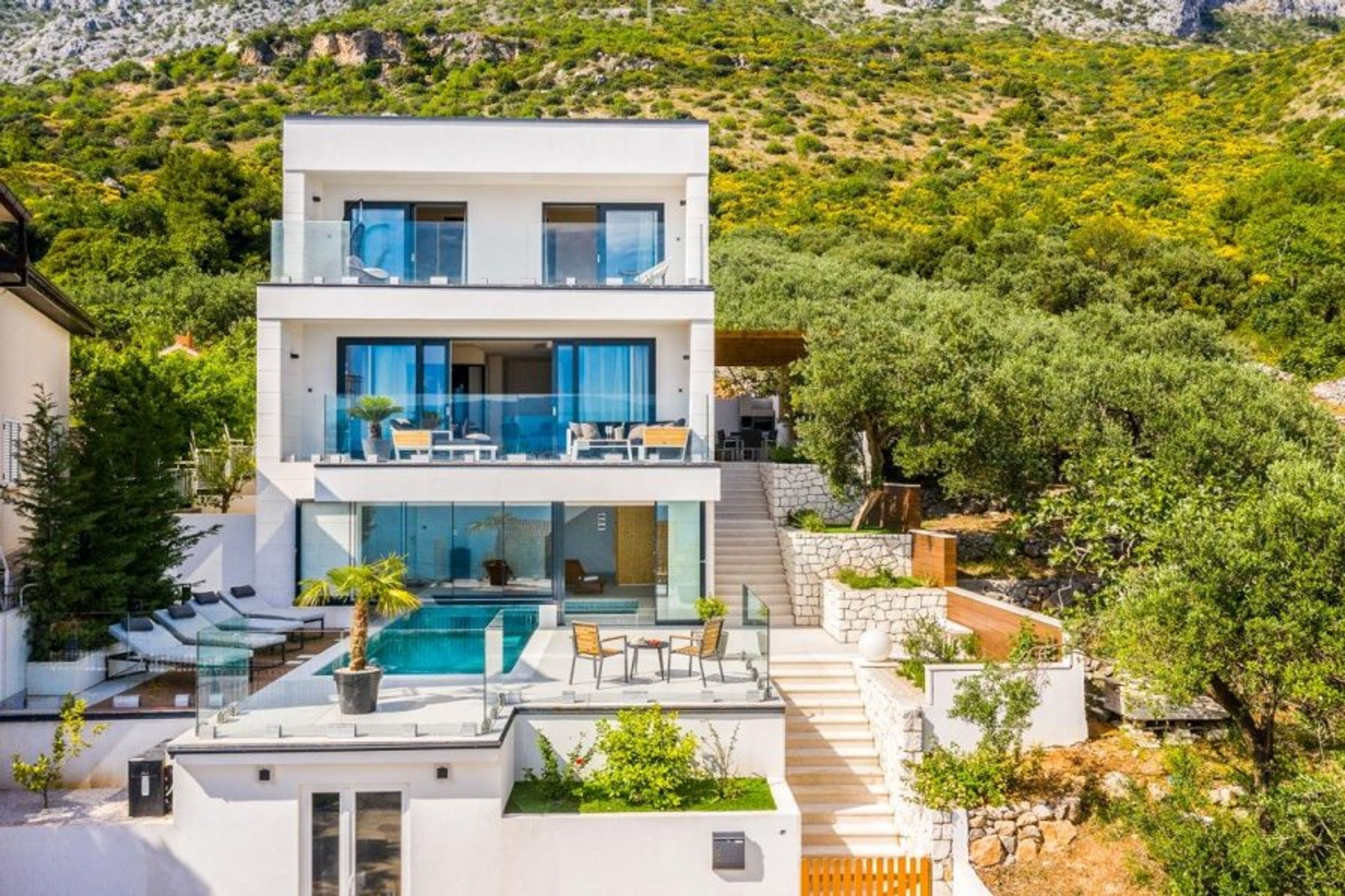 The villa enjoys breathtaking sea and sunset views from its hillside location in Podaca, nestled beneath the majestic Biokovo Mountains.