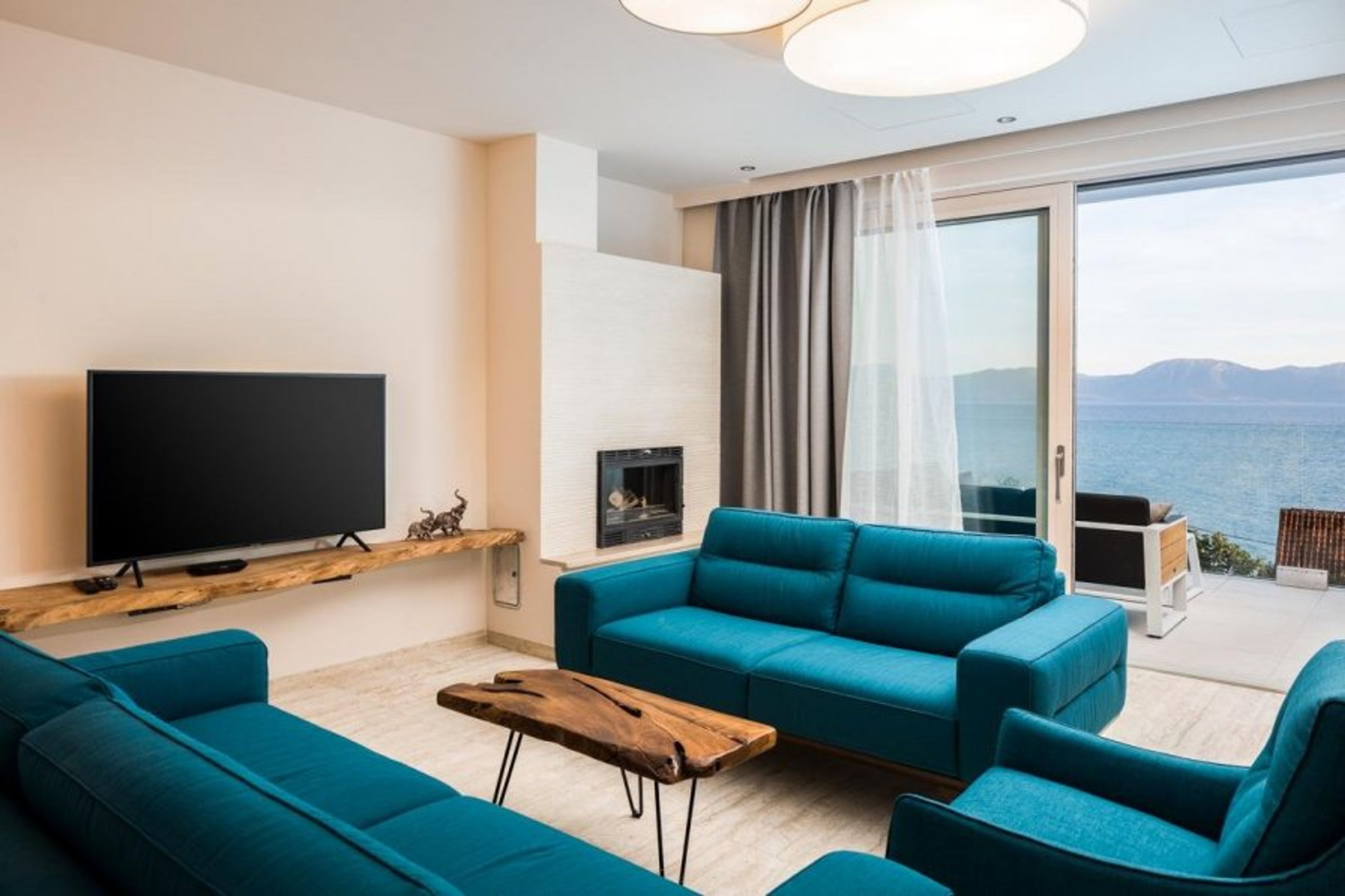 The living area, which has a large television and a modern fire for cooler evenings, also has views.