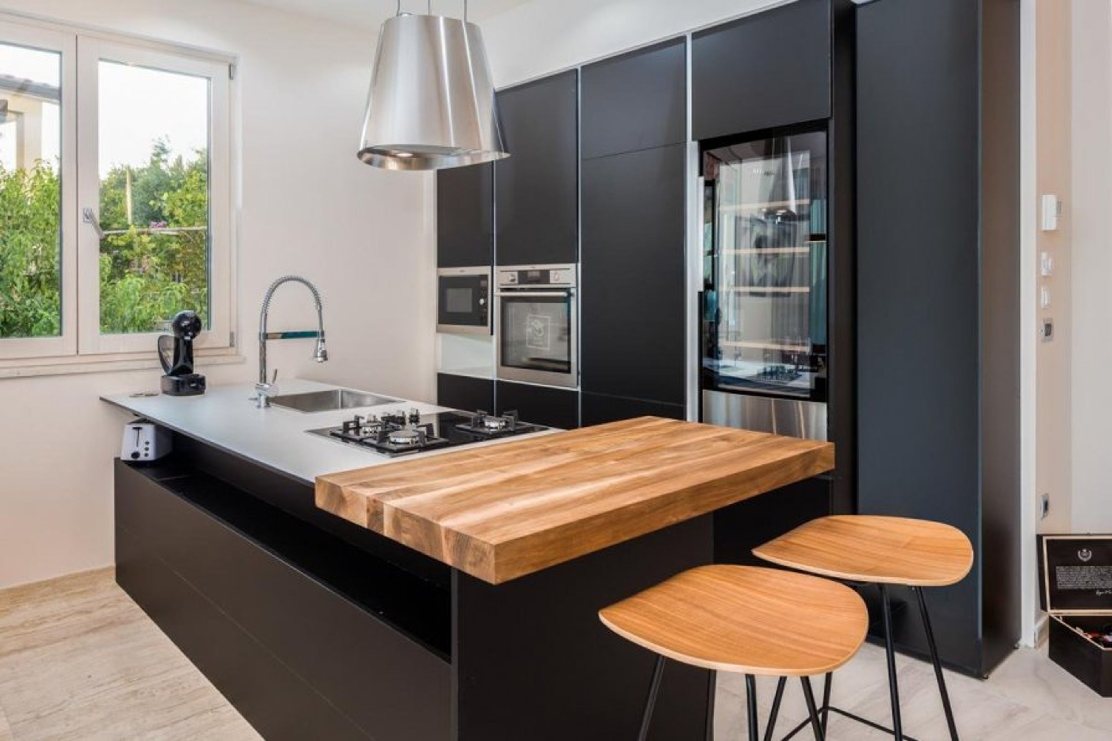A modern, dark-colored kitchen with top-of-the-line appliances and a sociable breakfast bar with stools sits at the back. In front of this is a very cool dining table and chairs where you can enjoy delectable feasts while taking in the breathtaking sea views.