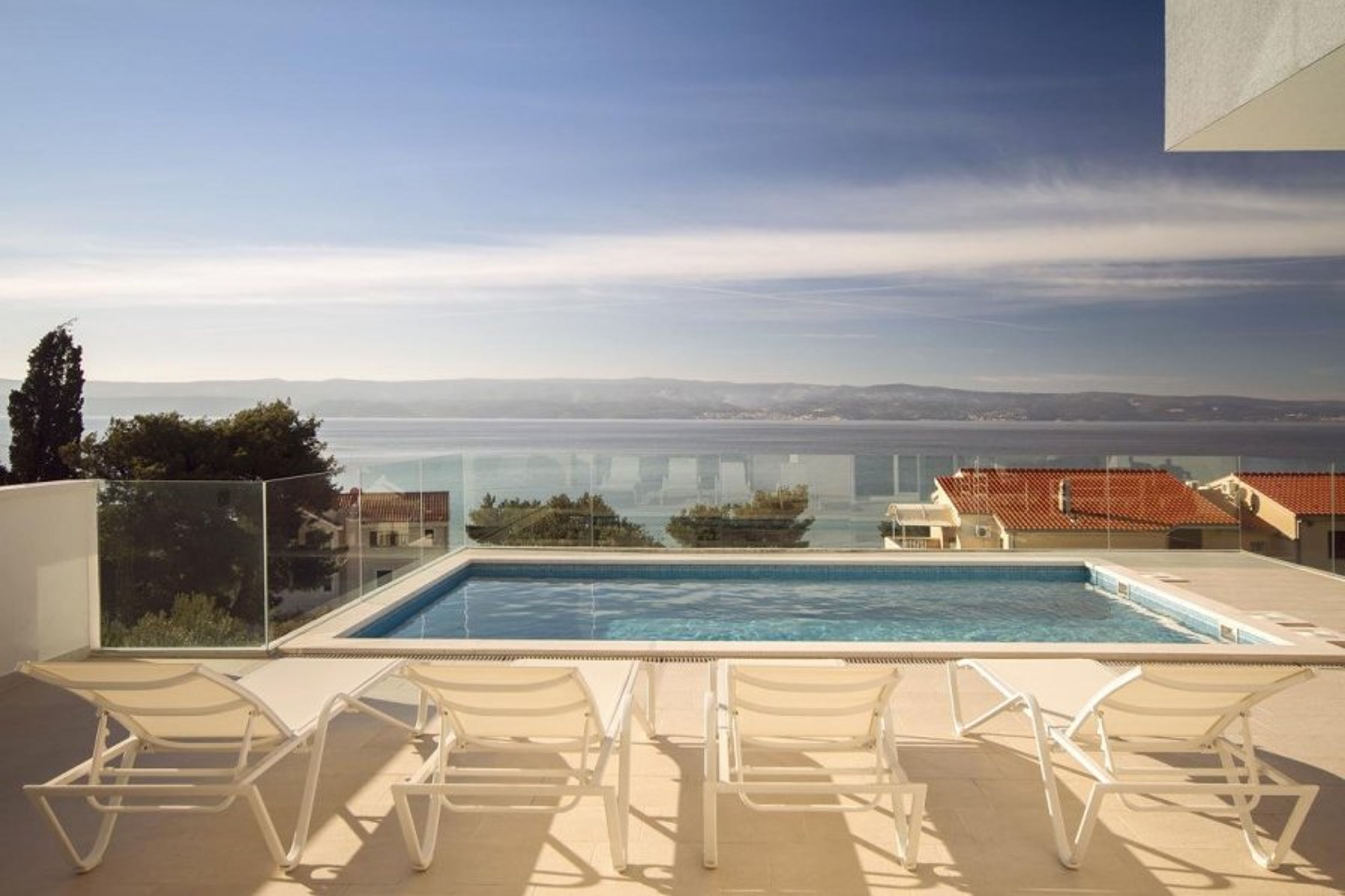 From there you will see a large private swimming pool with Roman steps access, discreetly hidden to ensure your privacy as you enjoy the sunlight and the view of the Adriatic sea.