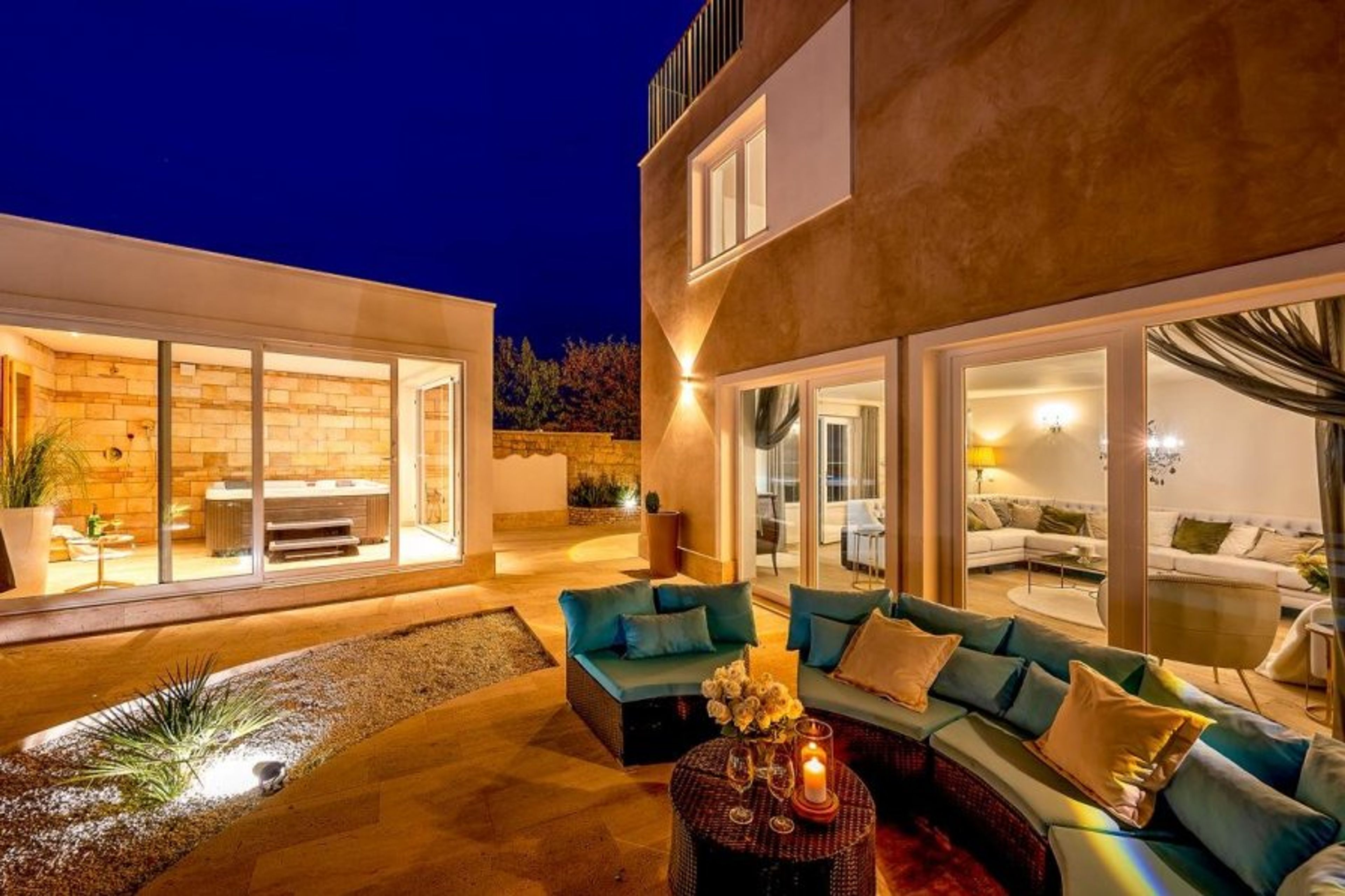 The terrace can be accessed via the garden or through the seating area floor to ceiling sliding doors. Immediately outside the windows is a pale blue curved soft seating area, a great place for morning coffee or sun set cocktails.