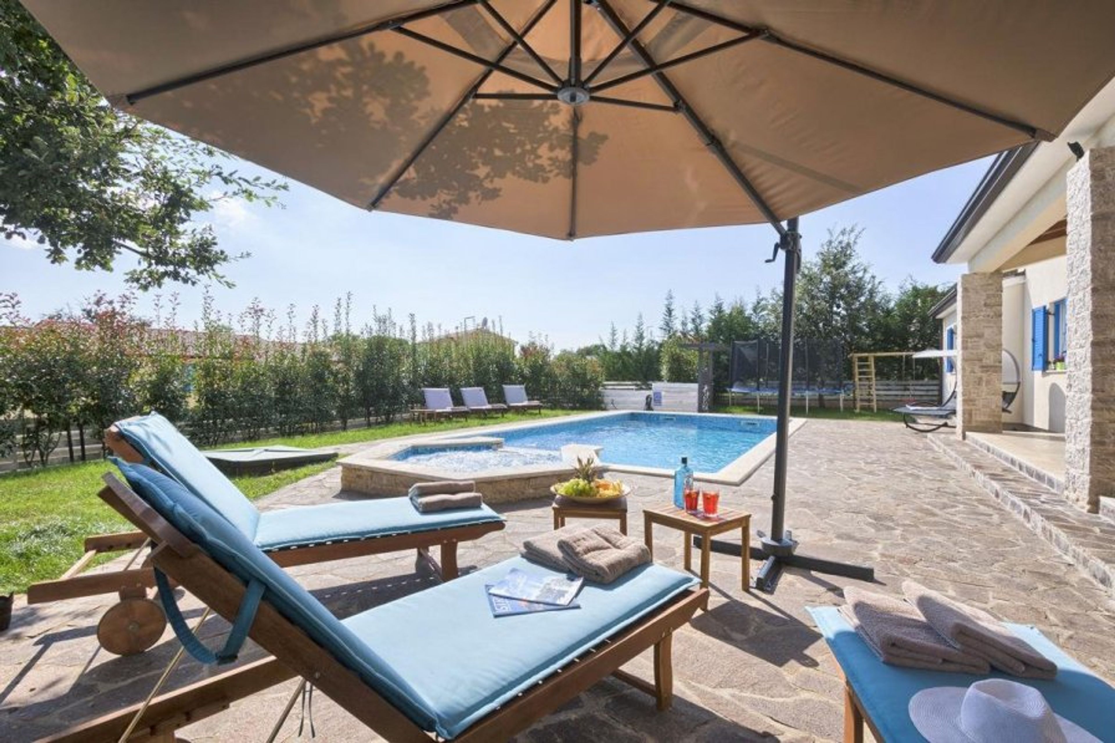 As you step outside, you will see the amazing large swimming pool, with sun loungers and parasols spread around it.