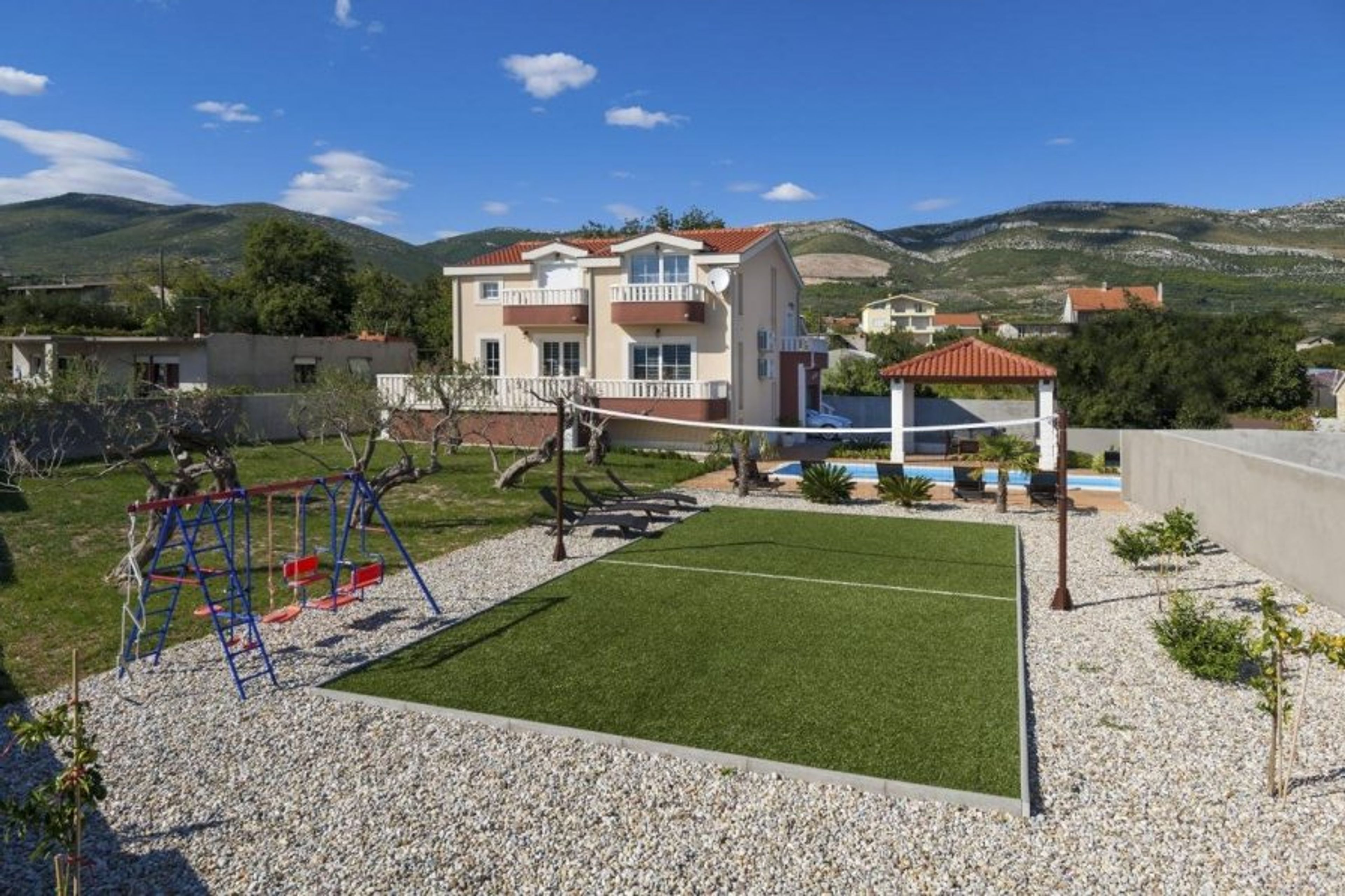 The exterior features a swimming pool, garden, covered dining area with BBQ, children`s playground, parking space and a tennis court.