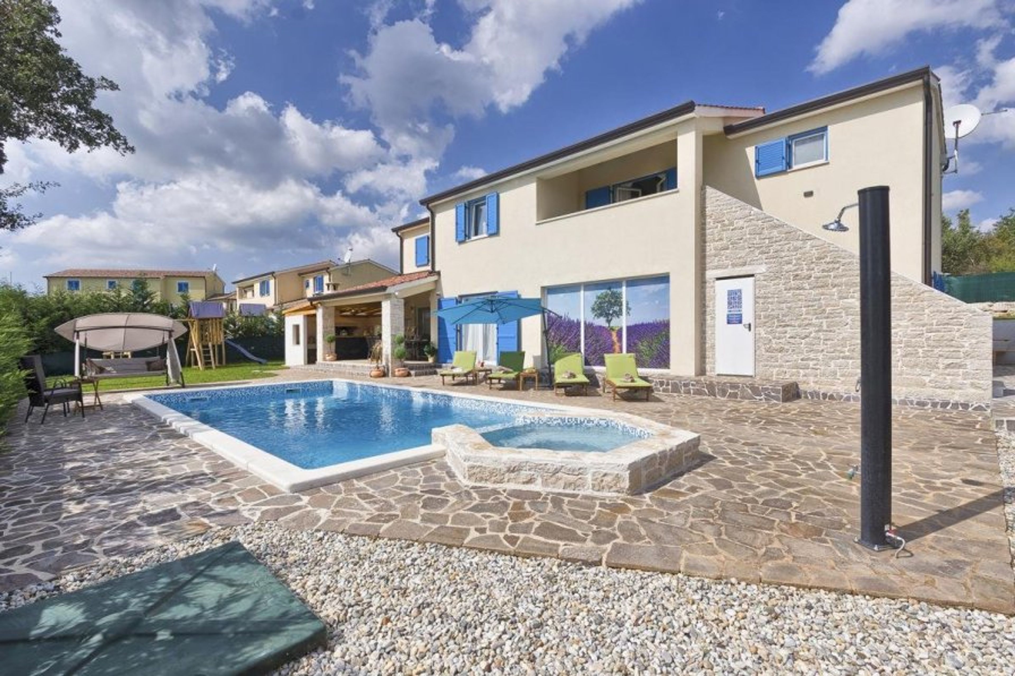 The exterior features a swimming pool, sun loungers & parasols, outdoor lounge & dining area, large patio & garden area, covered terrace, playground, private parking, outdoor shower, and a BBQ area.