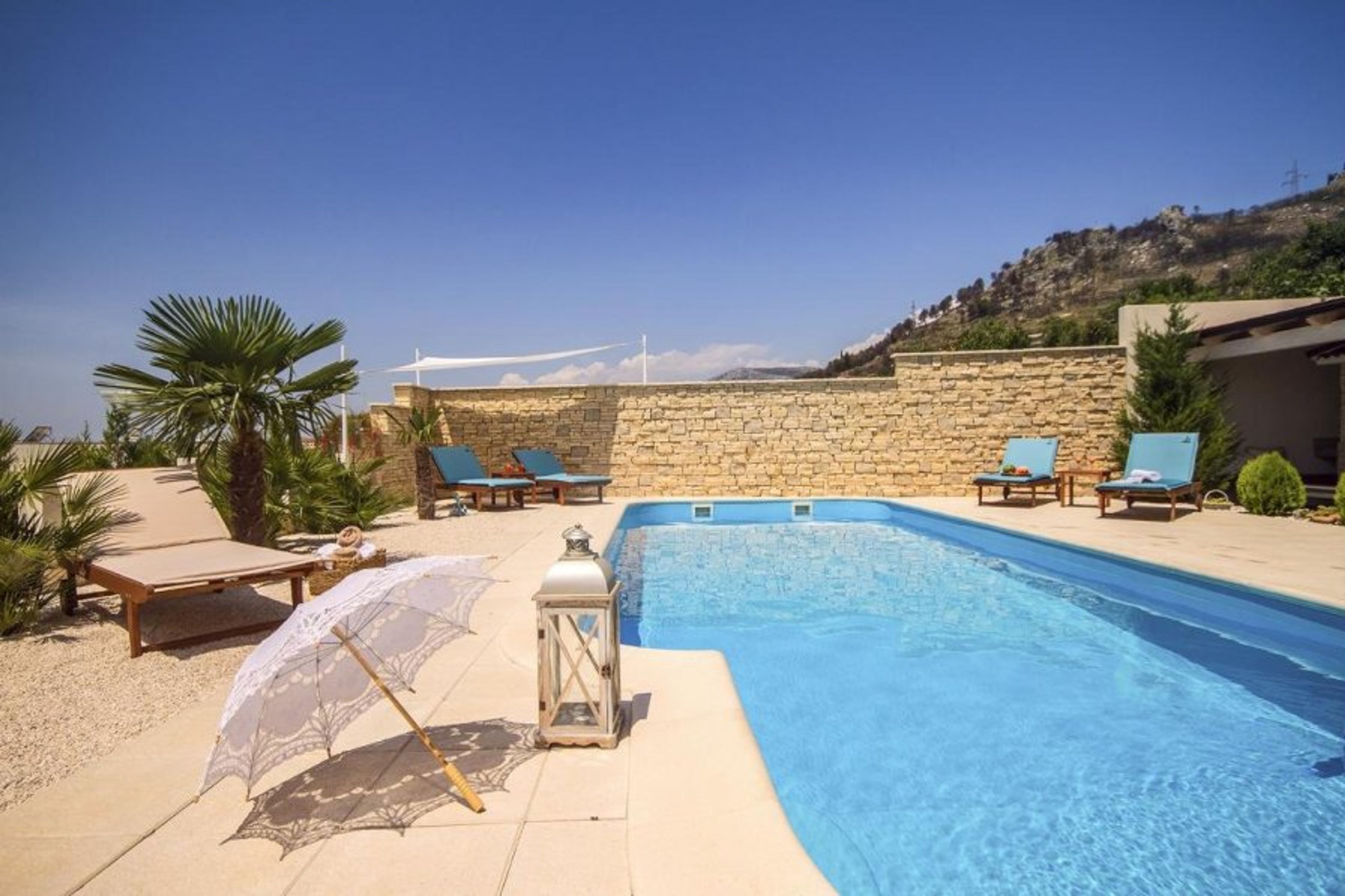 The beautiful holiday home has a grandiose pool on the outside with comfortable sun loungers dotted all around.