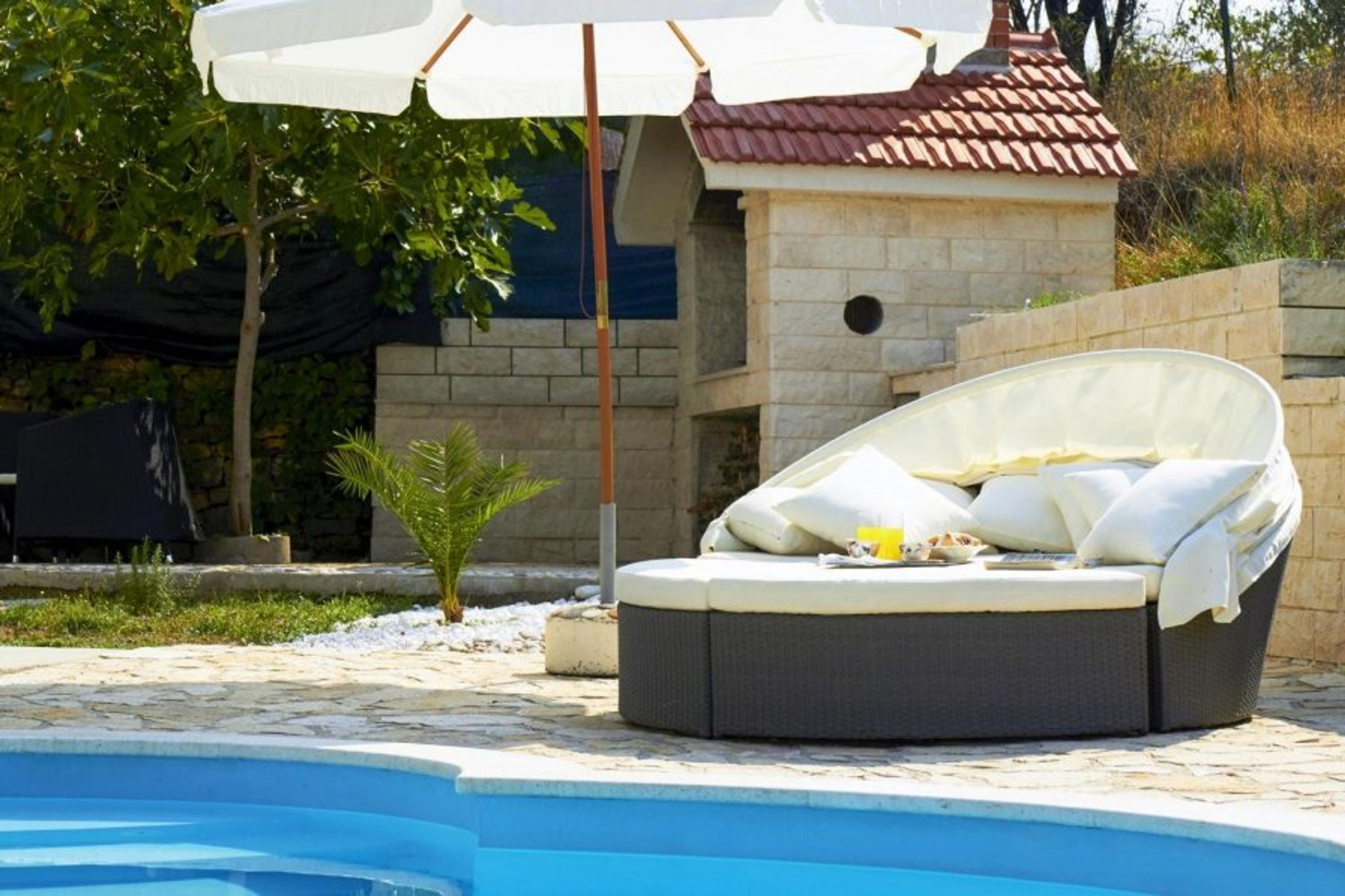 The exterior has a private swimming pool, outdoor shower, terrace, lawned area, sun loungers, covered