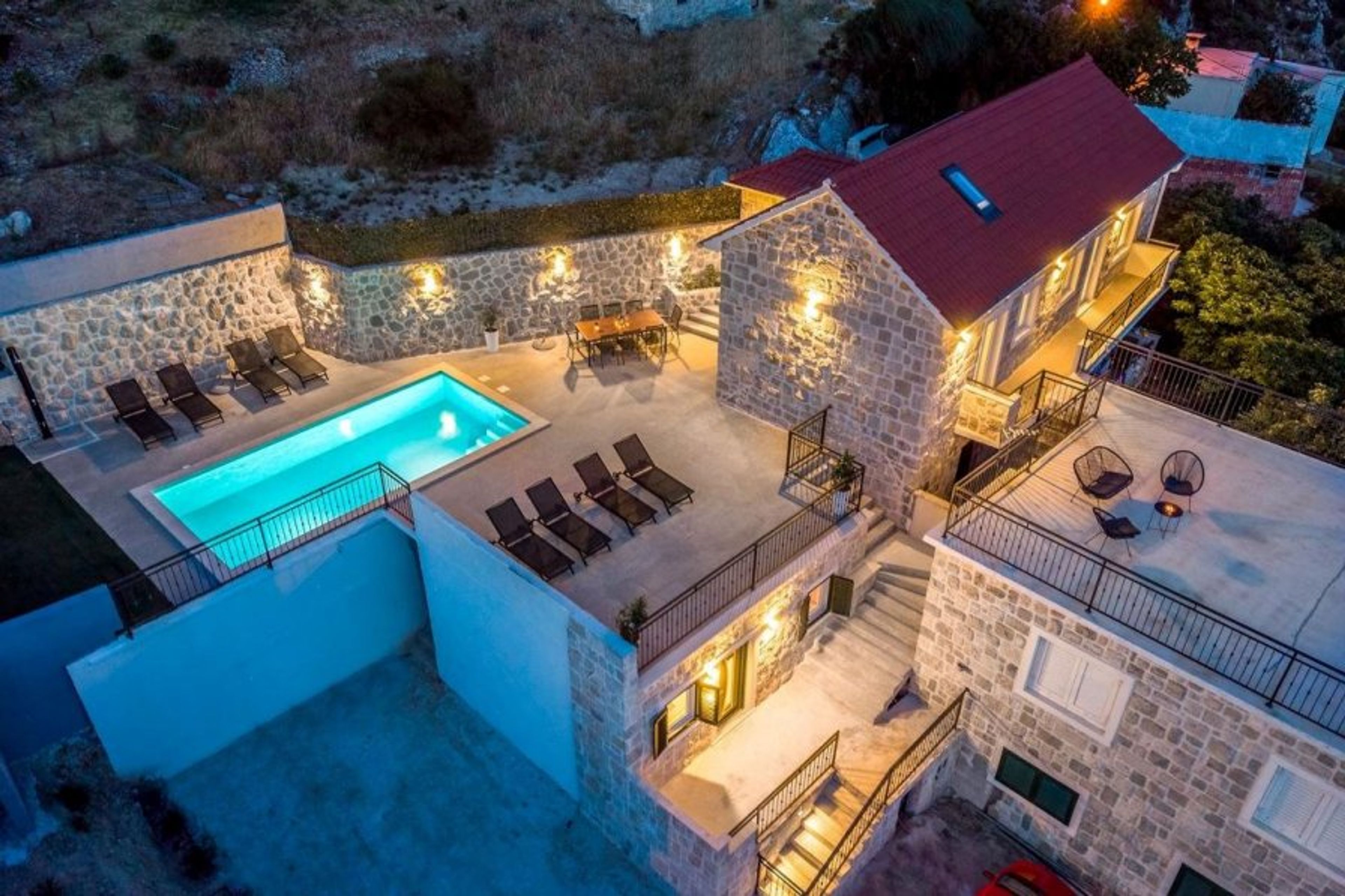 From the villa's fantastic elevated position, guests may enjoy breathtaking views of Omis, its neighboring islands, the shimmering turquoise sea, and the Omiska Dinara hills.